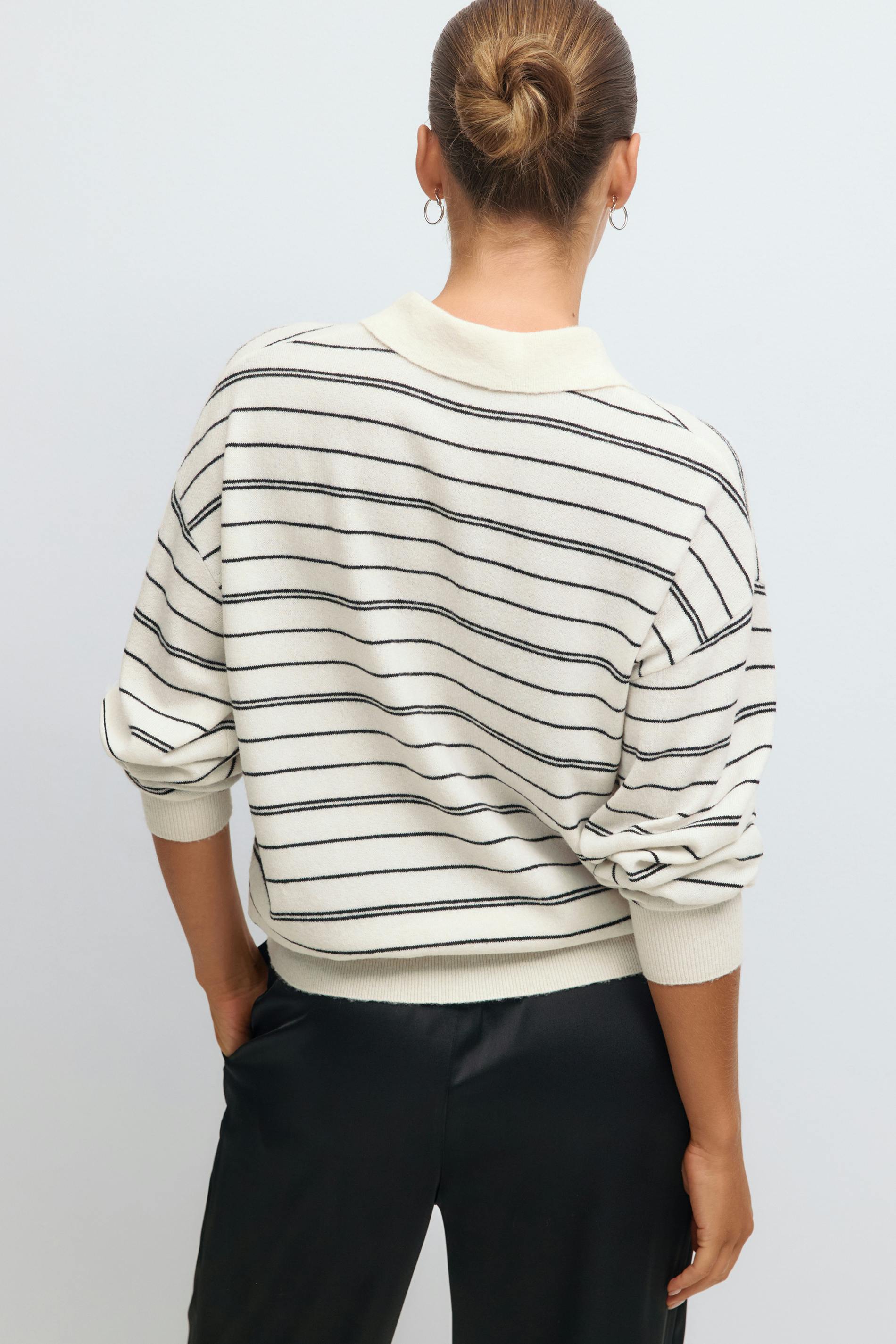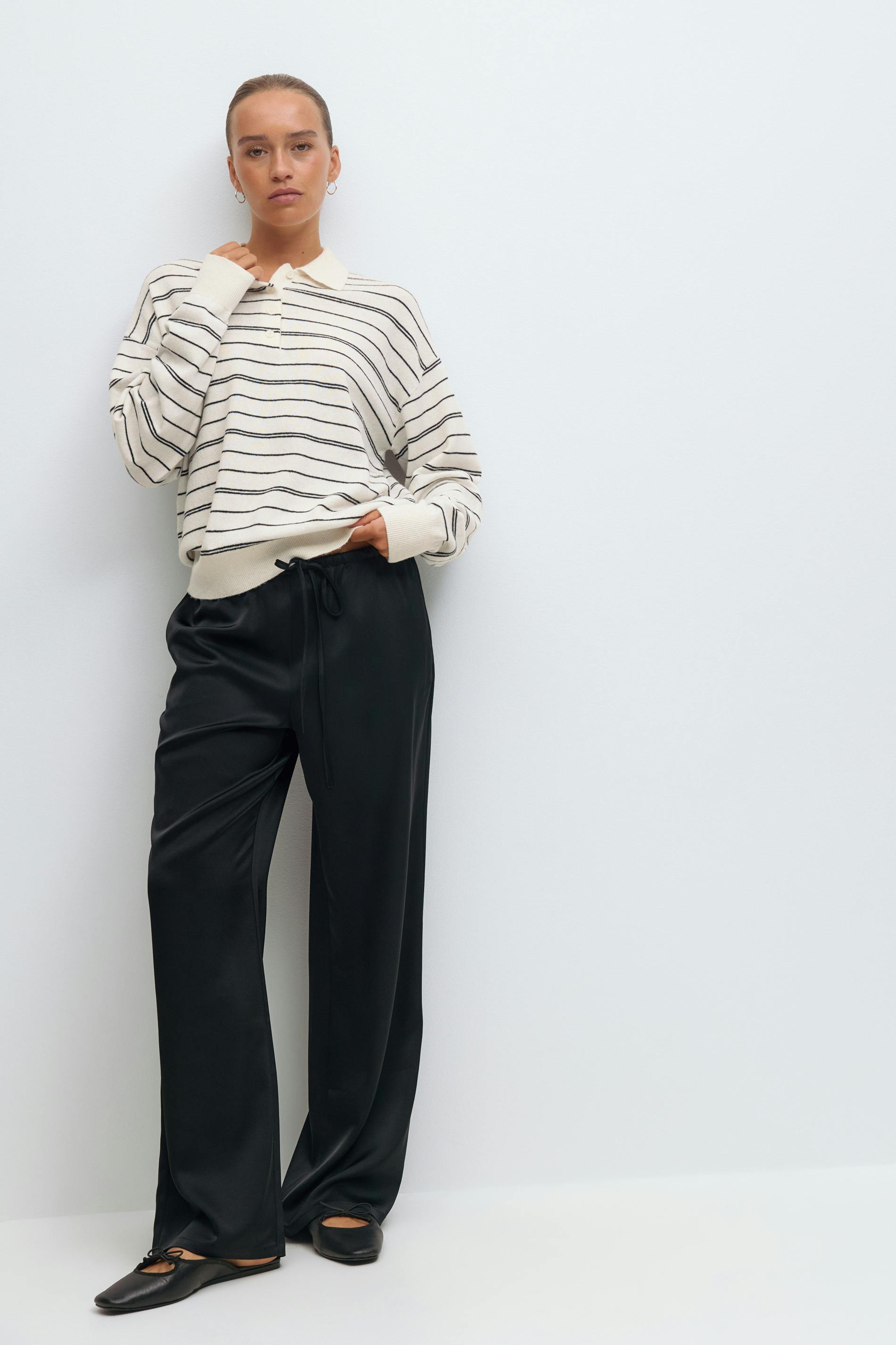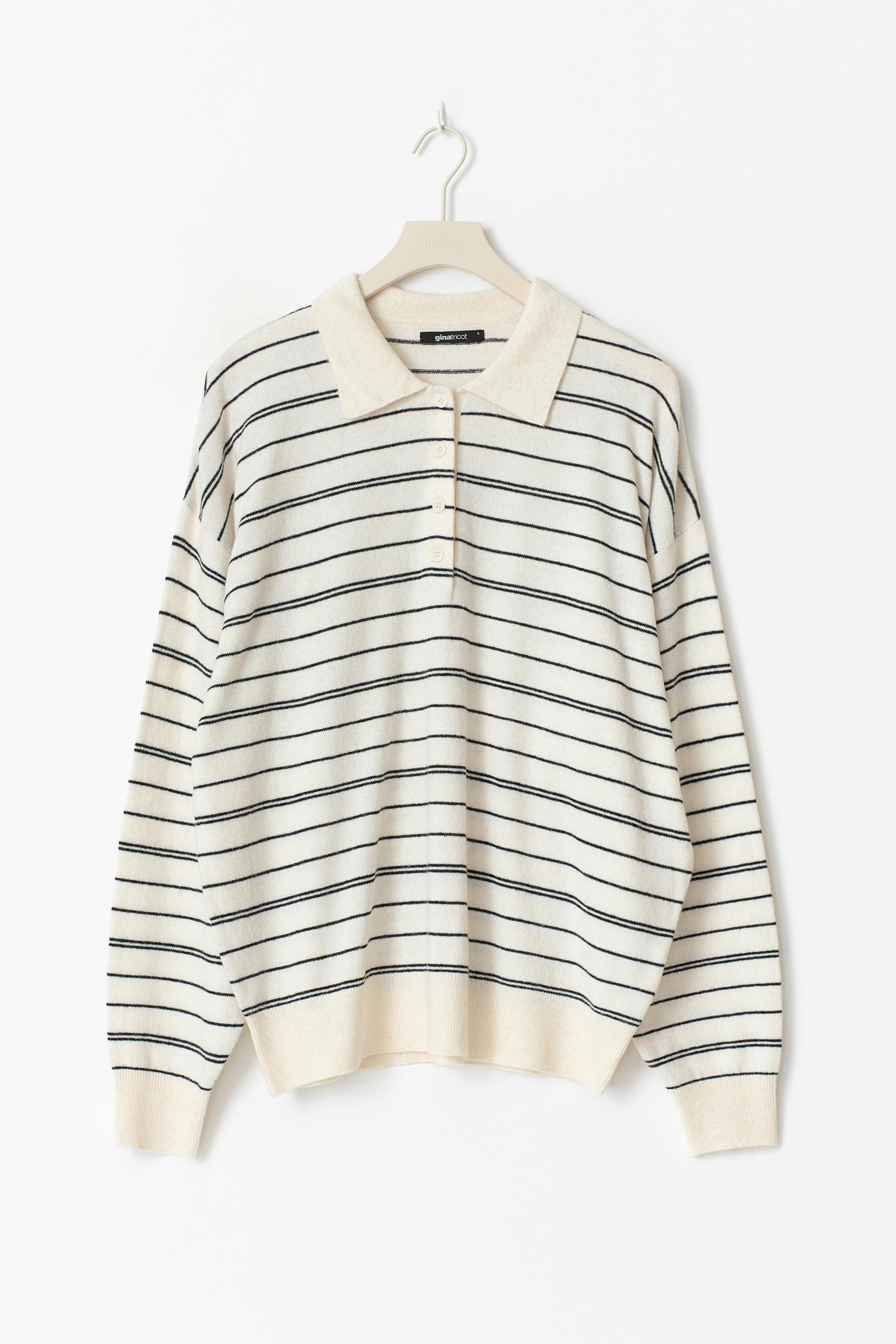 Randig pikétröja med krage. Pikétröjan är vit och har knappar upptill. Den har oversize fit, långa ärmar, finstickad kvalitet och ribbad mudd vid ärmslut och i nederkant.