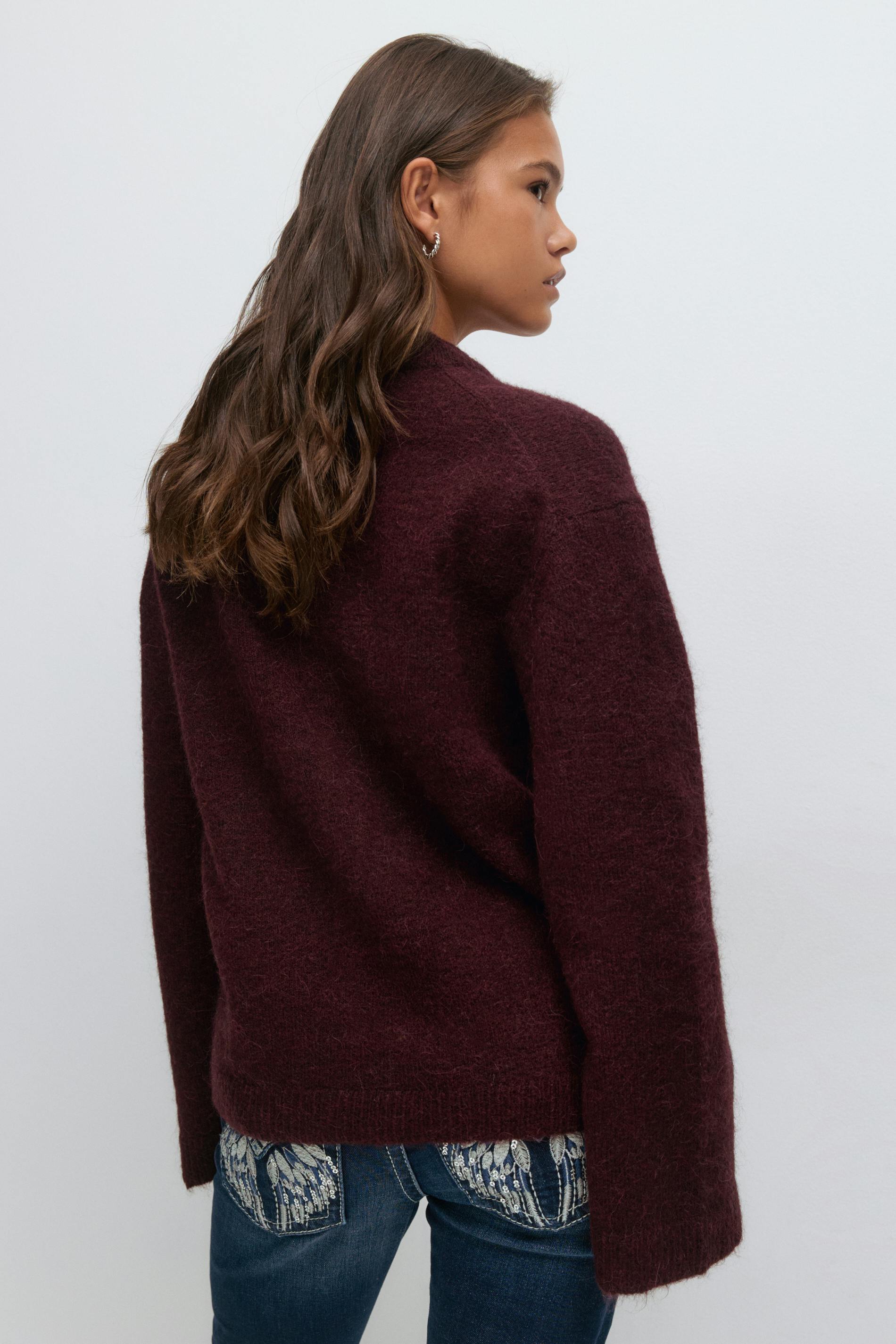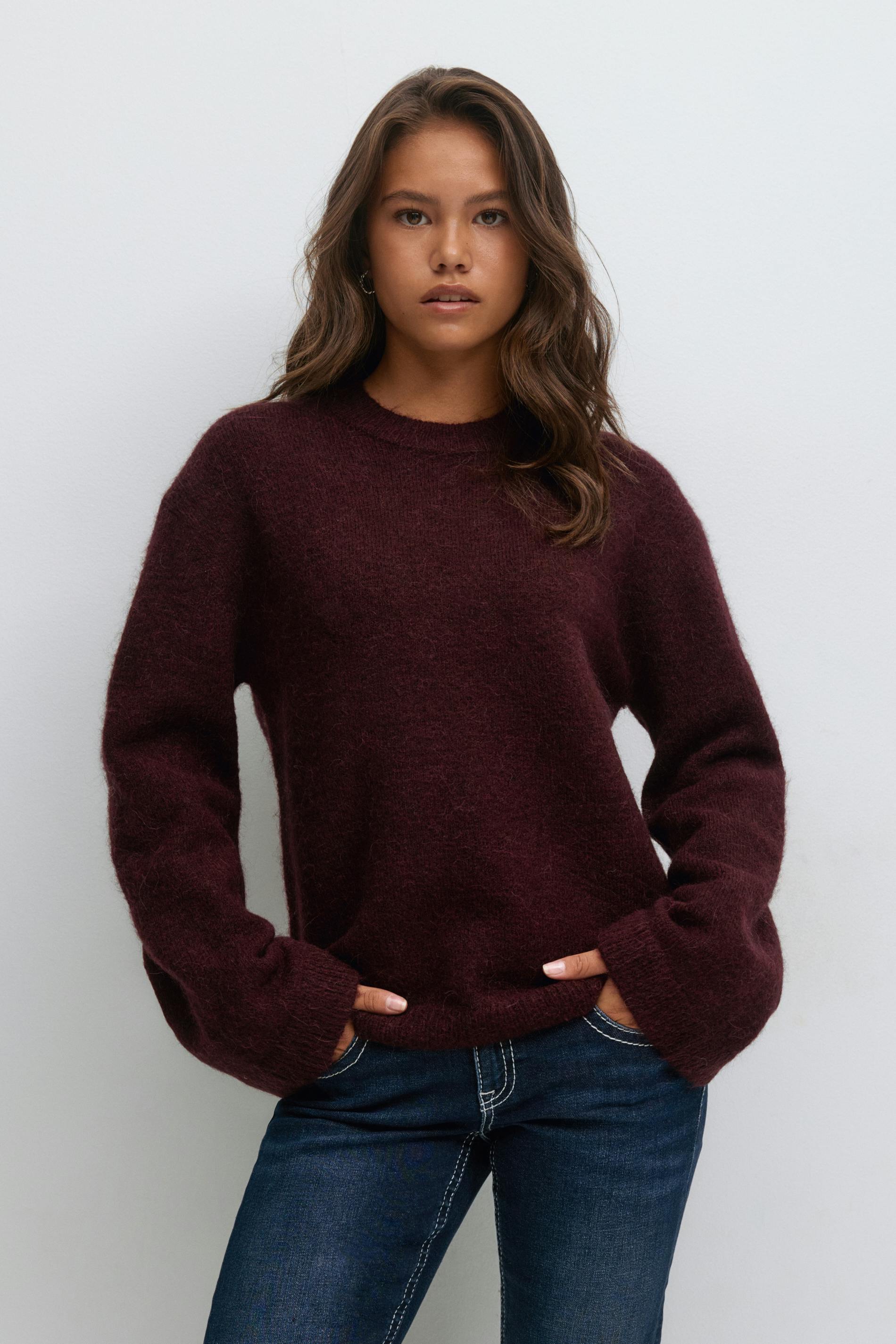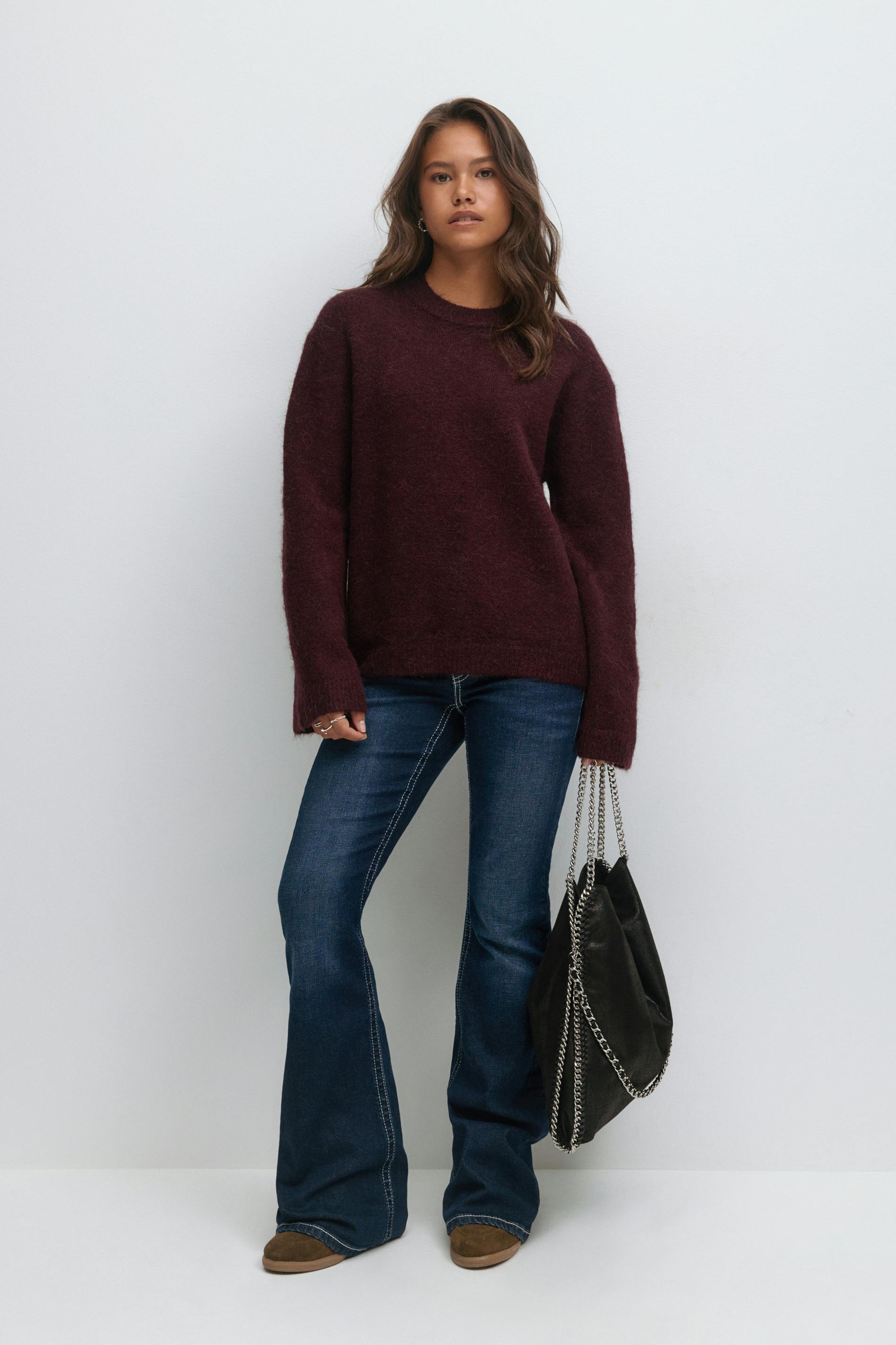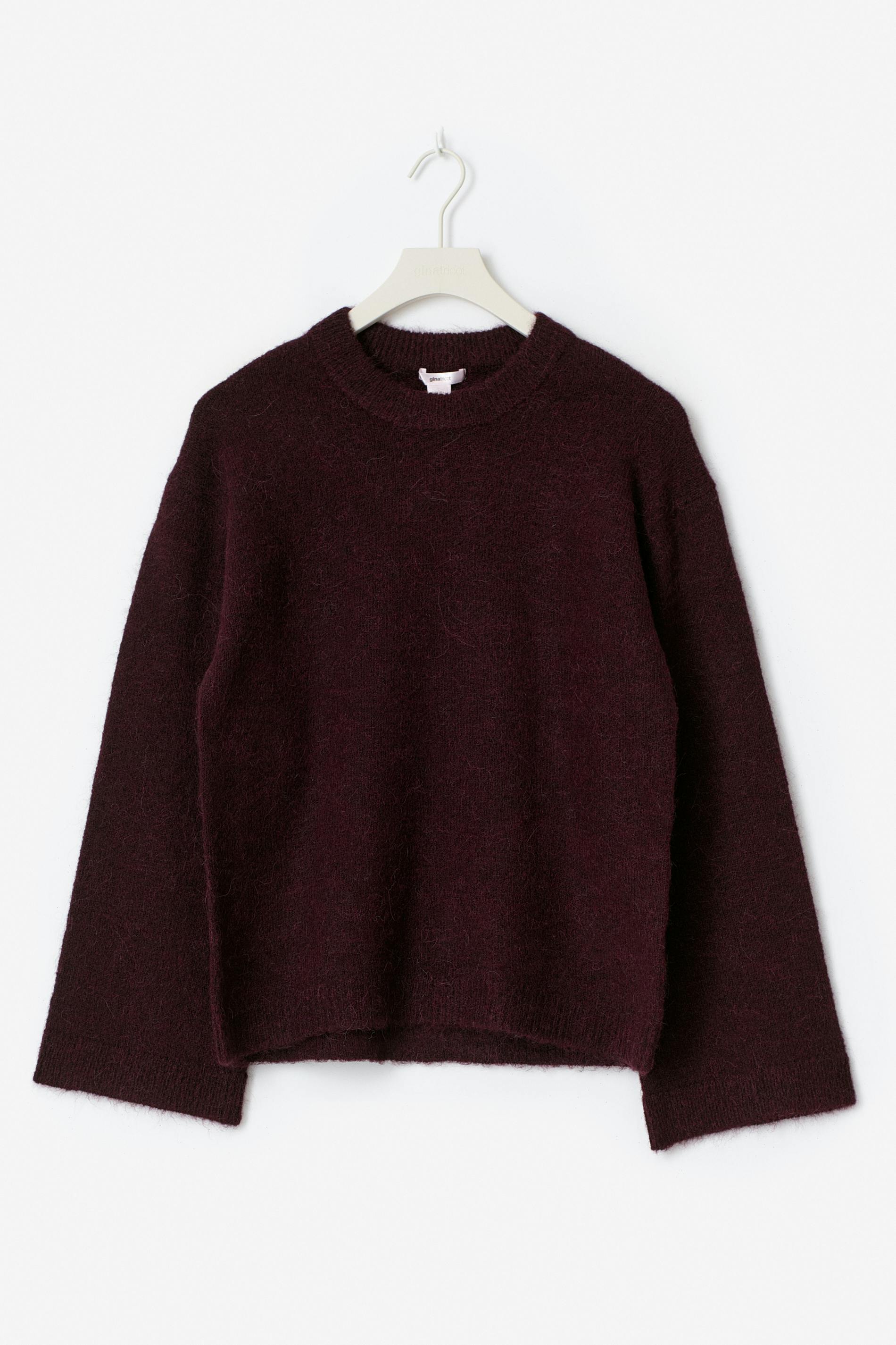 Stickad tröja med oversize fit. Tröjan är vinröd och har rund halsringning. Den har långa, raka ärmar, normallängd och ribbstickning vid ärmslut och i nederkant.