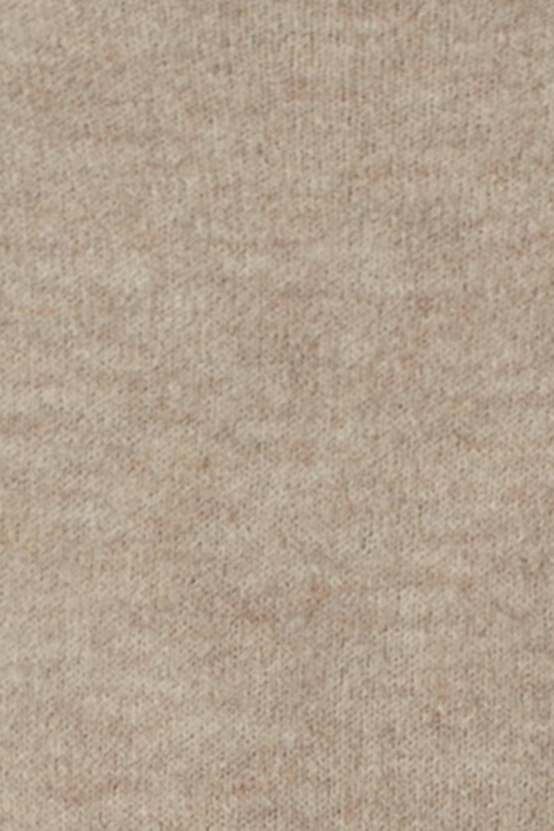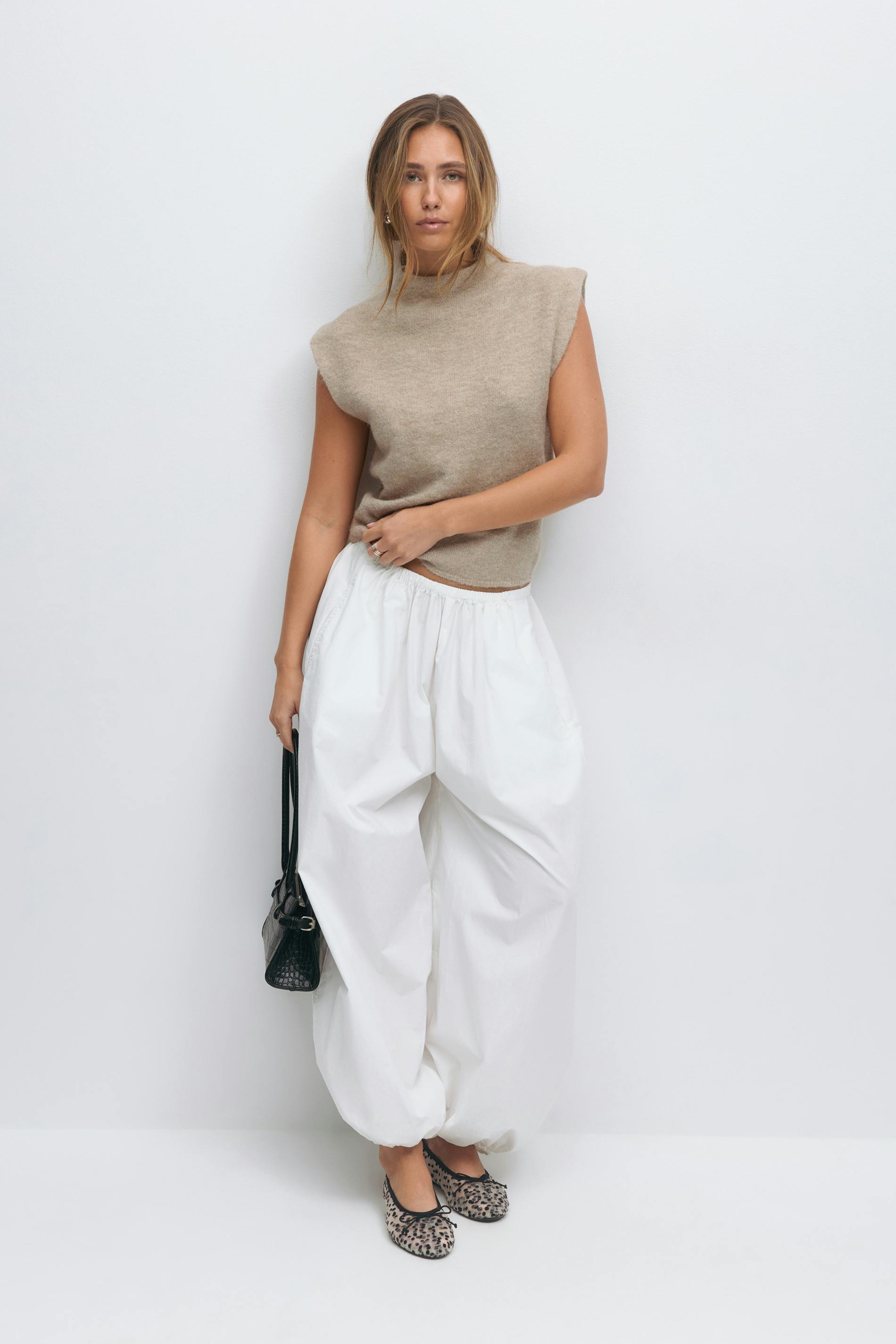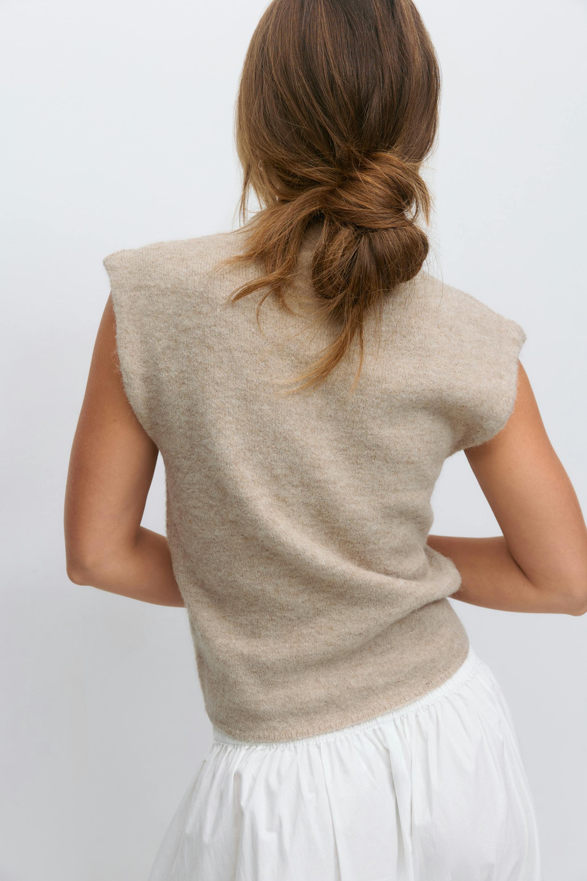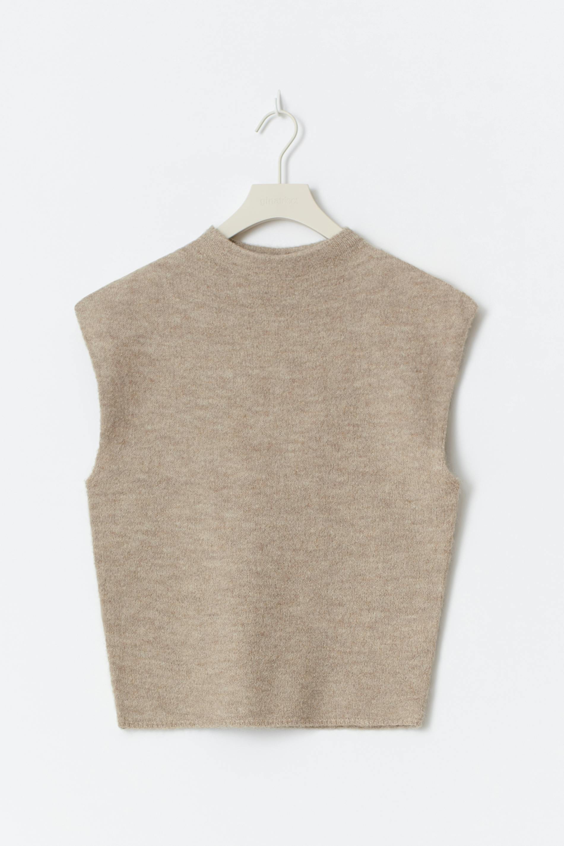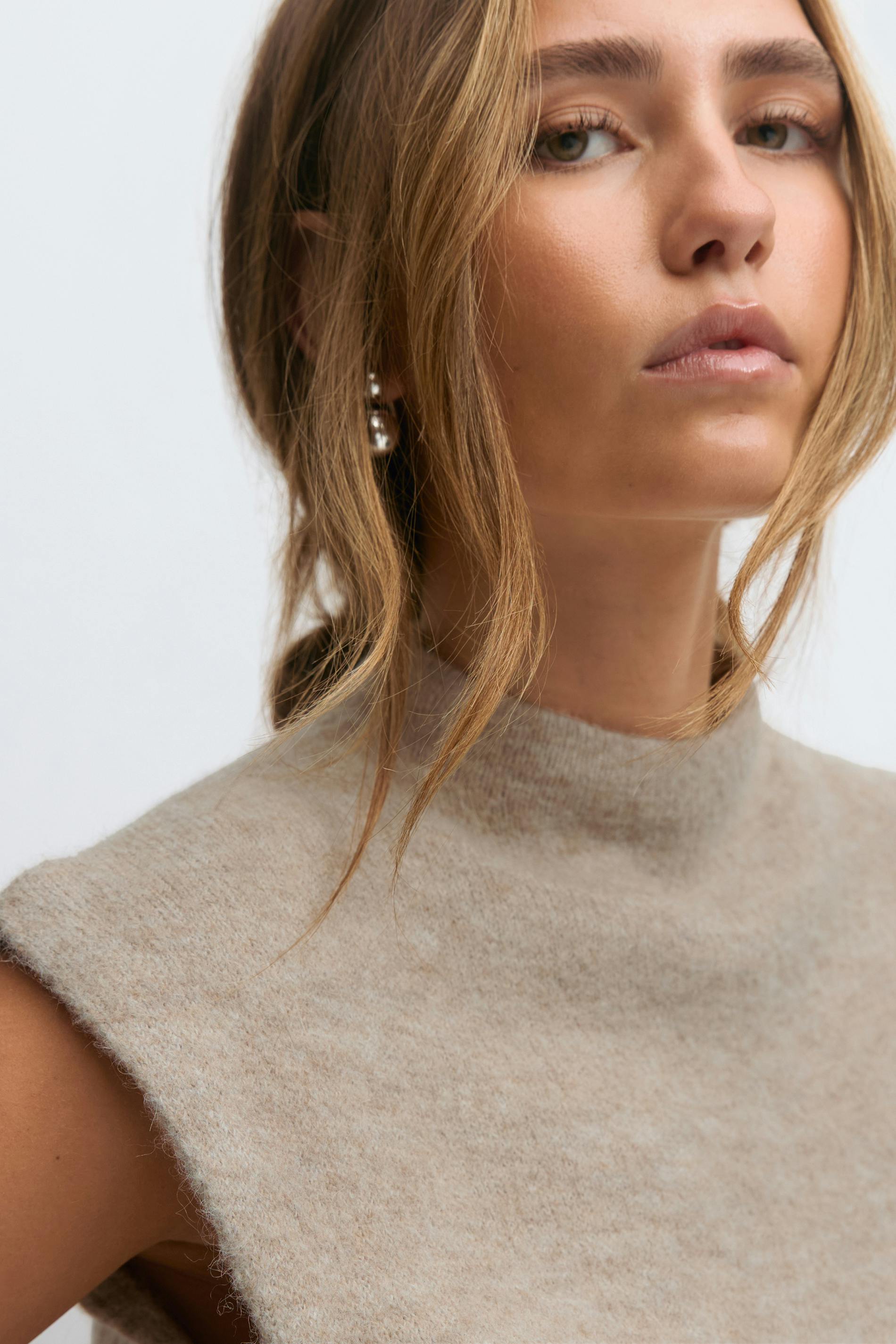 Knitted top with high neckline. The top is beige and has sleeveless design.