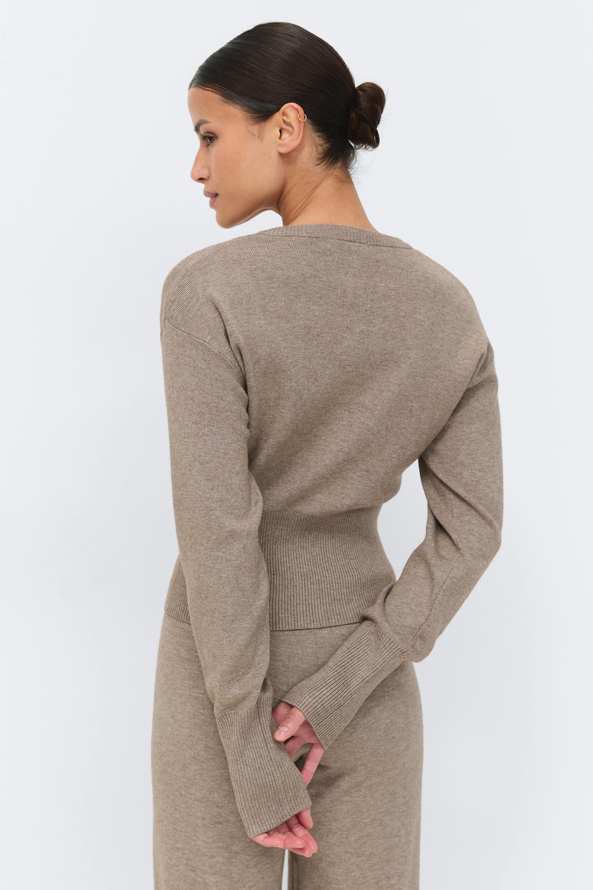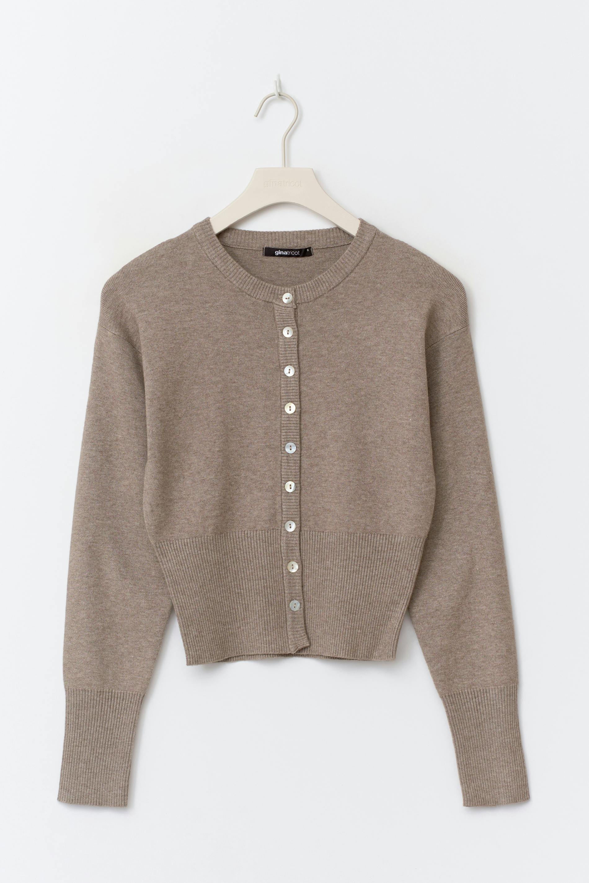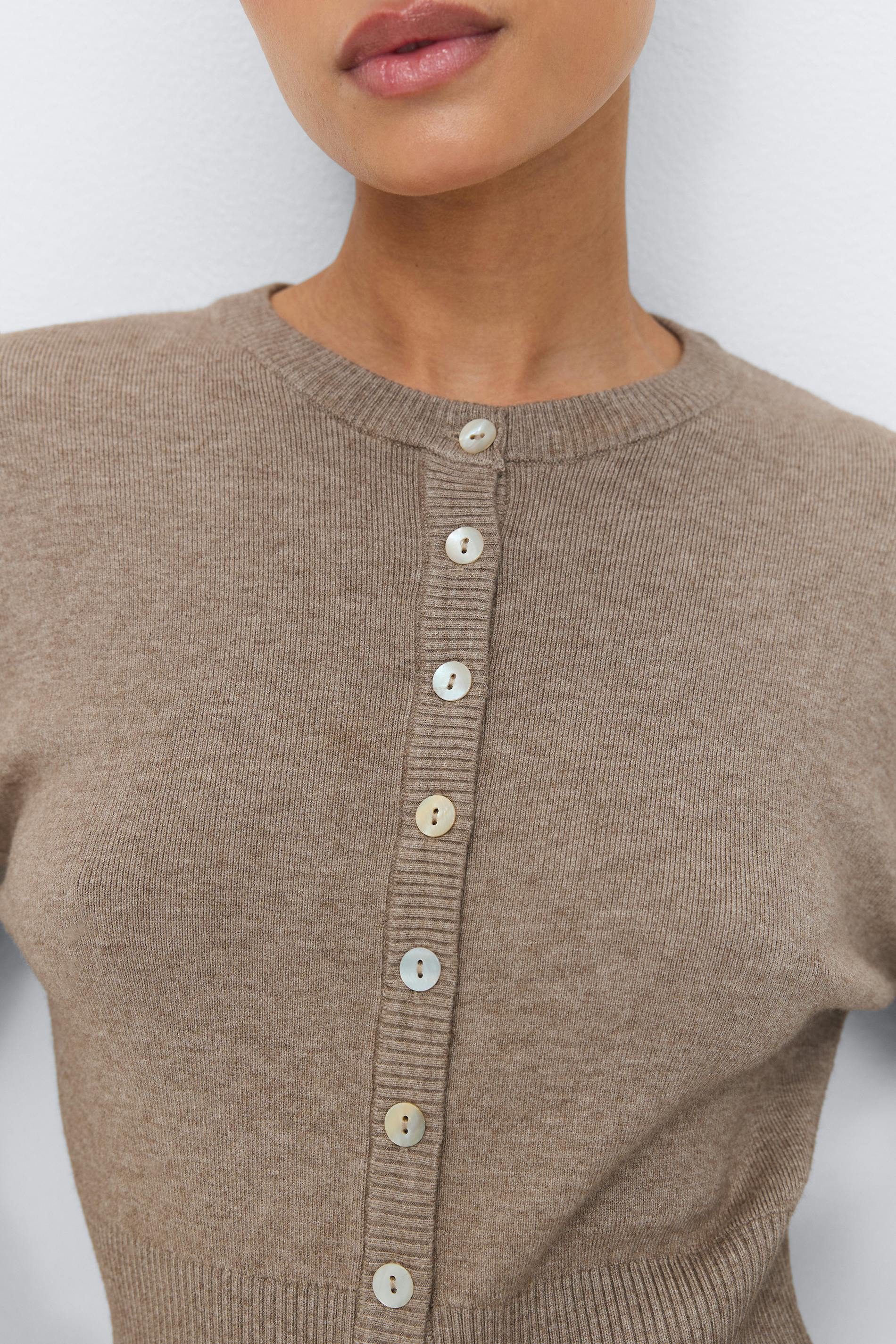 Figursydd kofta med intagen midja. Koftan är beige och har knappar framtill. Den har normal passform, rund halsringning, lång ärm och bred ribbstickning vid ärmslut och i nederkant.