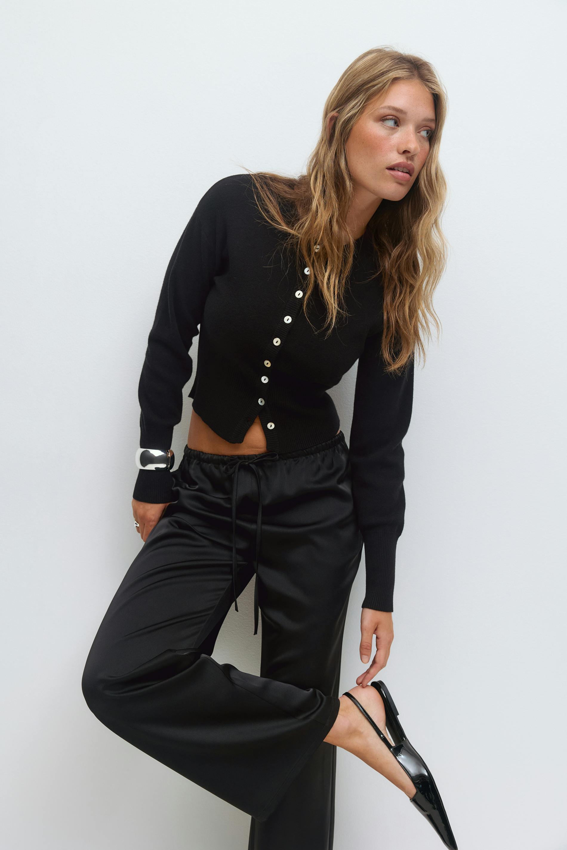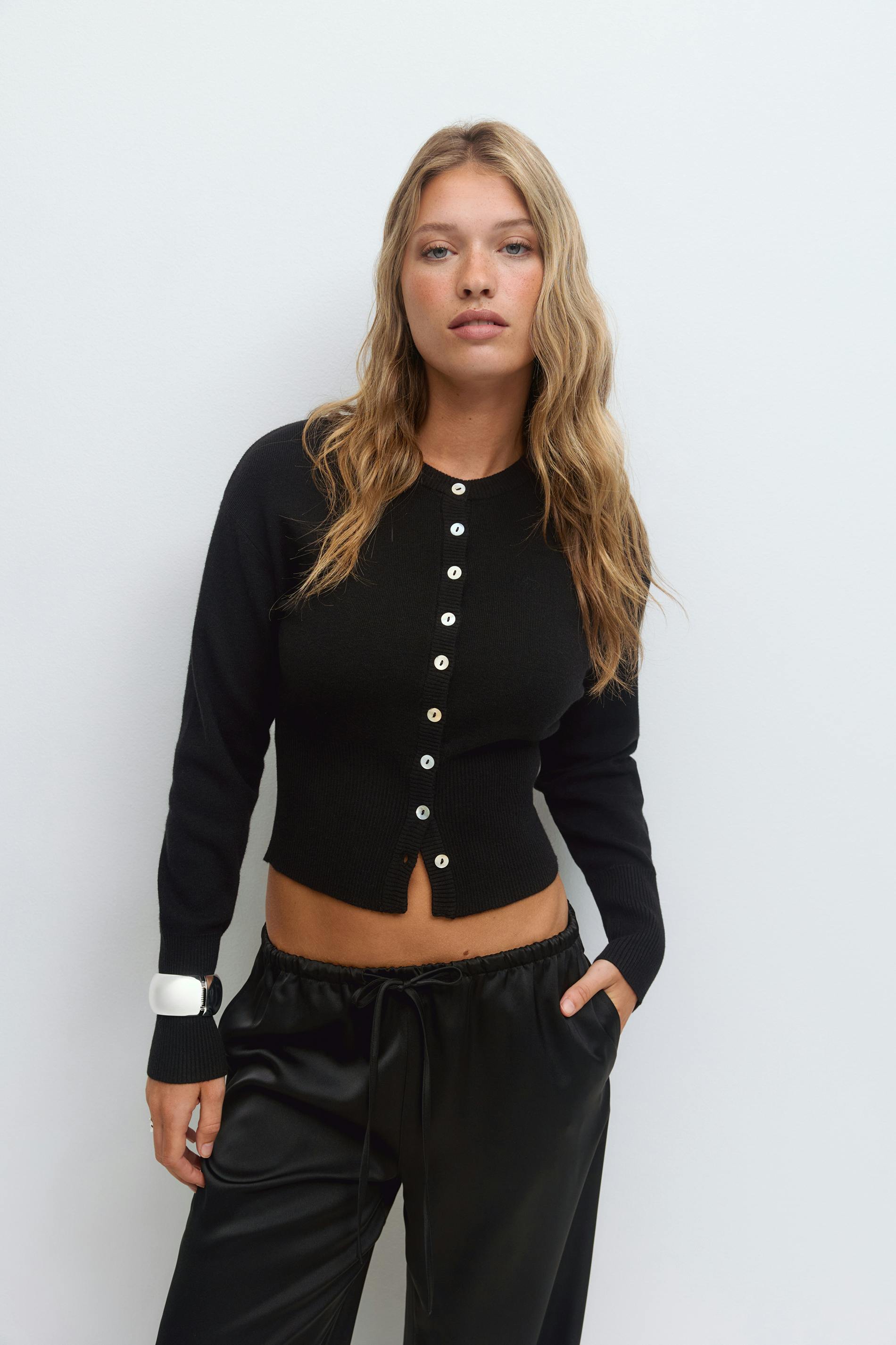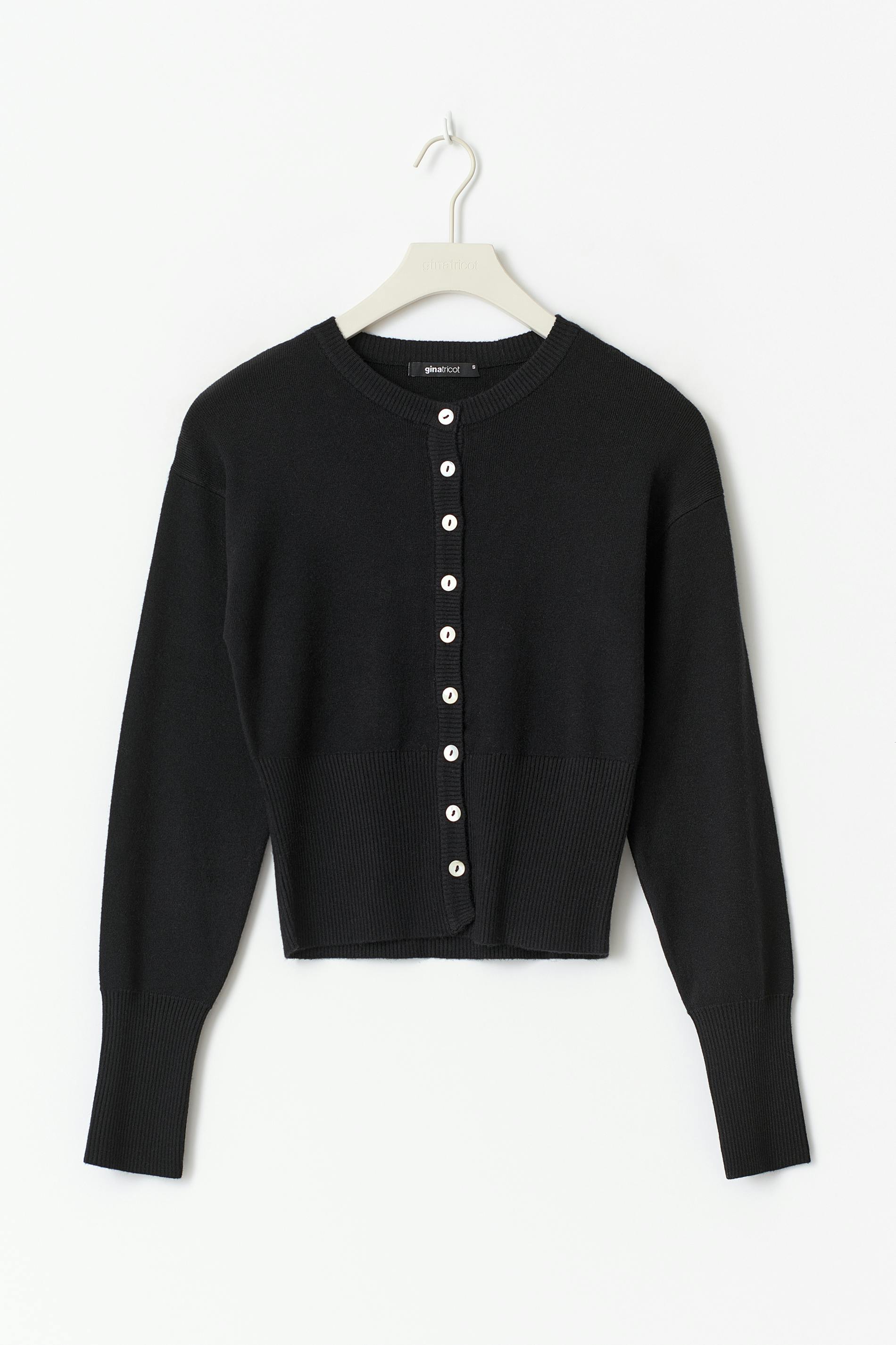 Figursydd kofta med intagen midja. Koftan är svart och har knappar framtill. Den har normal passform, rund halsringning, lång ärm och bred ribbstickning vid ärmslut och i nederkant.
