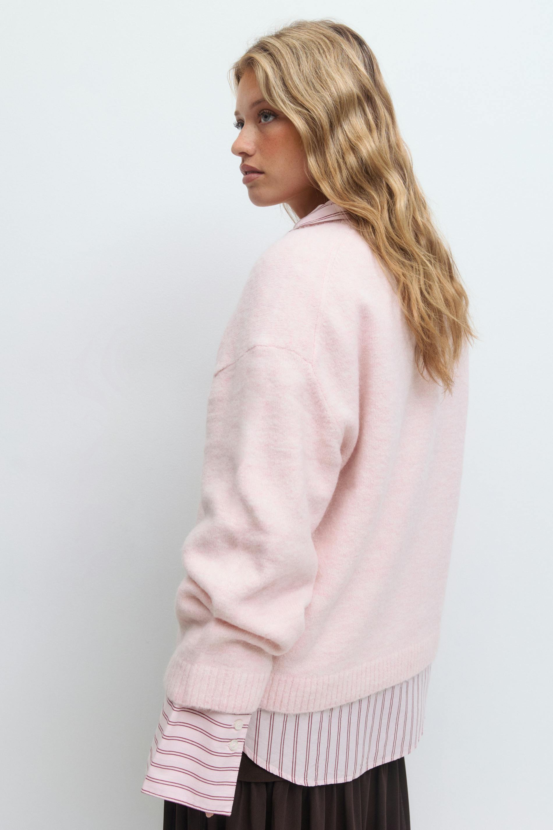 Stickad tröja med oversize fit. Tröjan är rosa och har finstickad kvalitet. Den har rund halsringning, lång ärm, normallängd och ribbstickning vid ärmslut och i nederkant.
