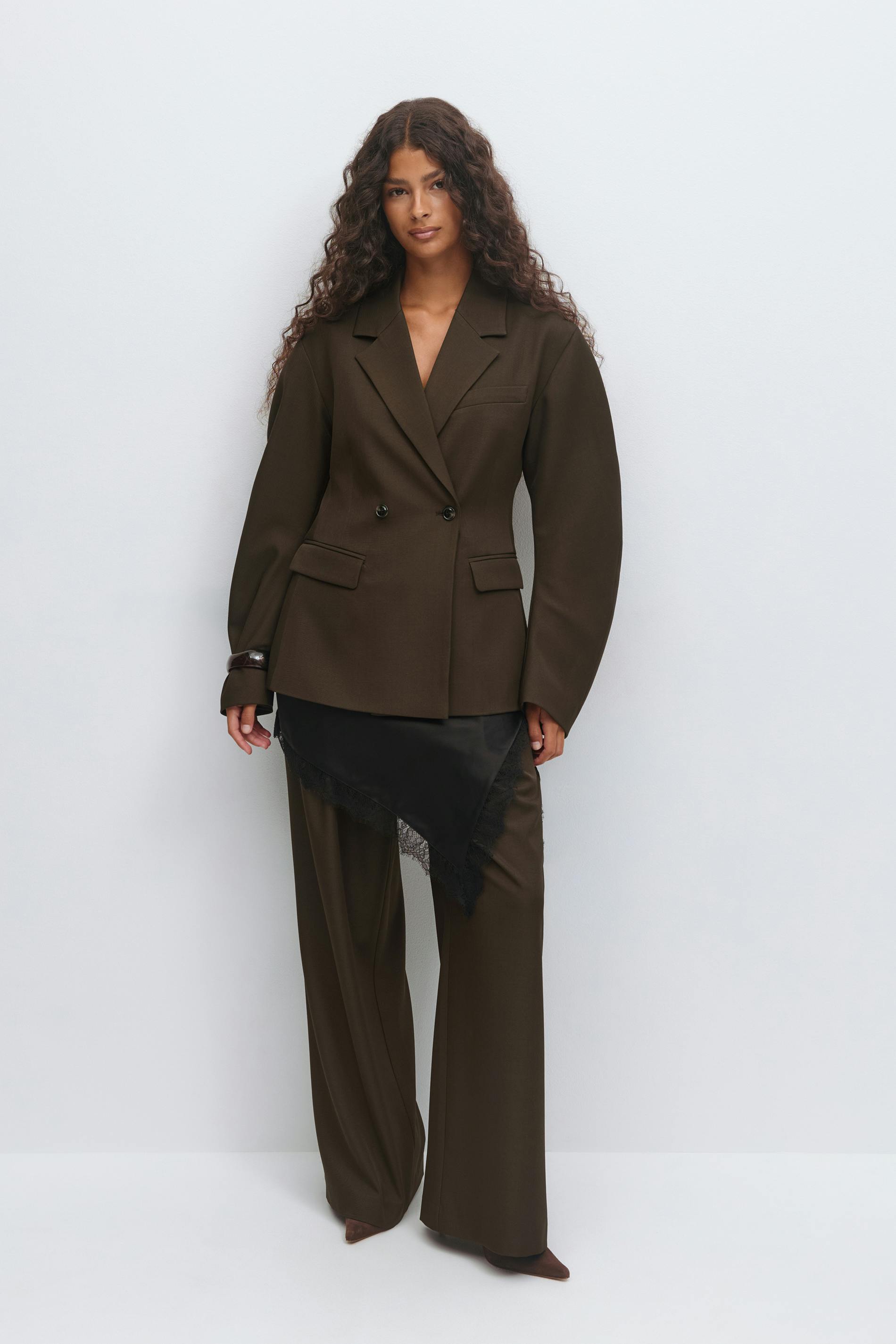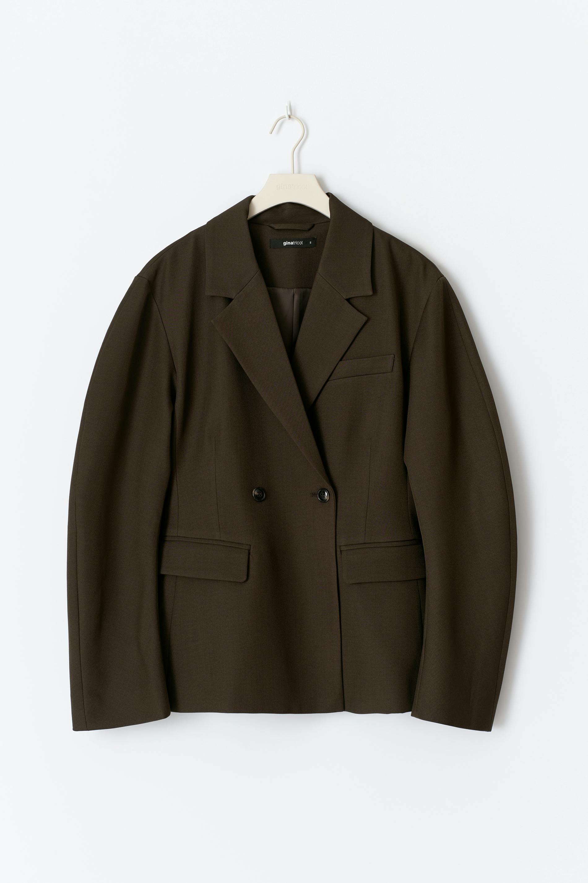 Figursydd kavaj med knäppning fram. Jackan är brun och har fickor med lock. Den har normal passform, långa ärmar, krage med slag, bröstficka och slits bak. Helfodrad.