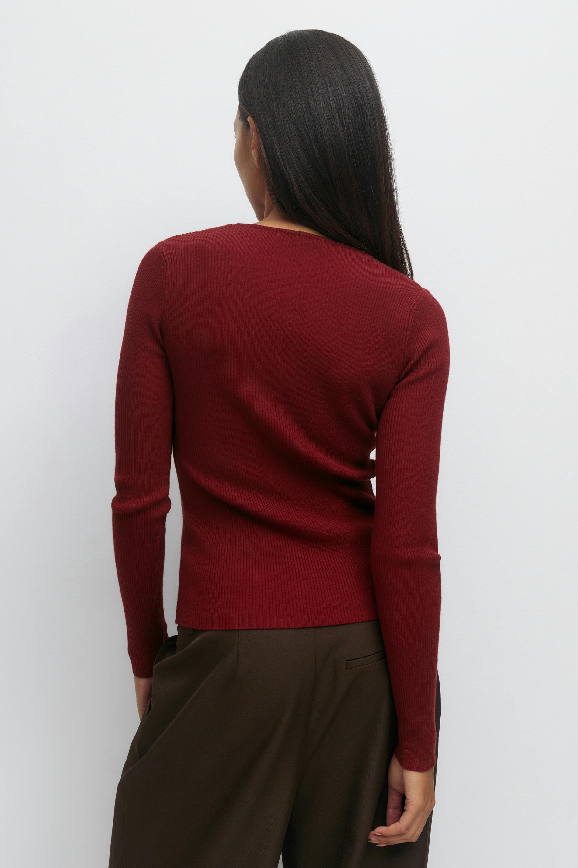 Långärmad topp med knappar framtill. Toppen är vinröd och har en rund hals. Den har en normal passform.