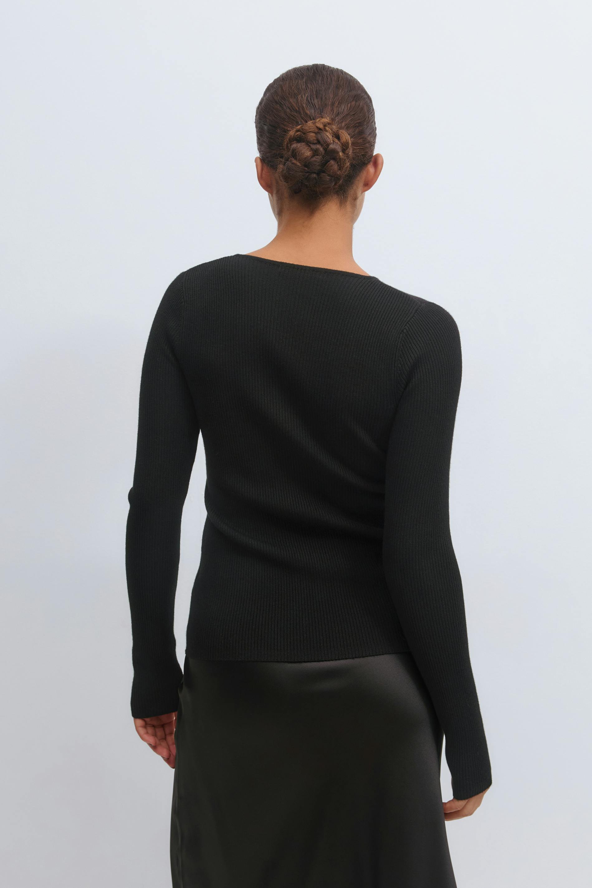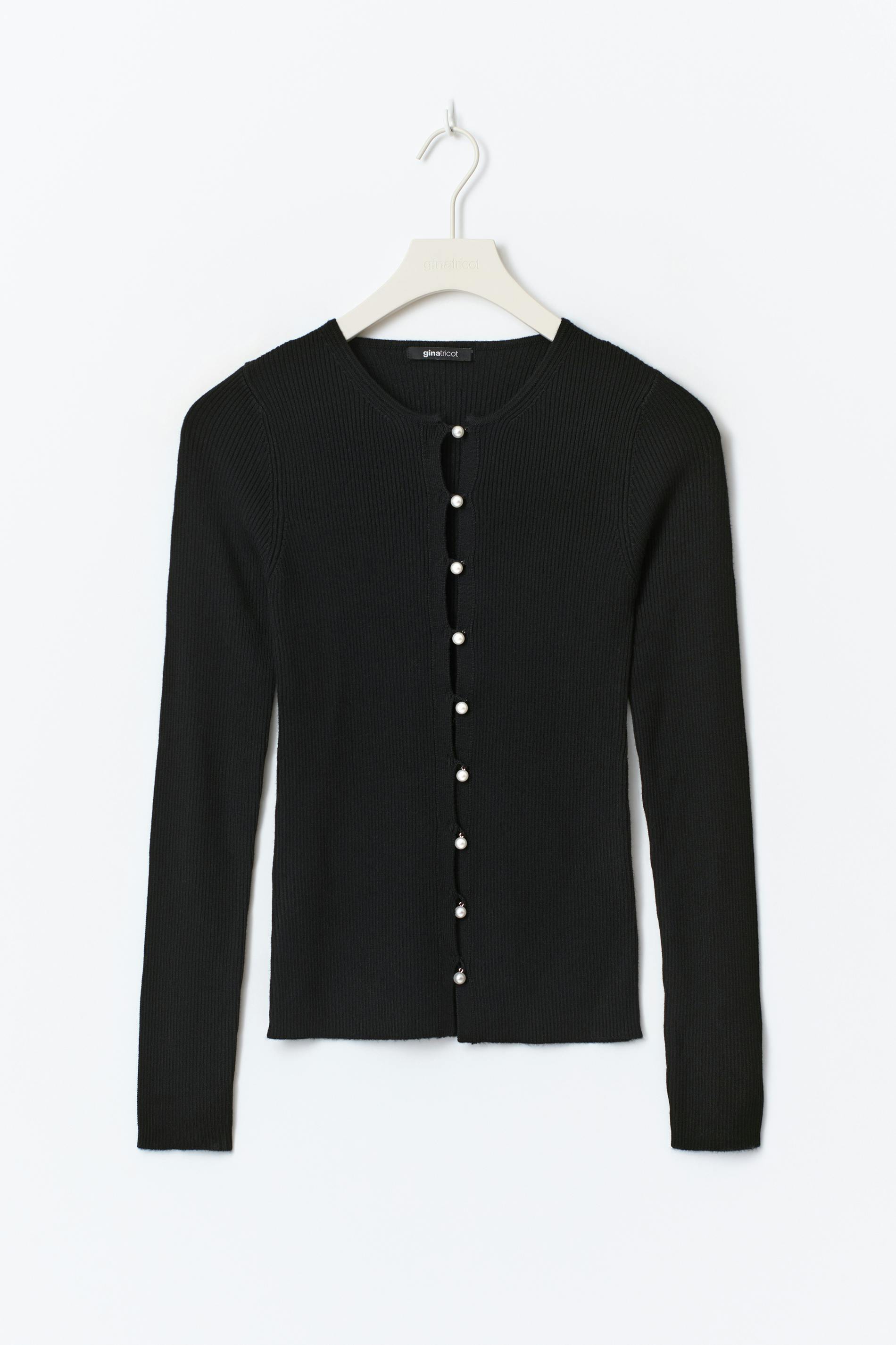 Långärmad topp med knappar framtill. Toppen är svart och har en rund hals. Den har en normal passform.