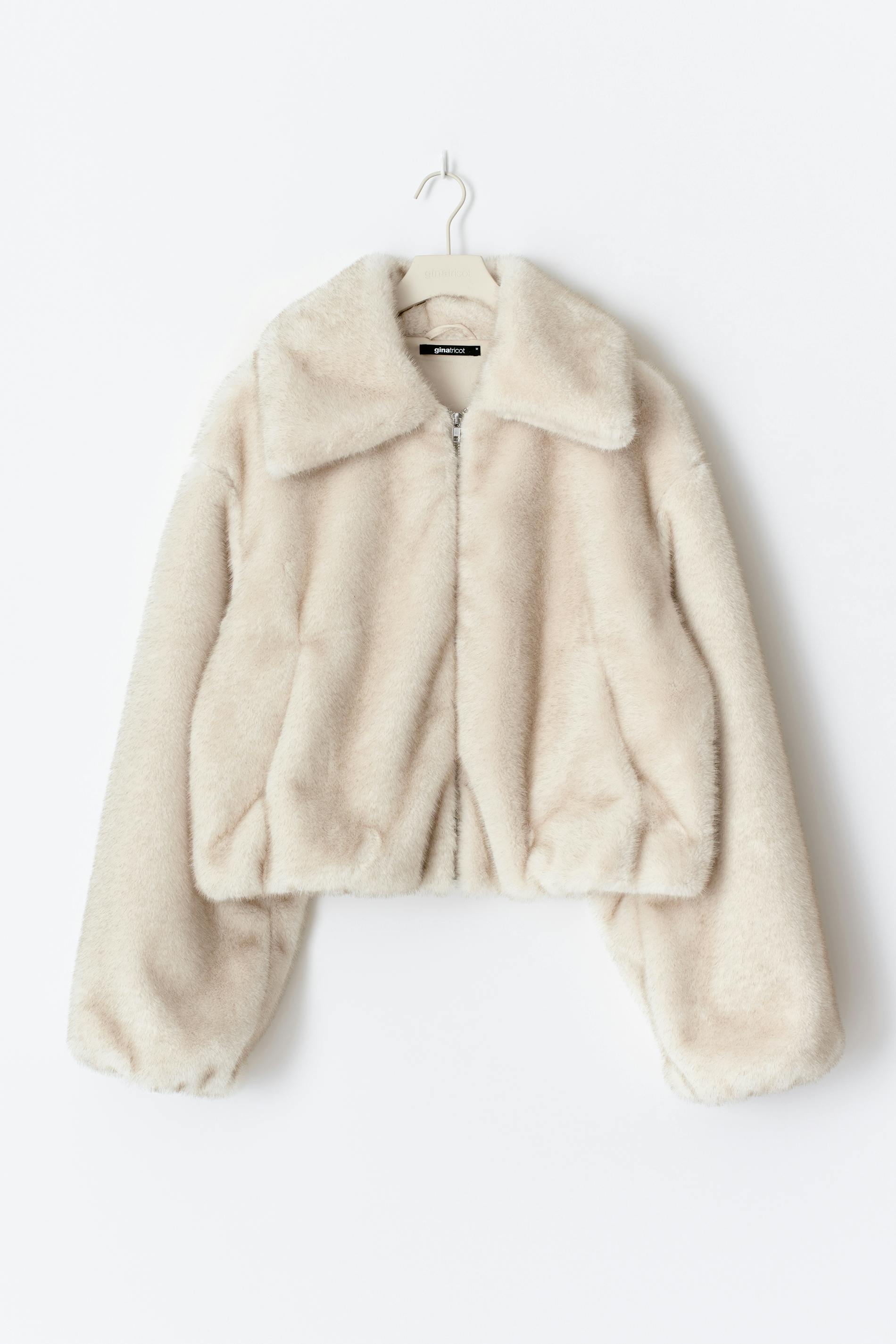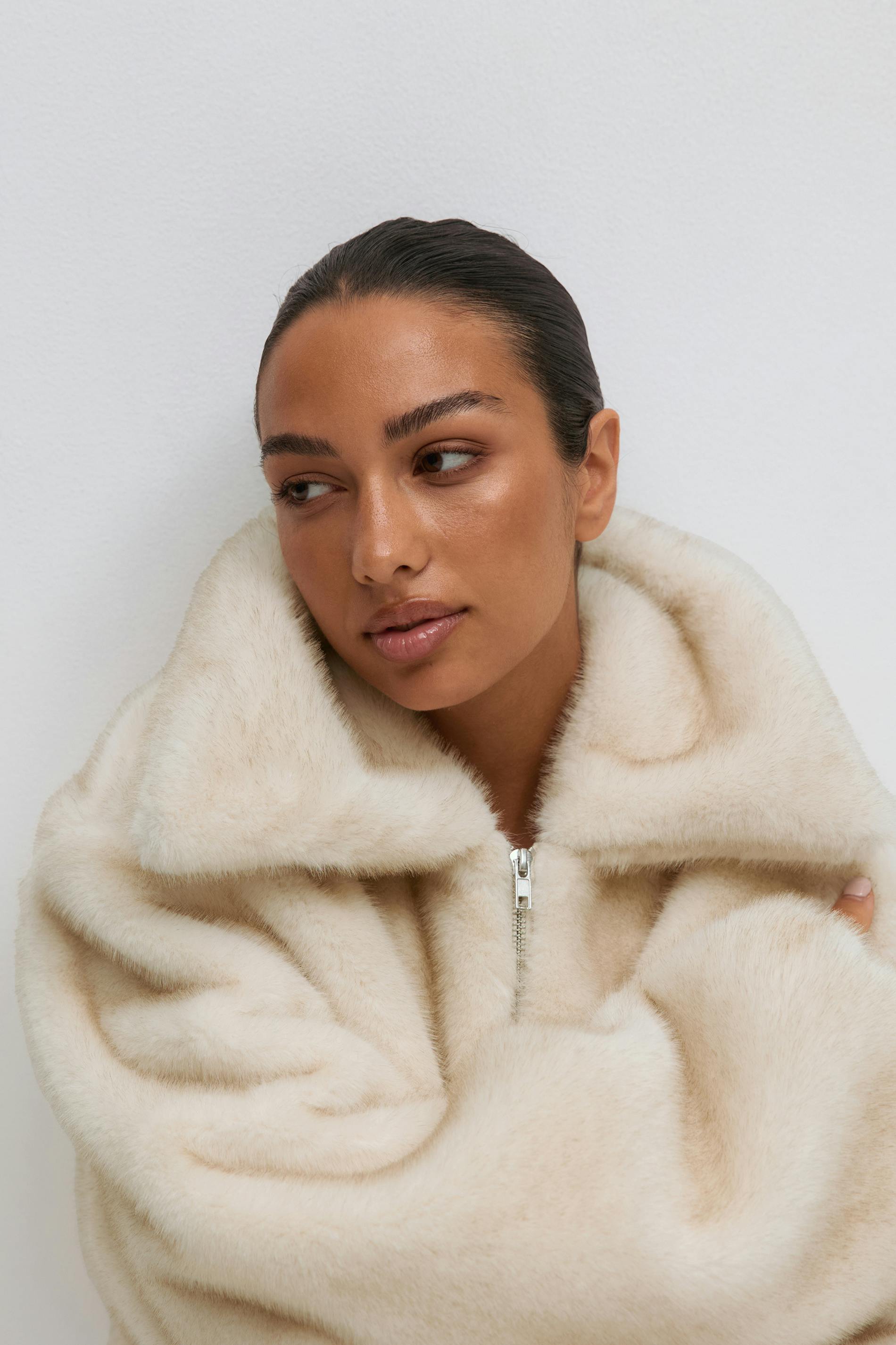 Kort pälsjacka med stor krage. Jackan är krämfärgad och har dragkedjestängning framtill. Den har fickor i sidorna, fluffig kvalitet, normal passform, långa puffärmar och rund halsringning. Fodrad.