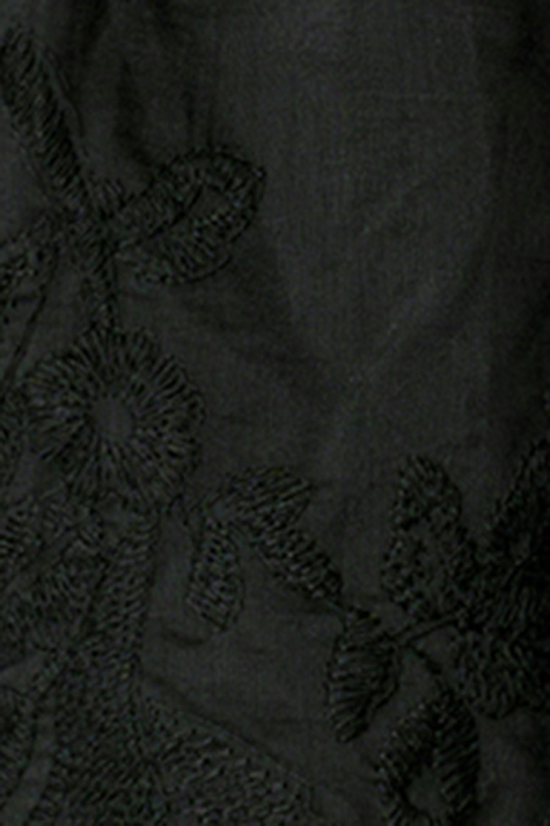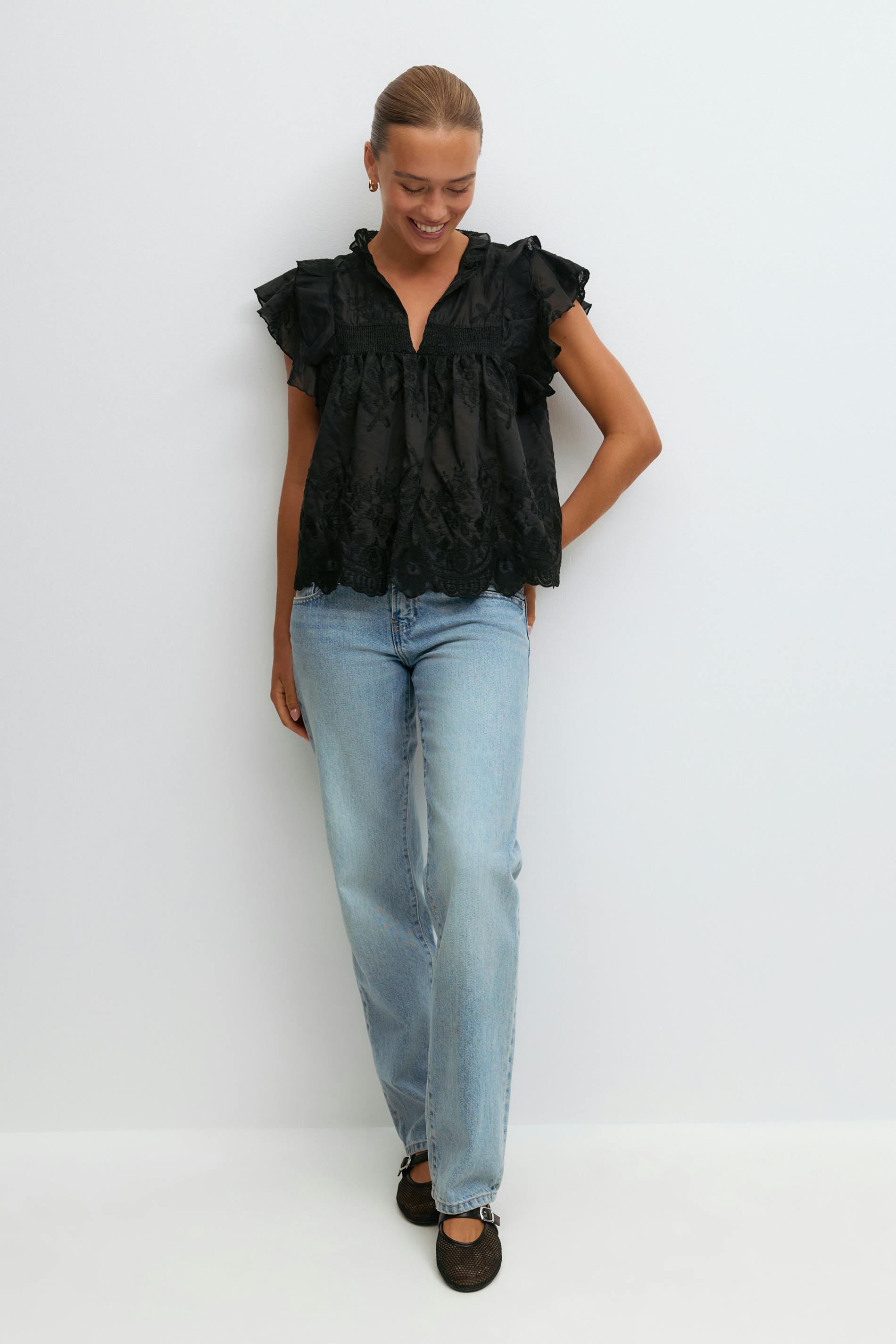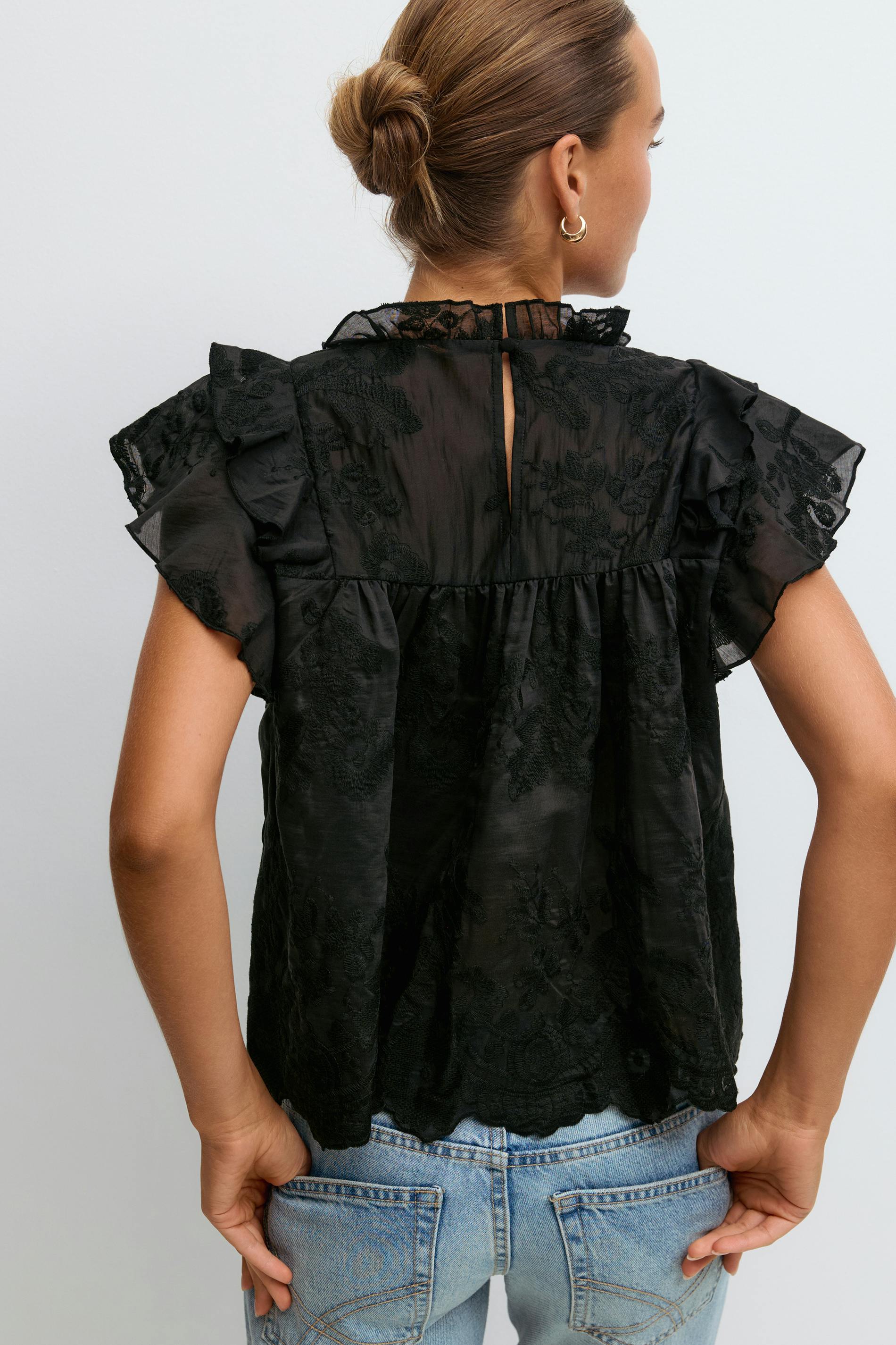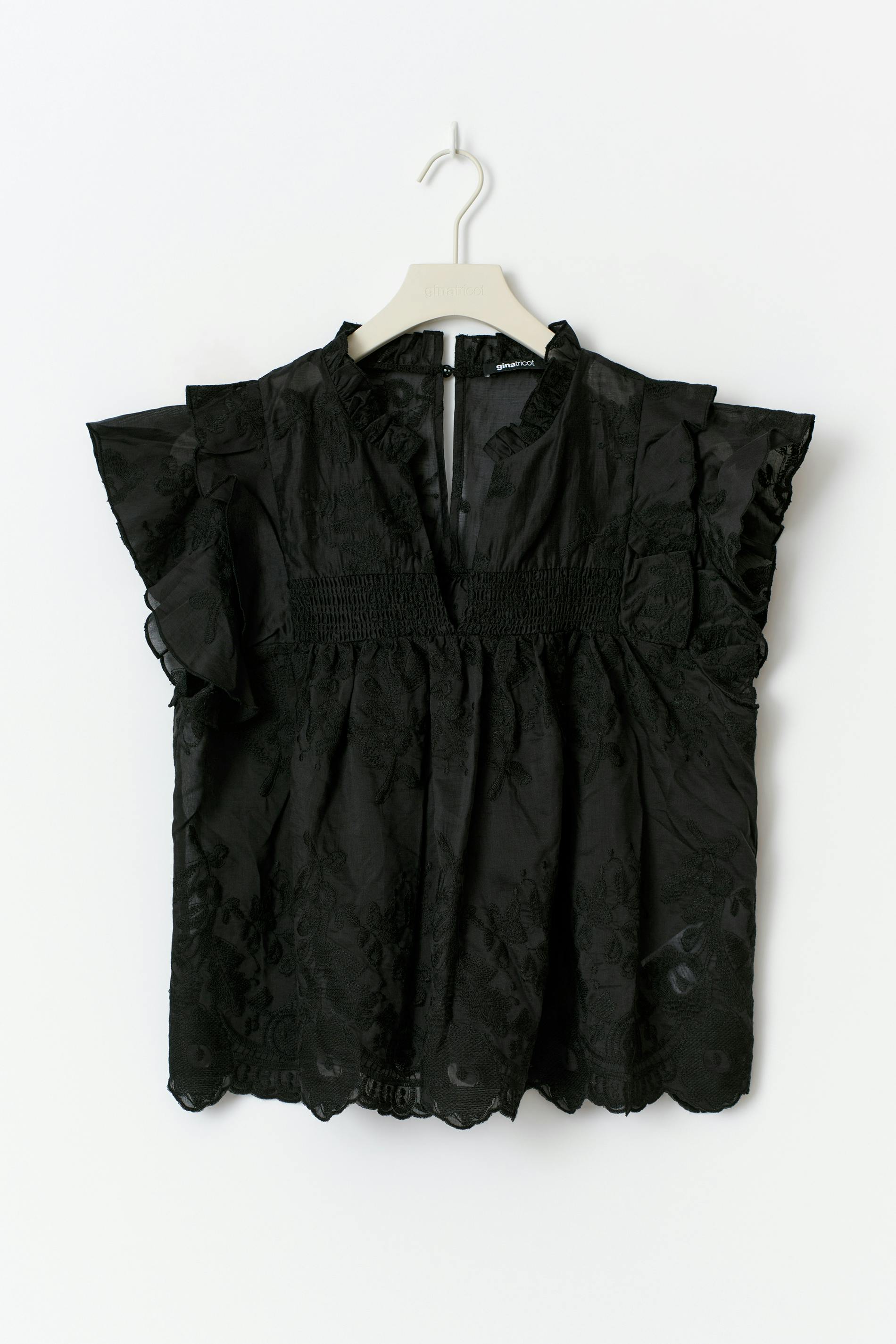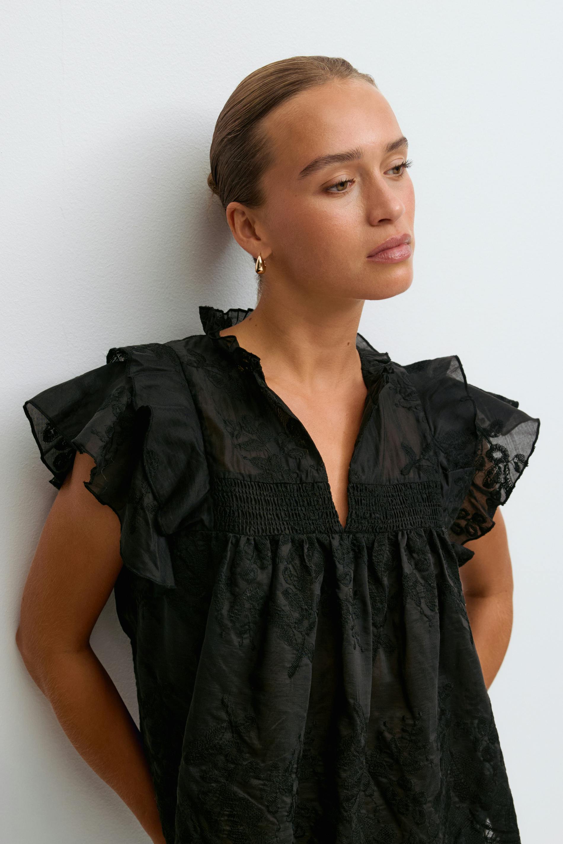Structured blouse with embroidery. The blouse is black and has V-neck. It has smocked detail at the front, small collar, short frilled sleeves and buttoning in the back.