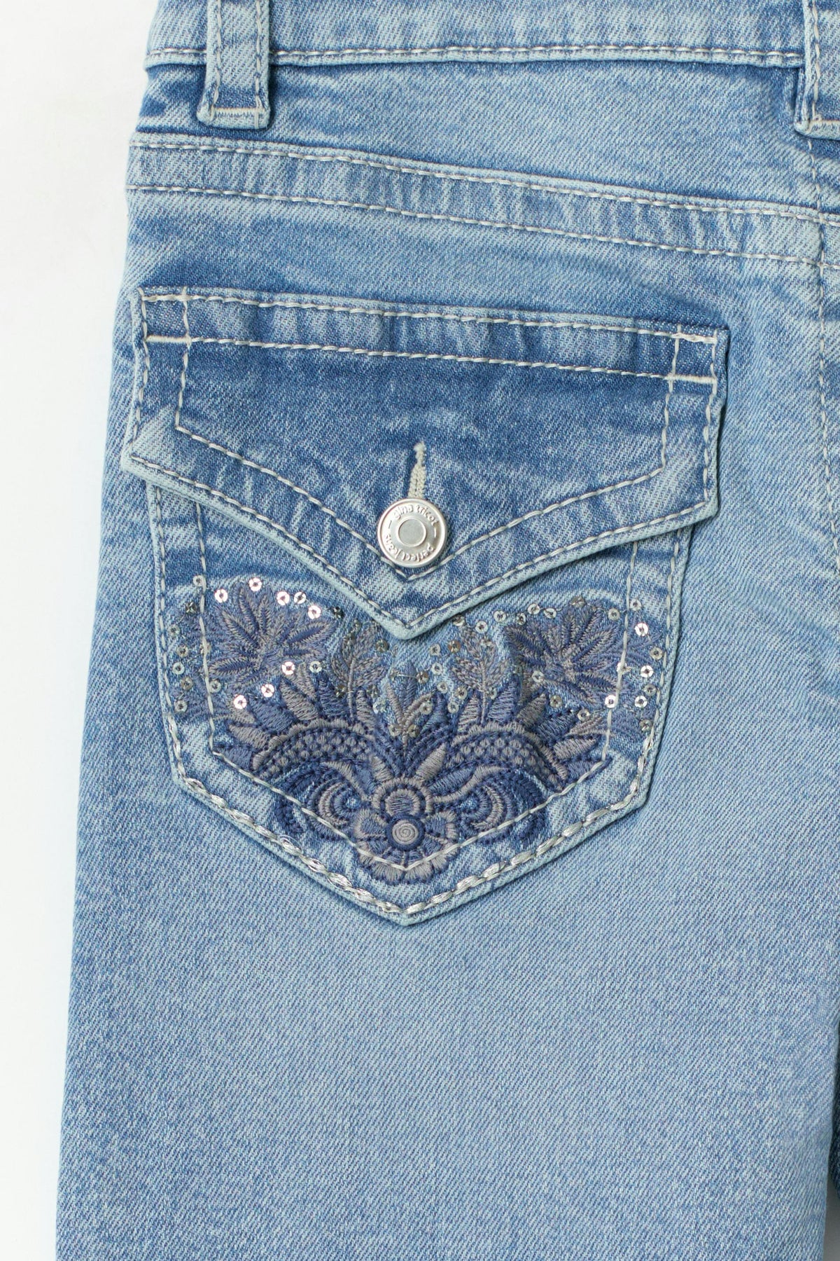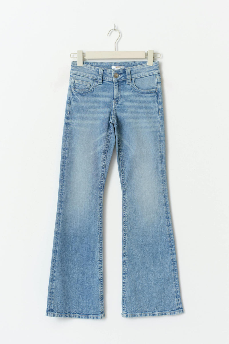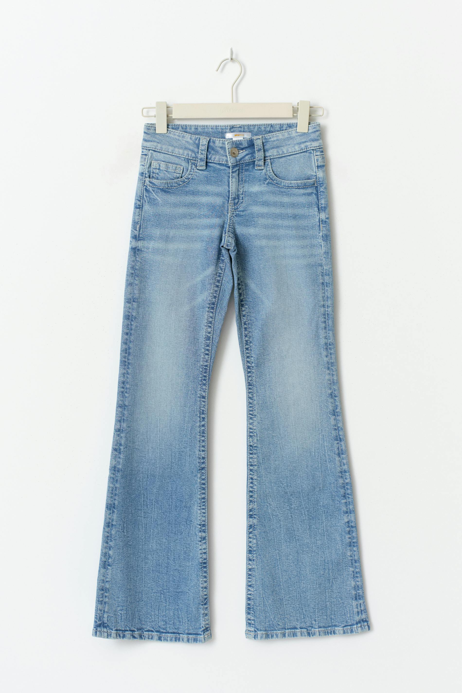 Flare jeans with low waist. The jeans are light-blue and have flared legs. They have low stretch, adjustable elastic at the waist, belt loops, front pockets, zip fly and embroidered back pockets with flap and button.