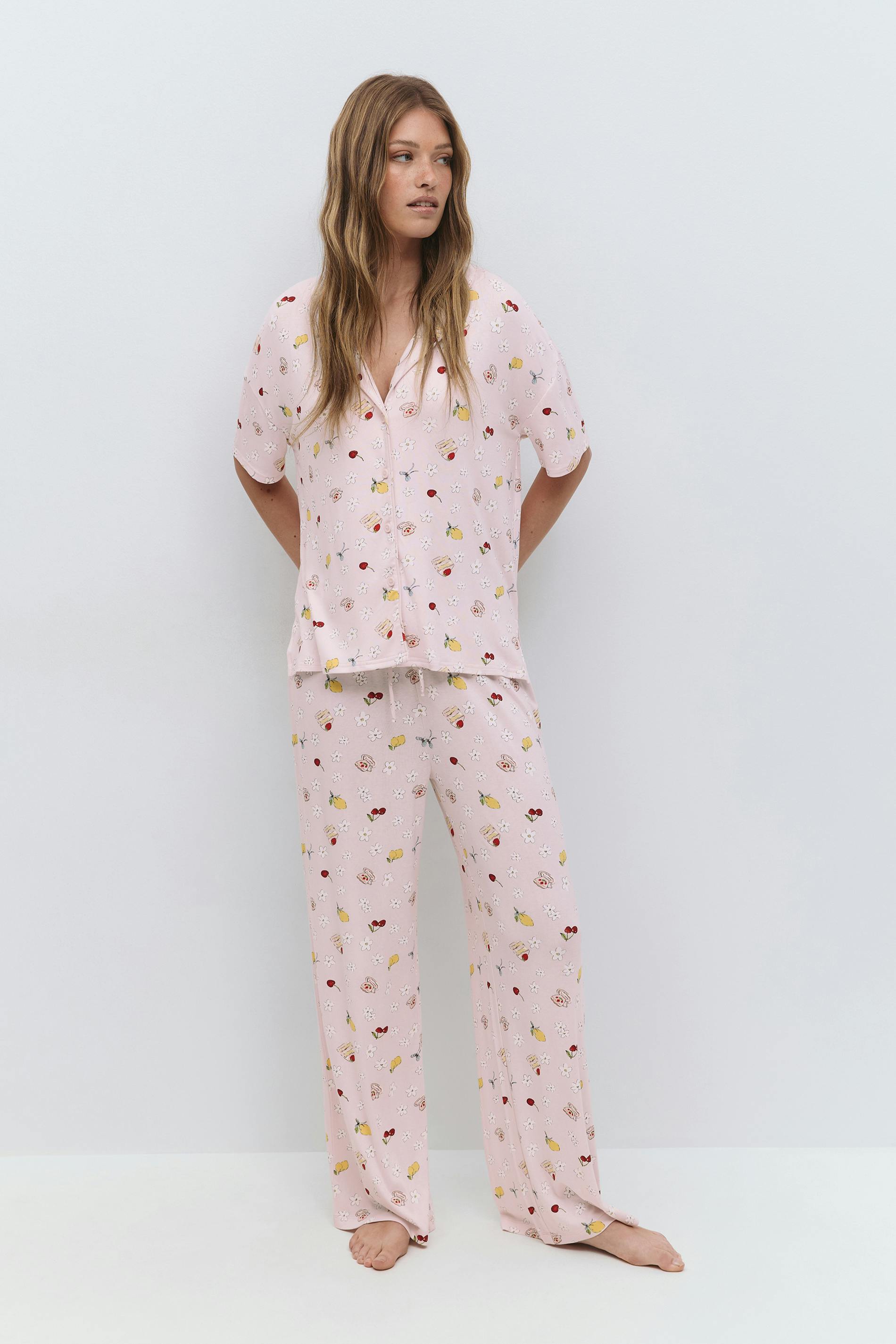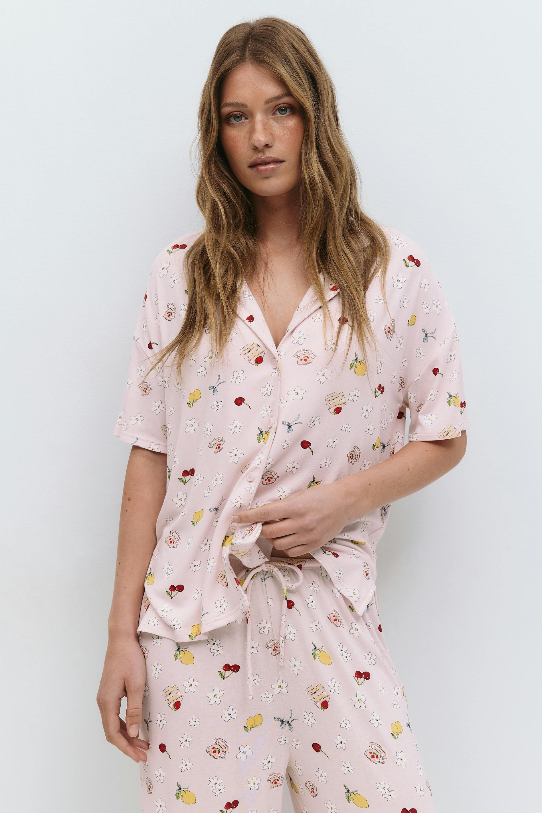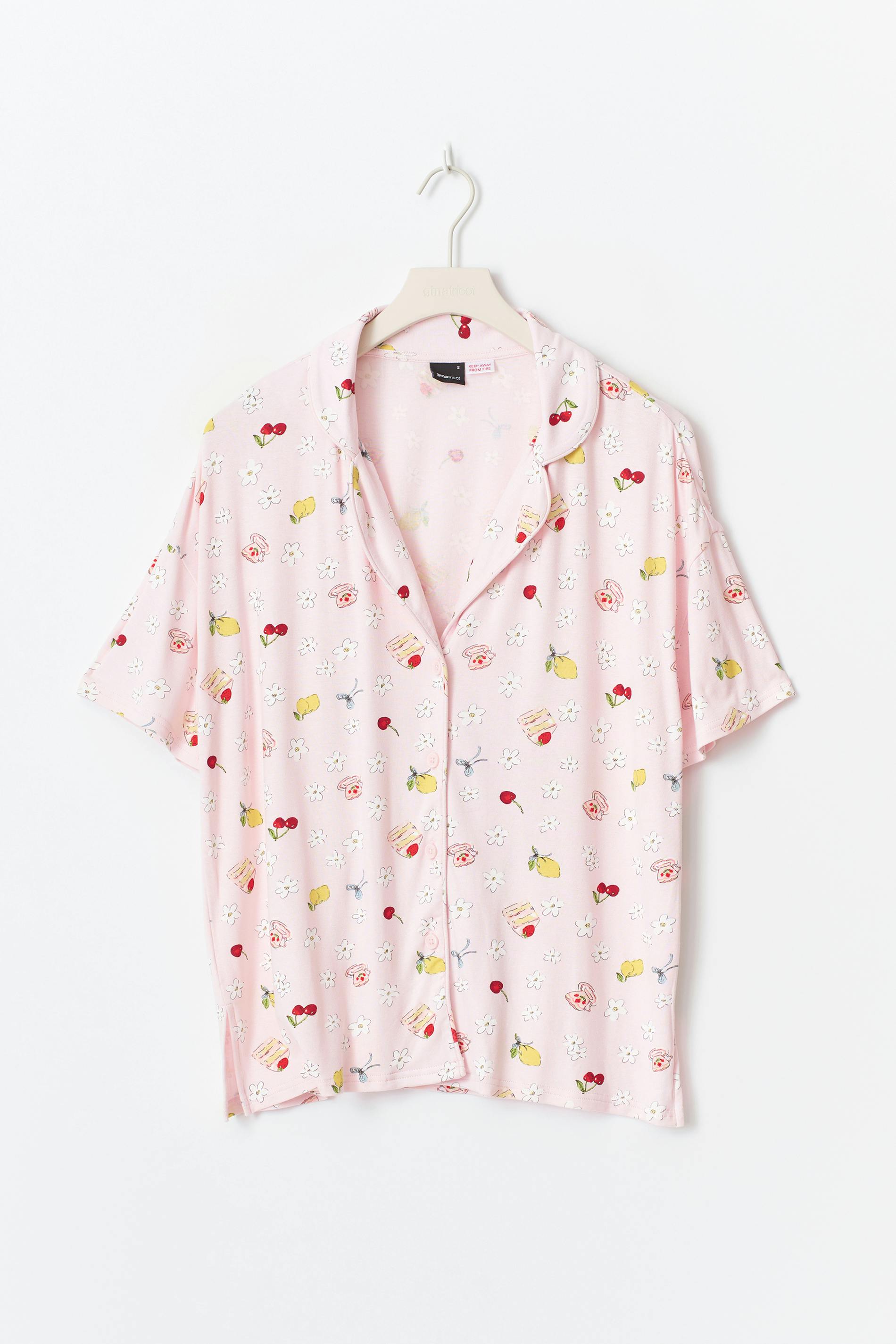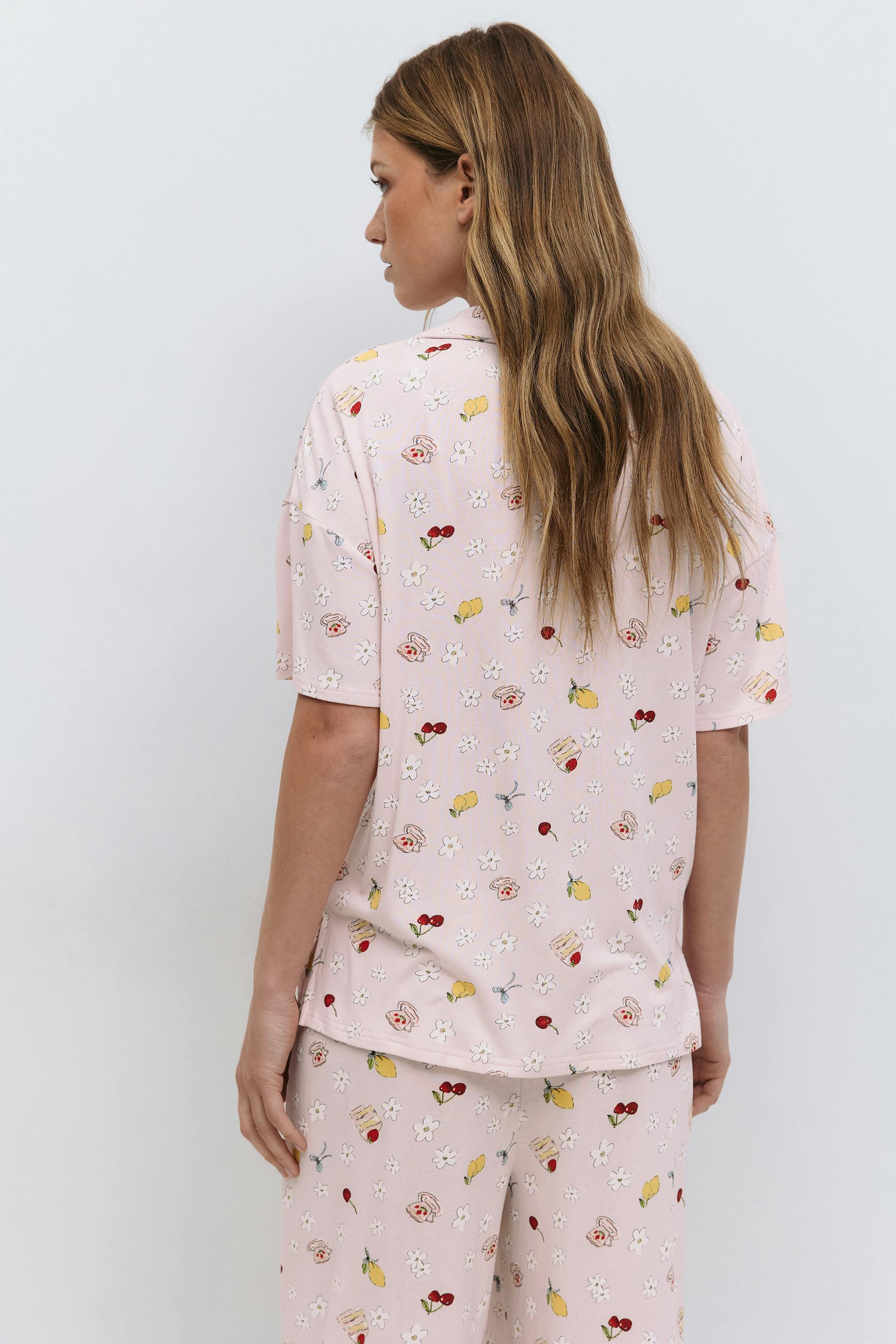 Kortärmad pyjamasskjorta med mönster med citroner, körsbär och blommor. Skjortan är rosa och har krage. Den har knappar framtill, generös passform, normallängd och mjukt foder.