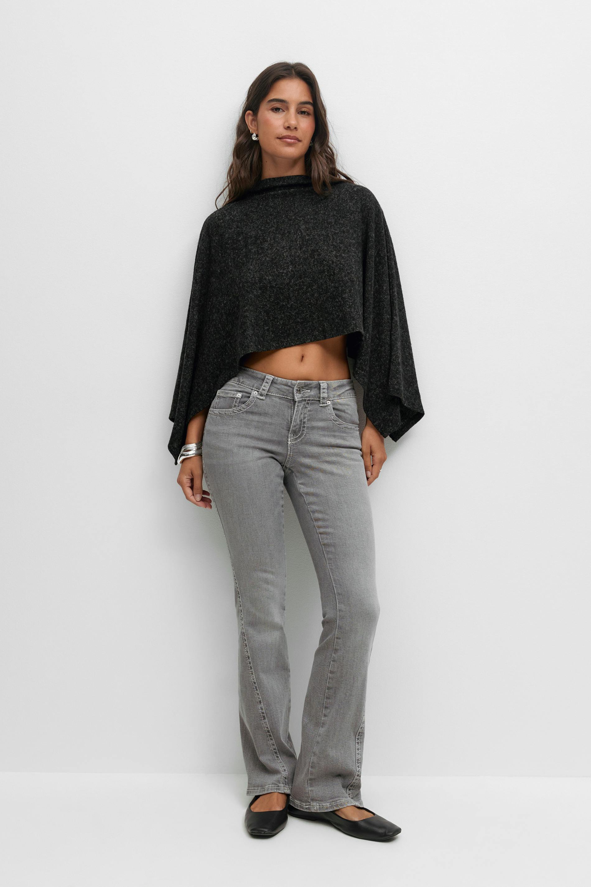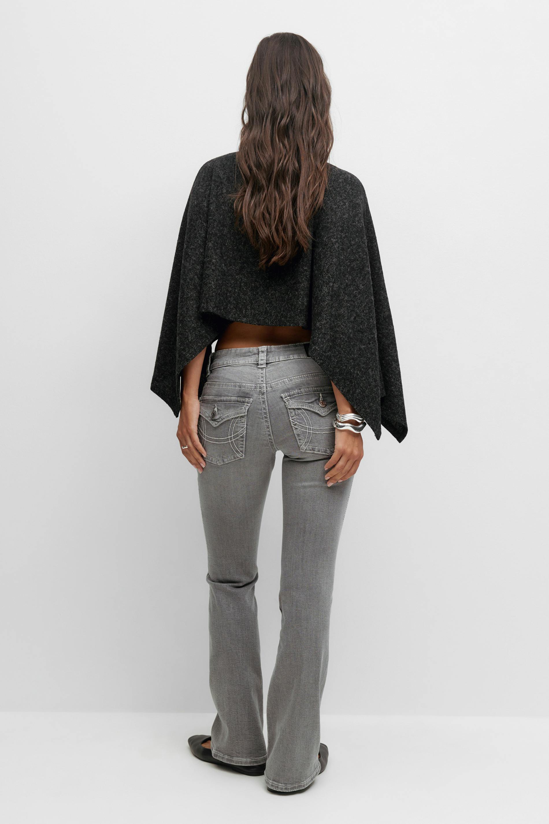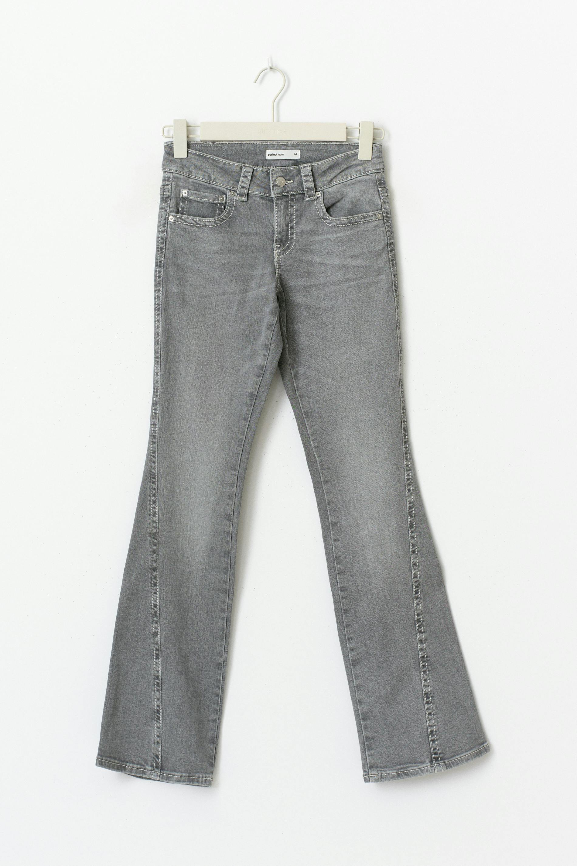 Bootcut jeans med låg midja. Jeansen är gråa och har broderade bakfickor med lock och knapp. De har stretchig kvalitet, figurnära passform, dragkedjegylf, utsvängda ben med normallängd och fickor fram och bak. Se gärna vår storleksguide för att hitta din