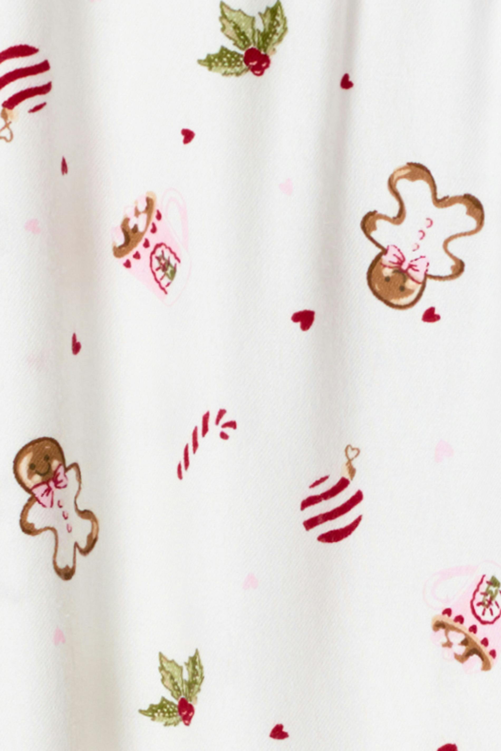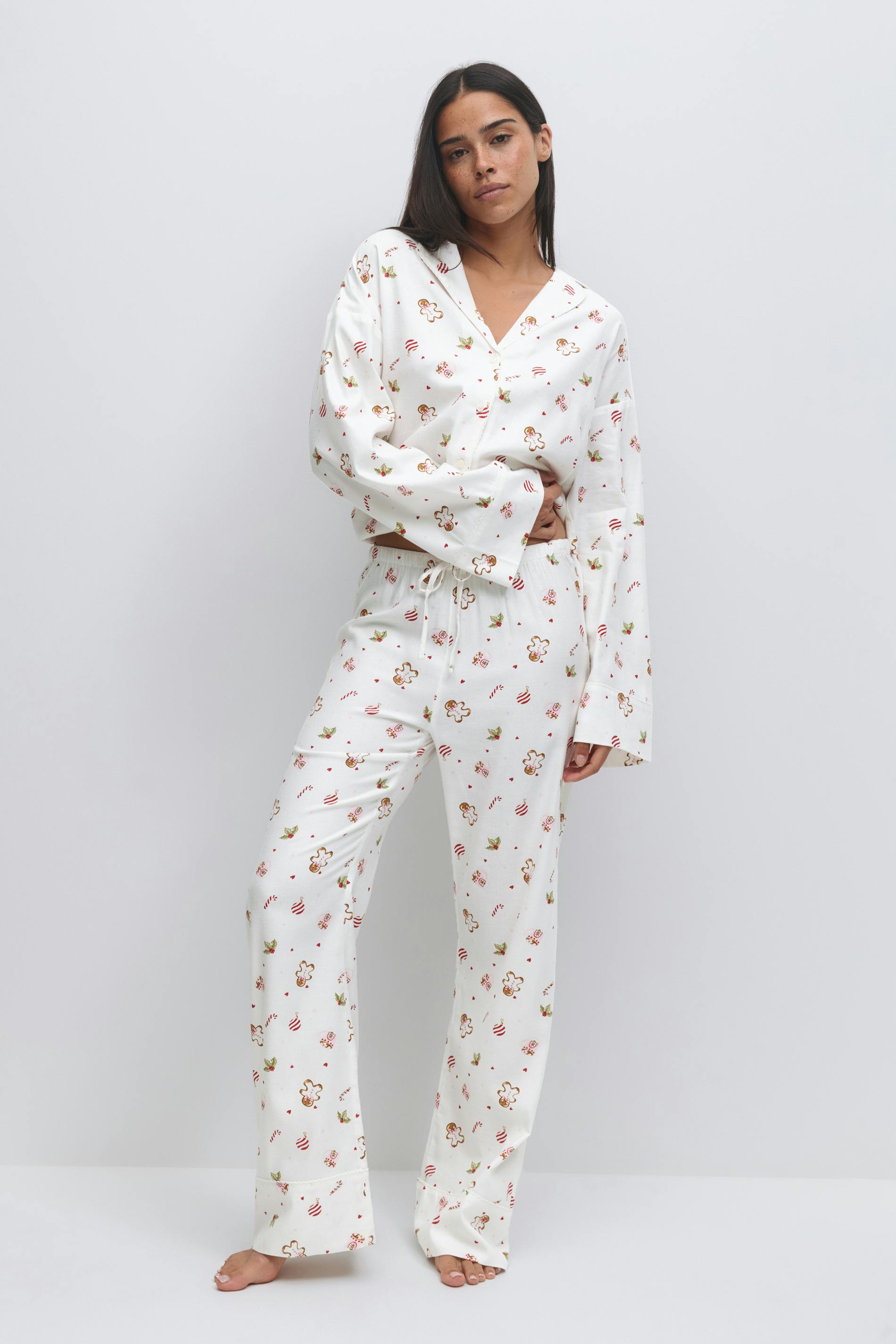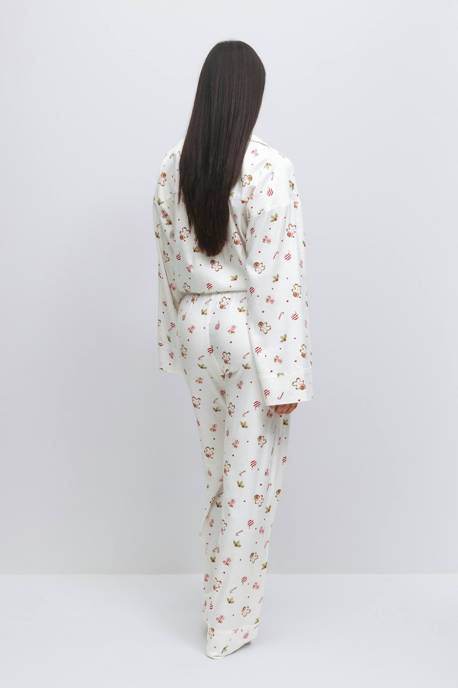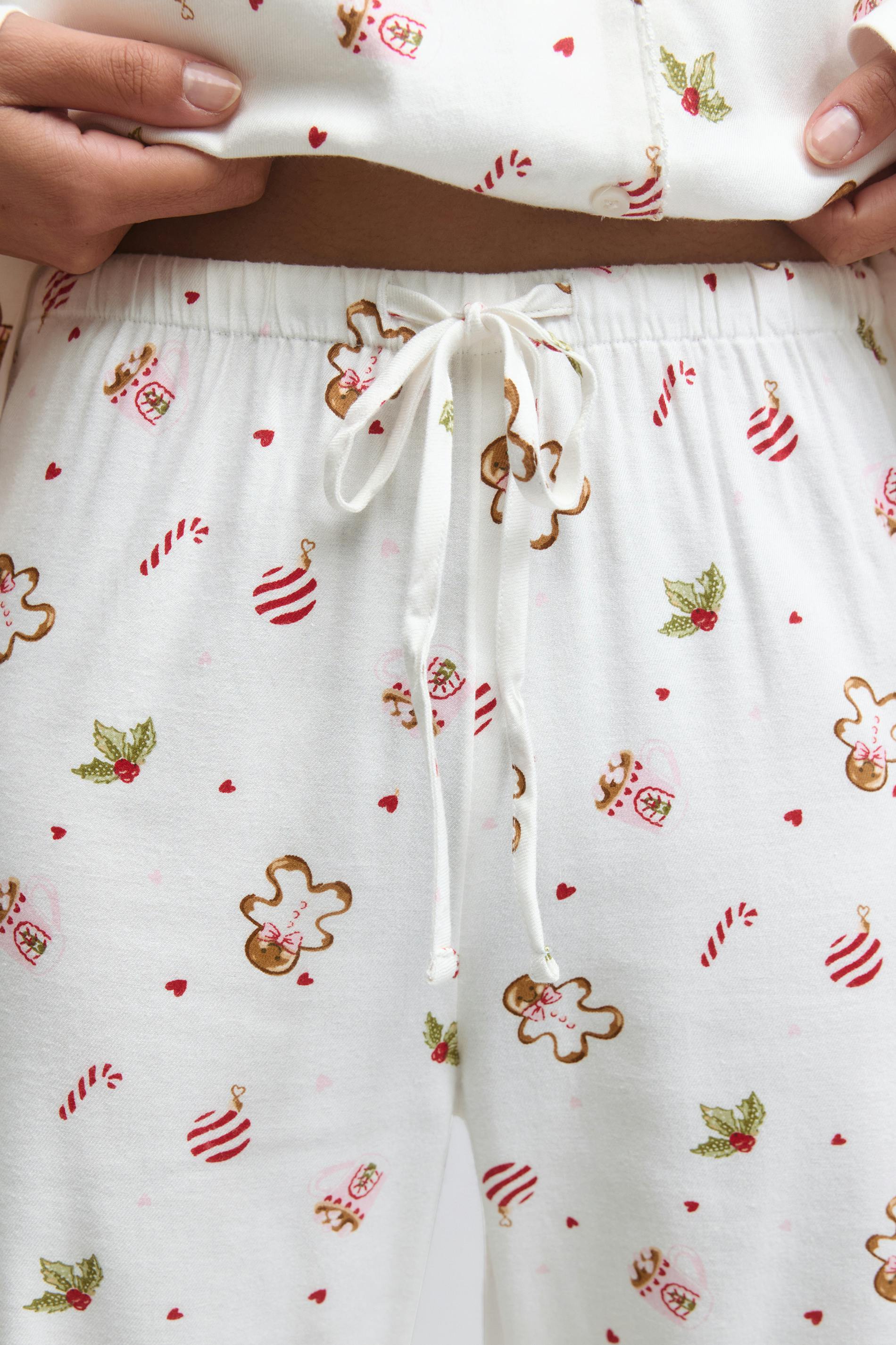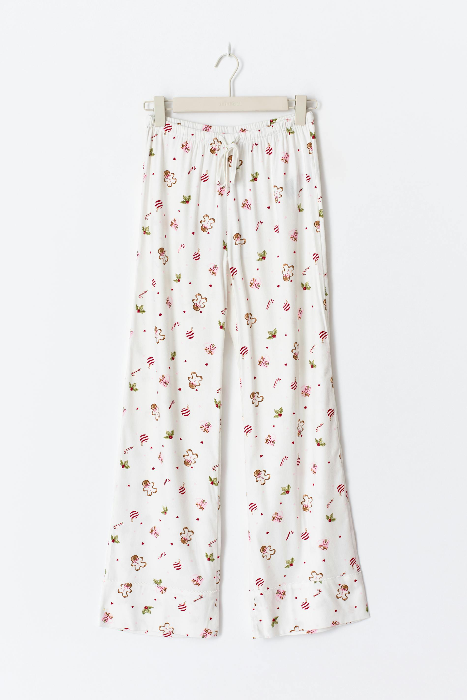 Julmönstrade pyjamasbyxor i flanell med knytning framtill. Pyjamasbyxorna är vita och har medelhög midja med resår. De har raka ben med normallängd.