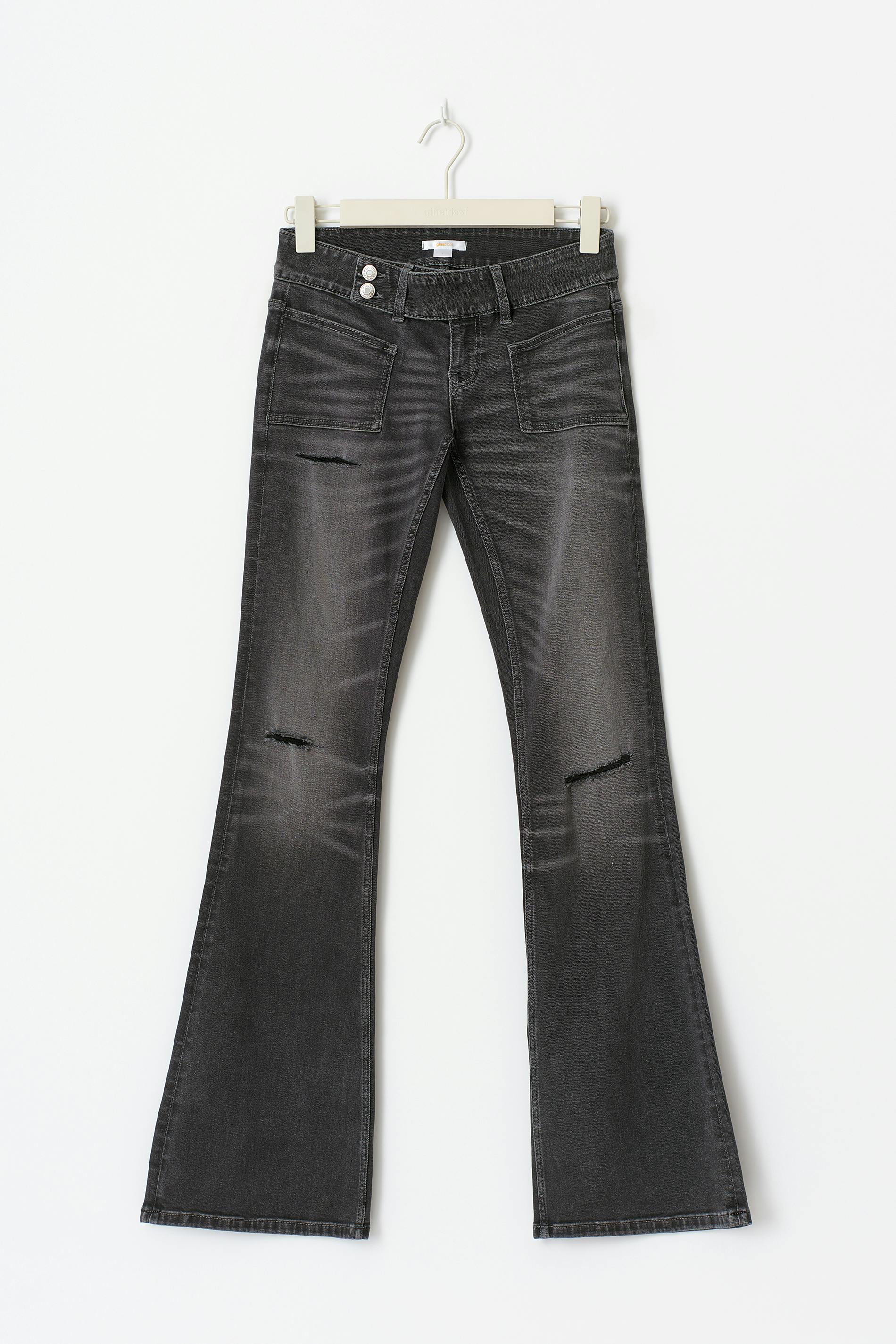 Flare jeans med extra långa ben. Jeansen är gråa och har slitna detaljer framtill. De har låg midja, utsvängda ben, låg stretch, dragkedjegylf, dubbla knappar i sidan och fickor fram och bak. Passar för dig som är 175 cm eller längre. Passar för dig som ä