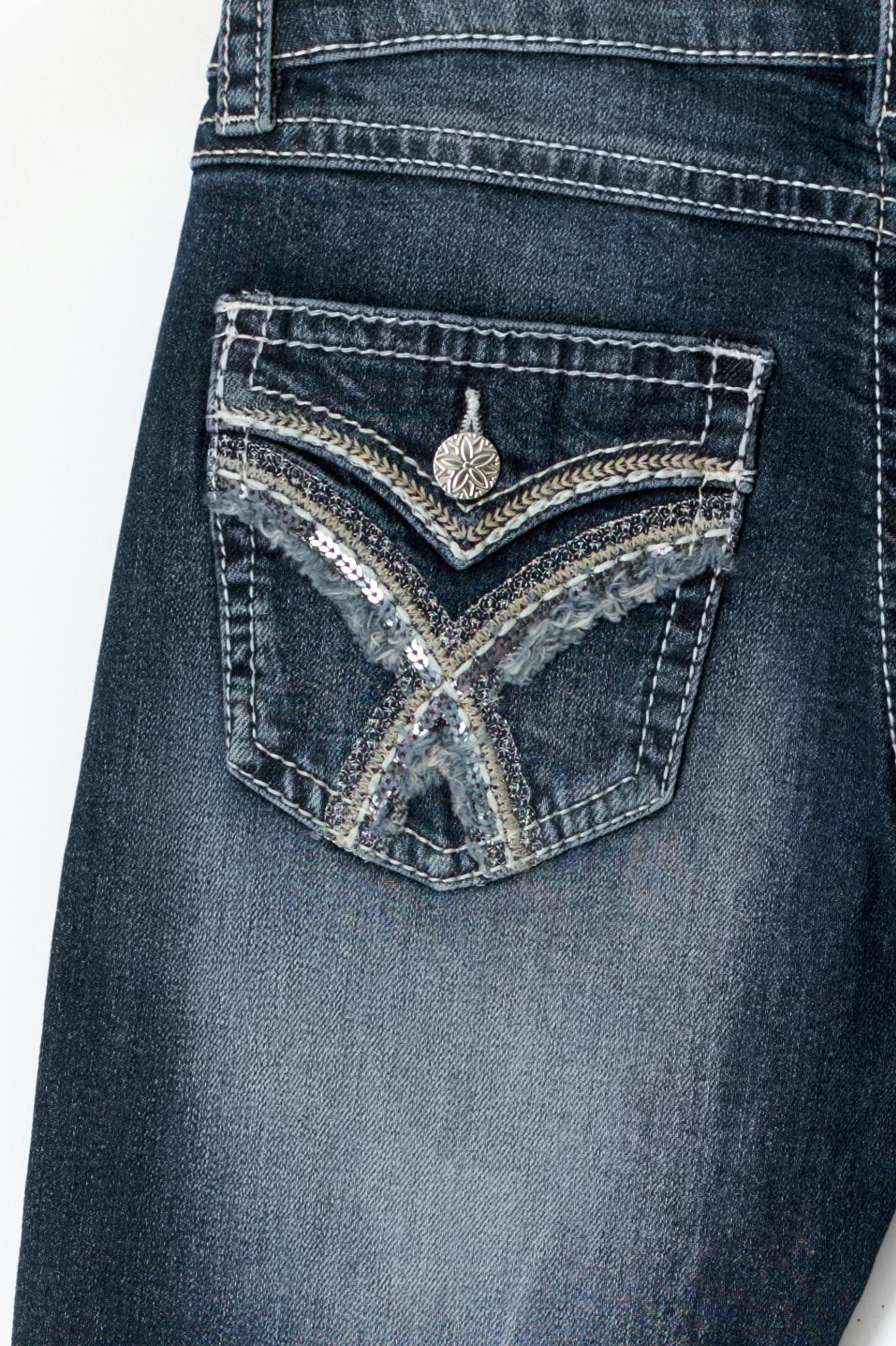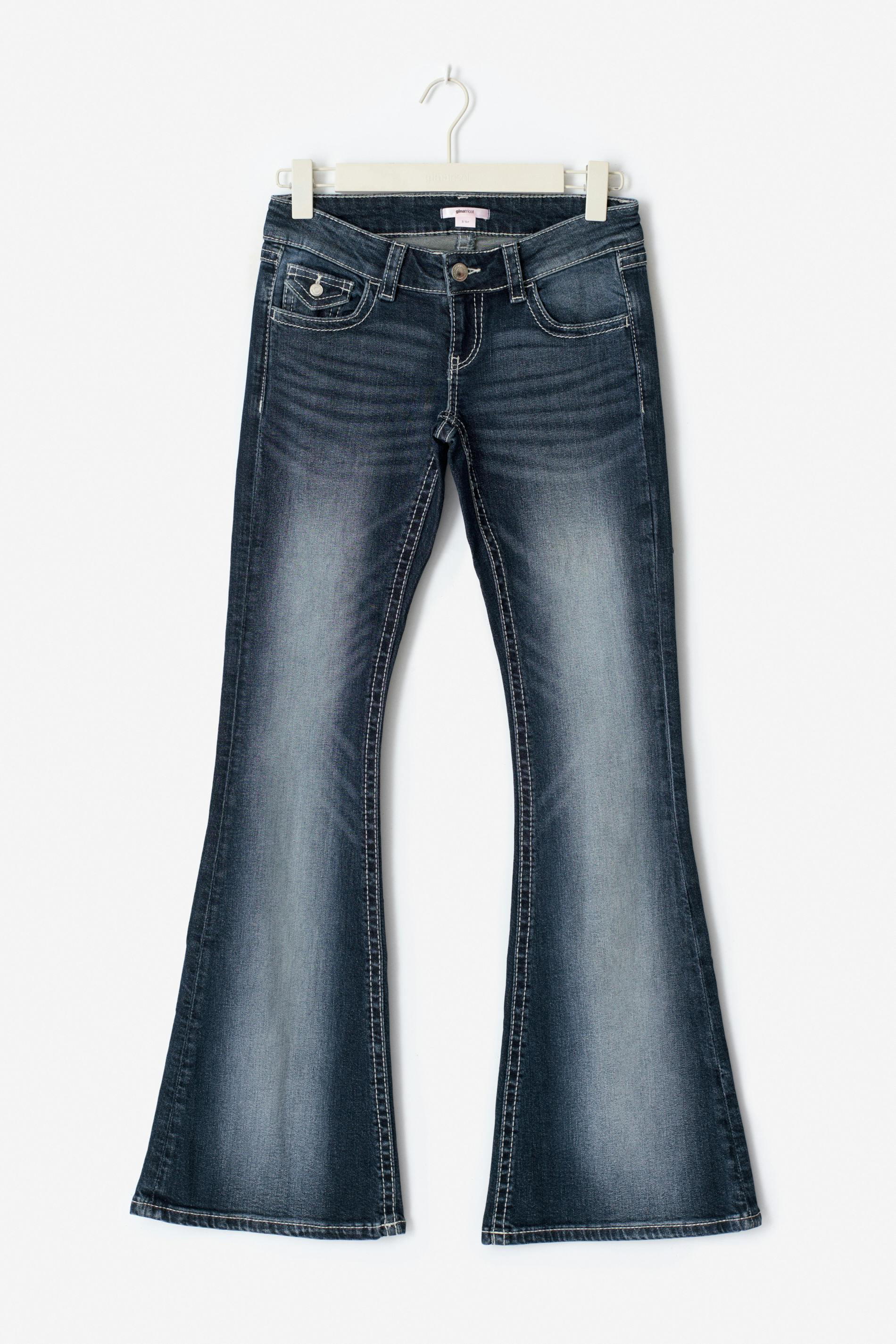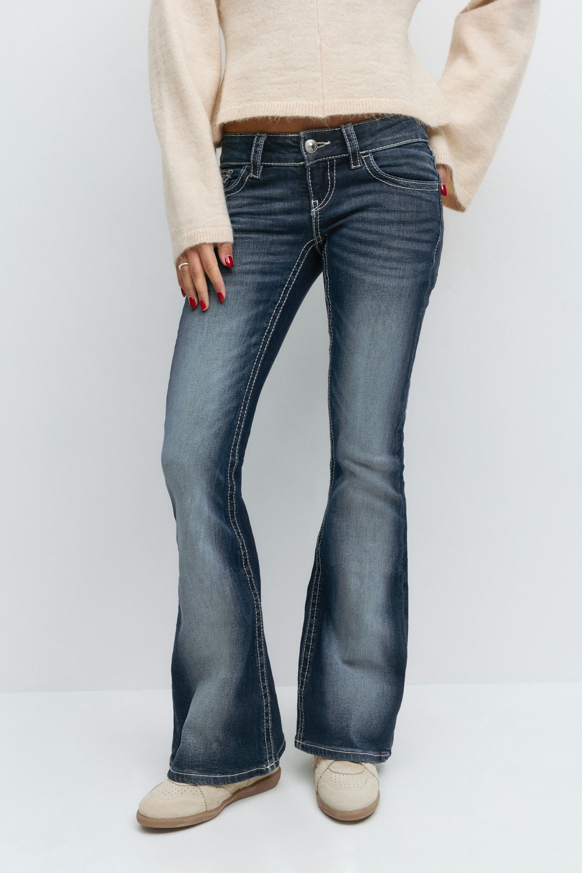 Bootcut jeans med låg midja. Jeansen är blåa och har dekorerade bakfickor med lock och knapp. De har utsvängda ben, låg stretch, justerbar resår i midjan och dragkedjegylf.