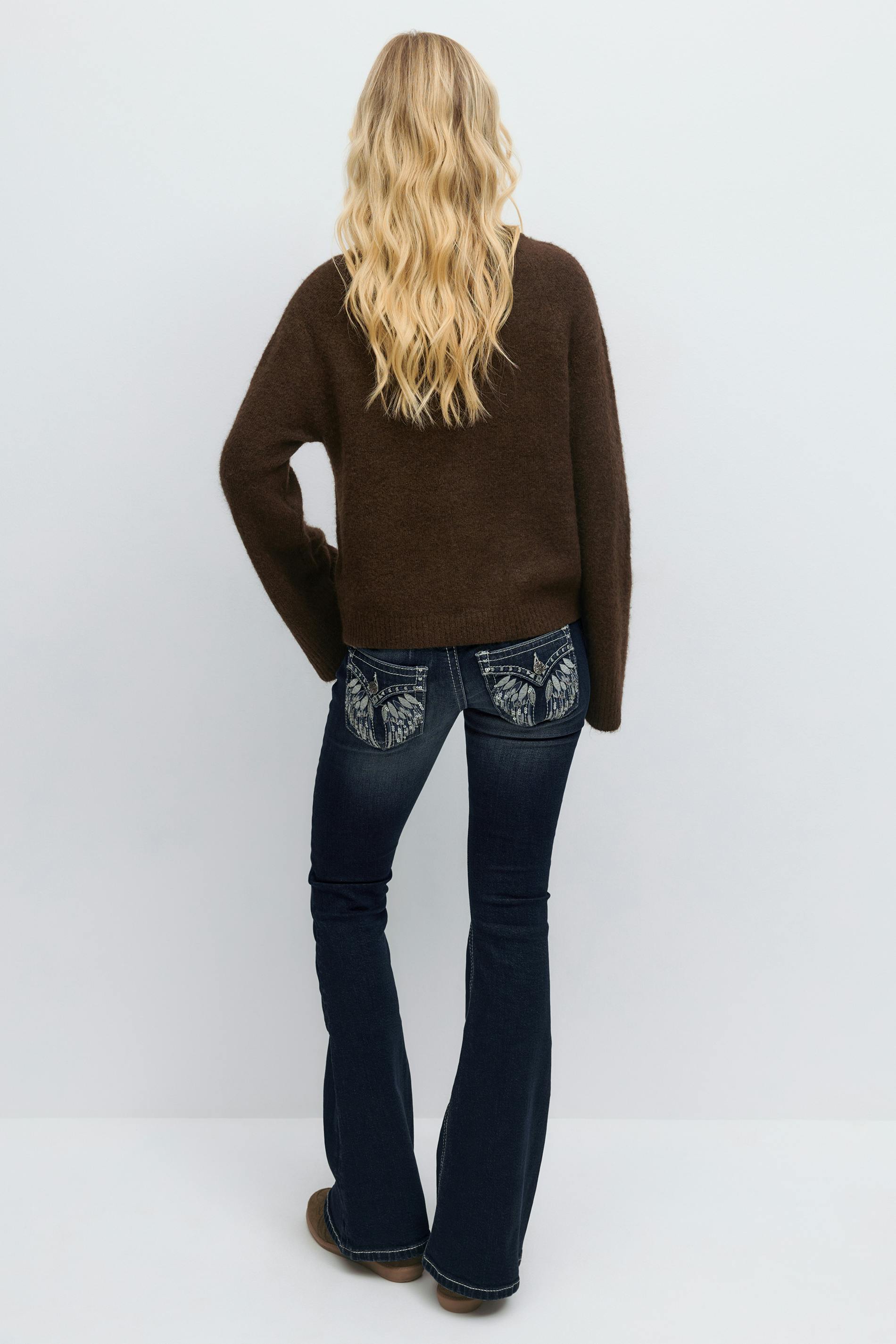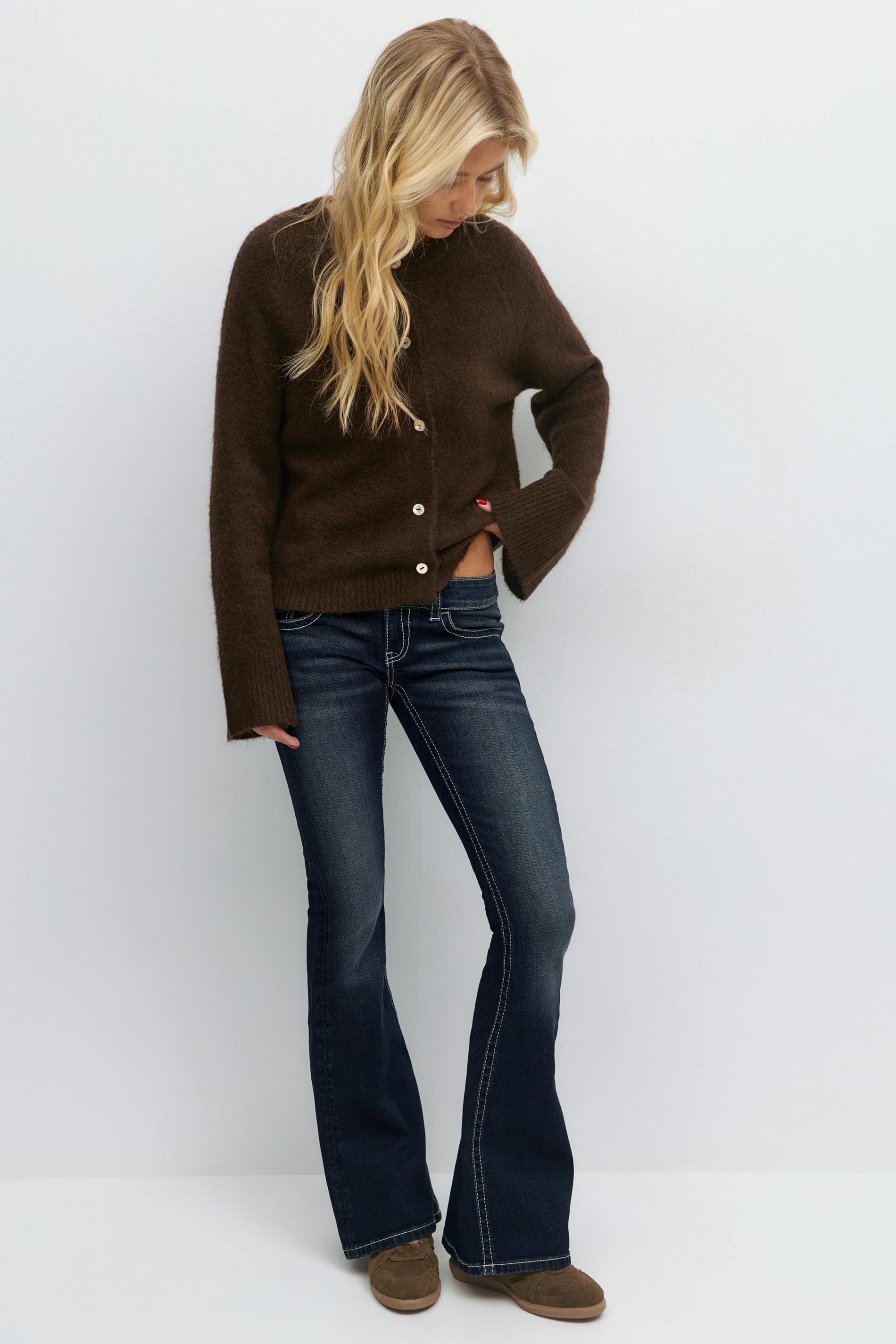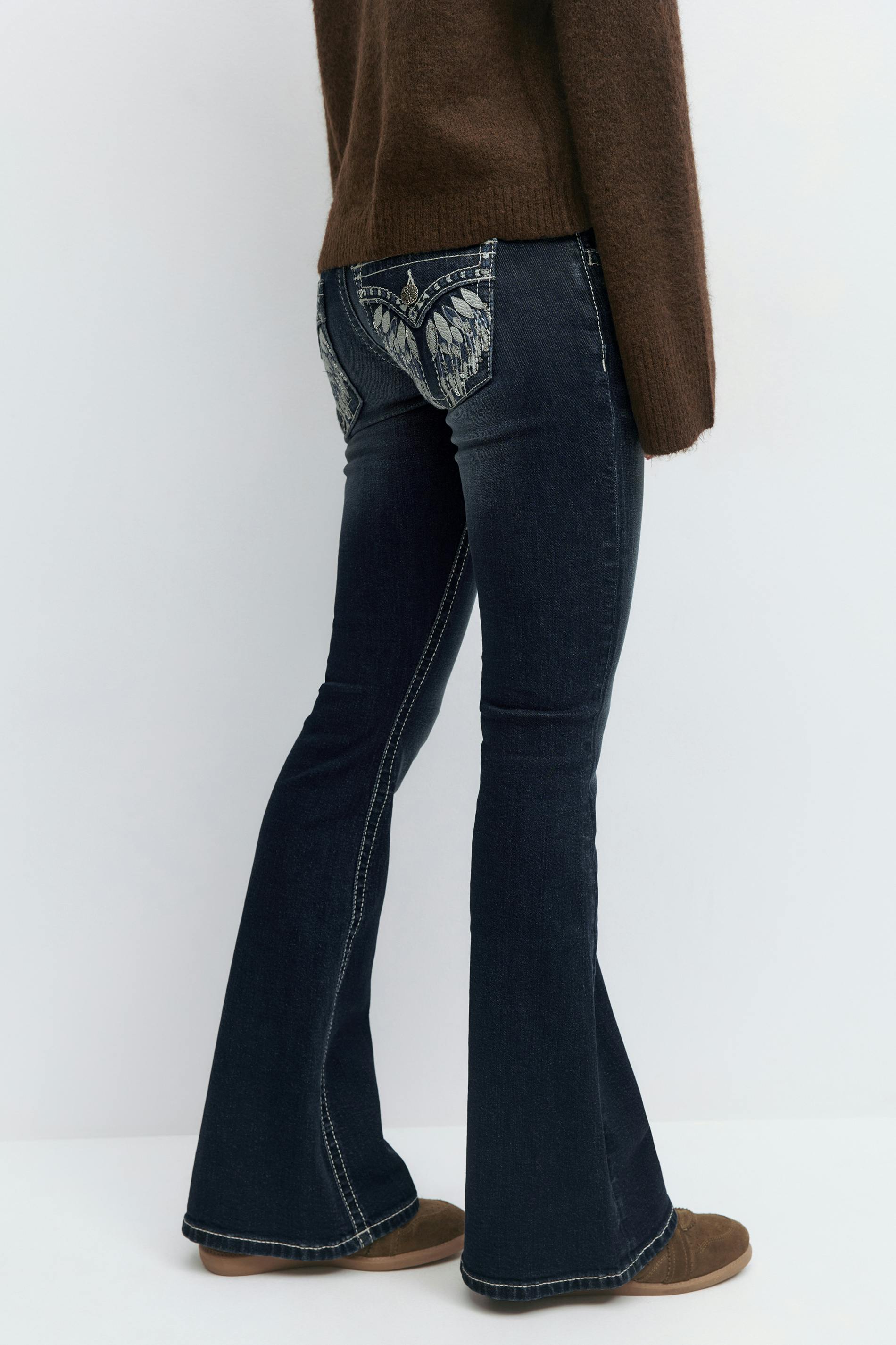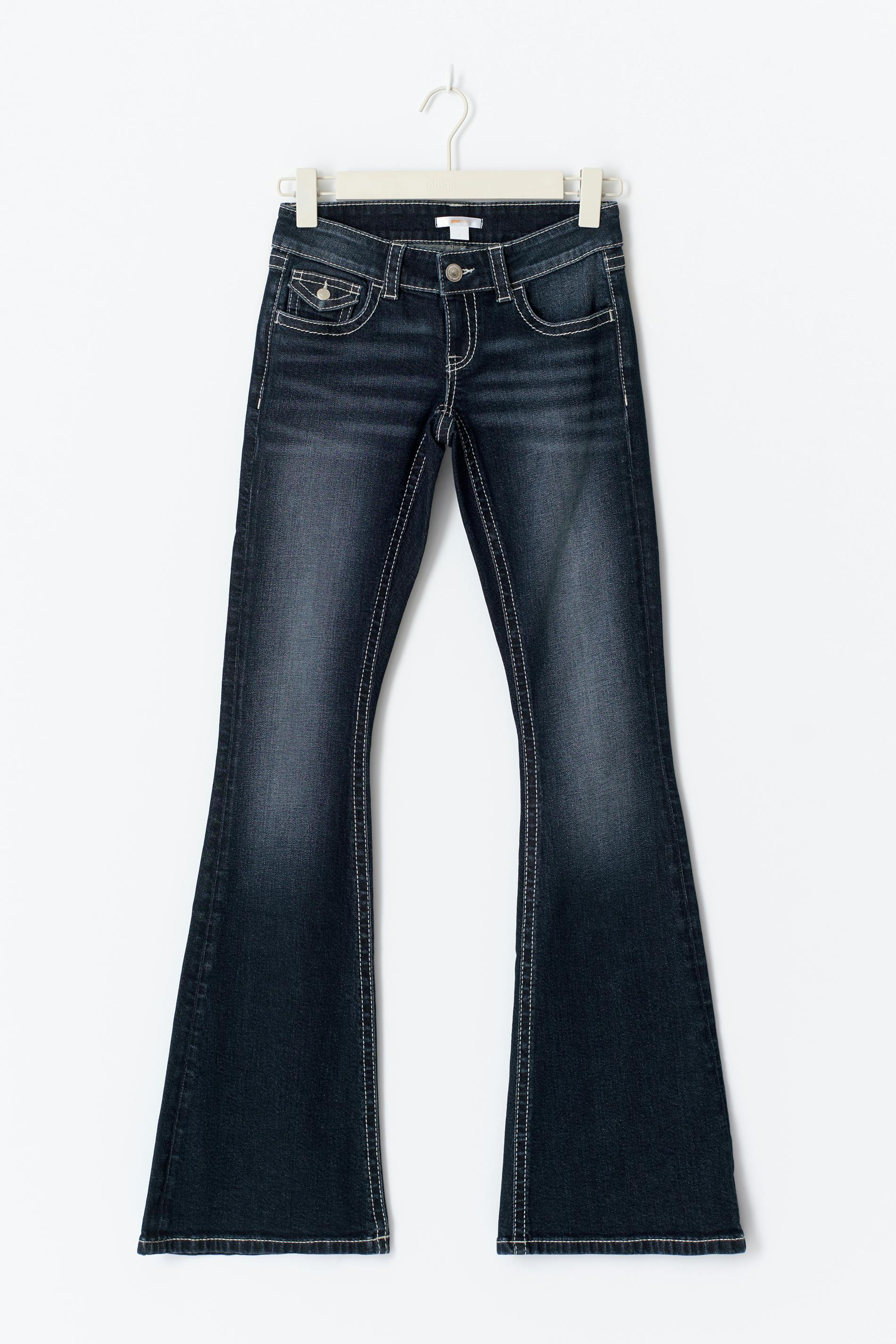 Bootcut jeans med låg midja. Jeansen är mörkblåa och har dekorerade bakfickor med lock och knapp. De har utsvängda ben, låg stretch, justerbar resår i midjan och dragkedjegylf.