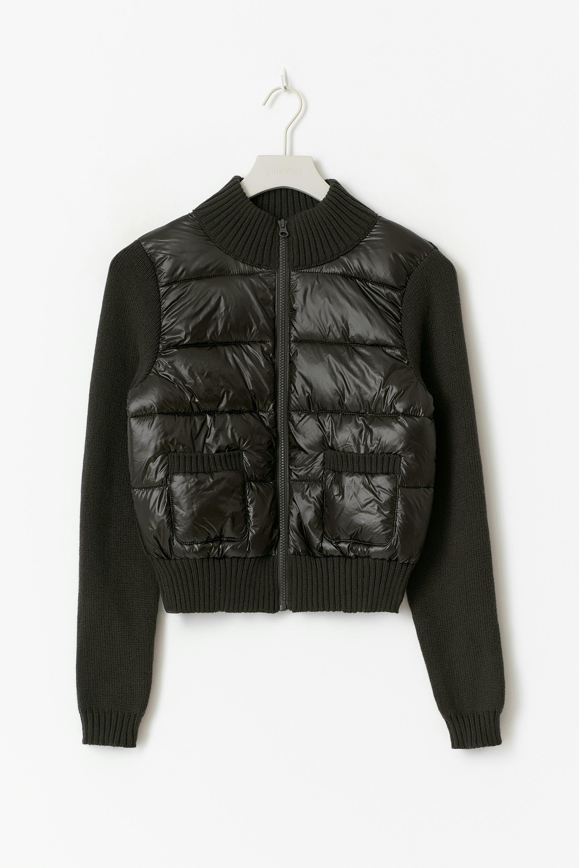 Quiltad lättviktsjacka med stickade ärmar. Jackan är svart och har fickor i sidorna. Den har rund halsringning, dragkedja framtill och bred, ribbad mudd vid ärmslut och i nederkant.