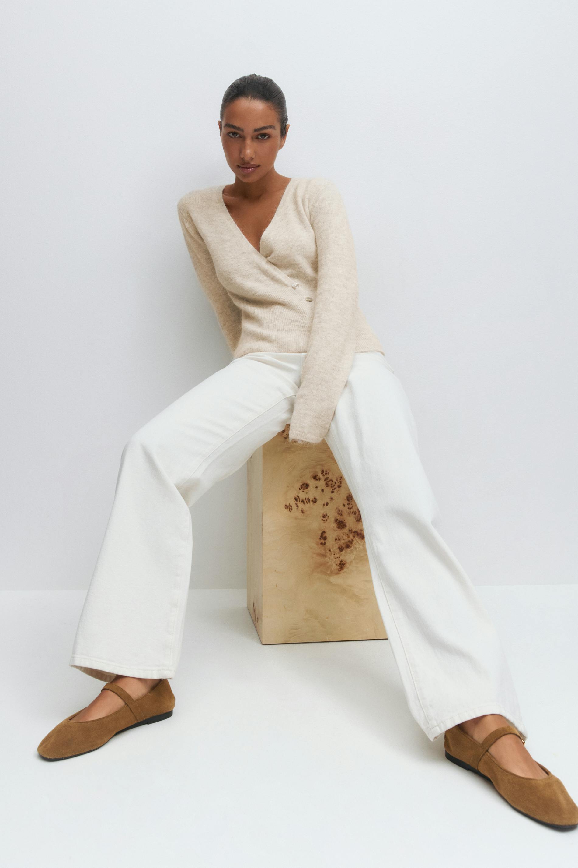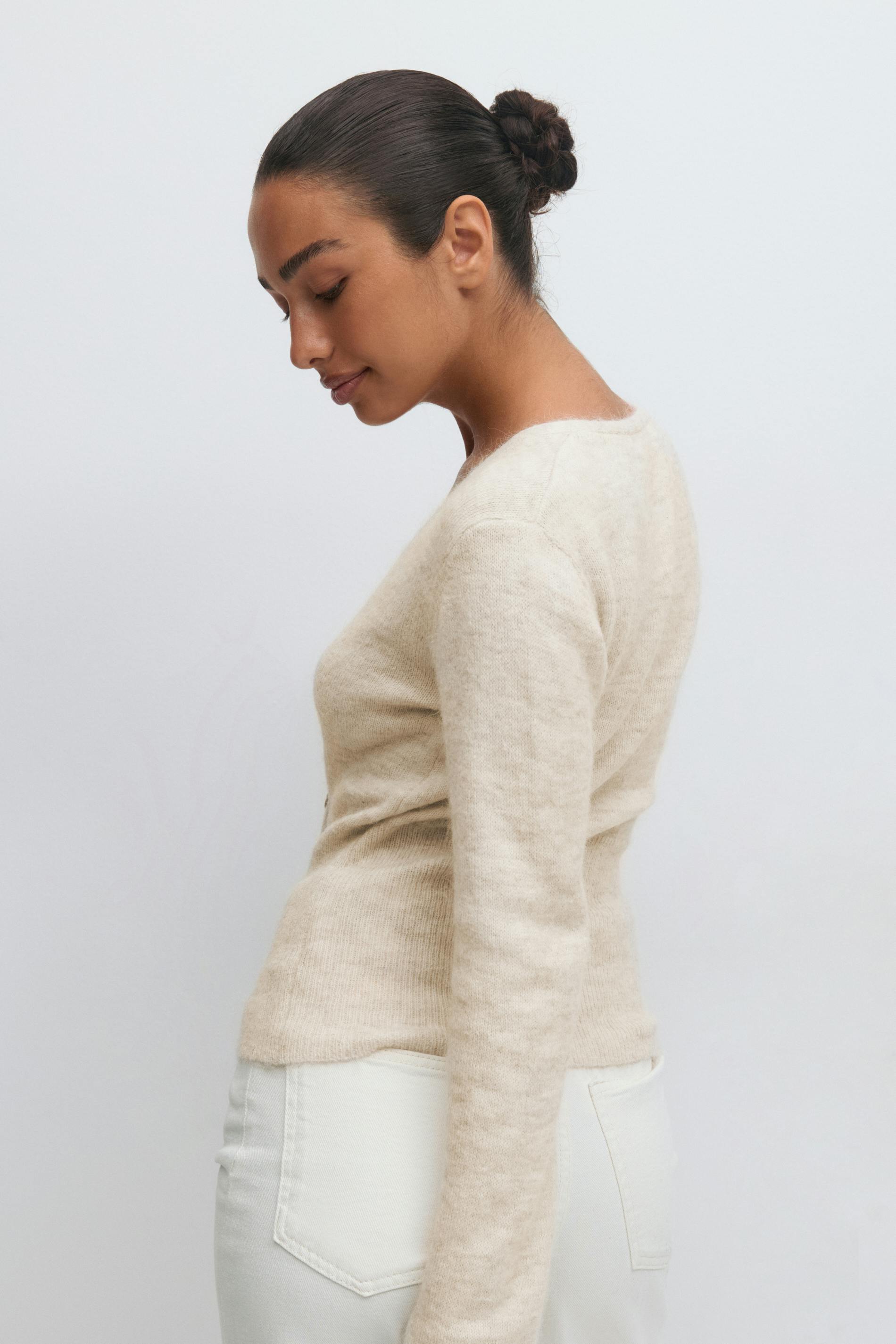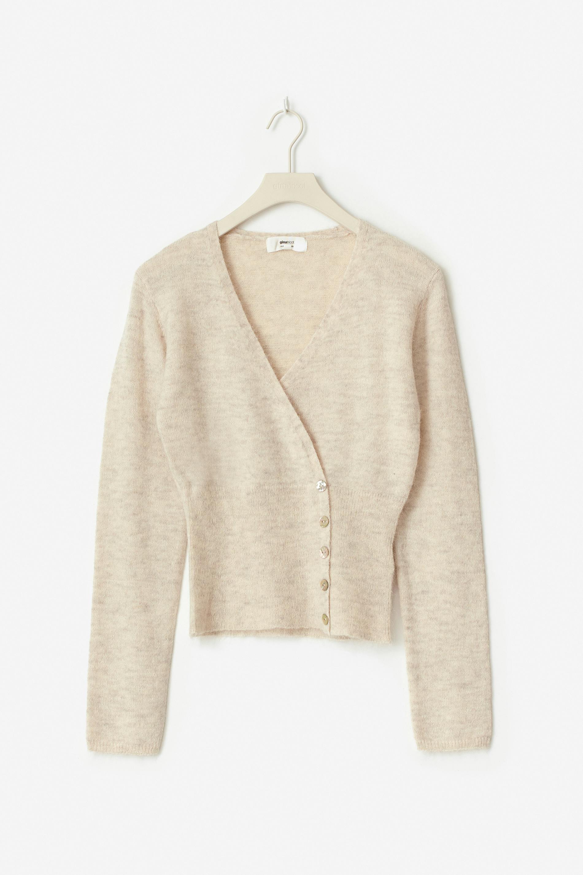 Stickad omlottkofta i alpackamix med v-ringning. Koftan är krämfärgad och har knappar i sidan. Den har normal passform, figurnära midja, lång ärm och bred ribbstickning i nederkant.