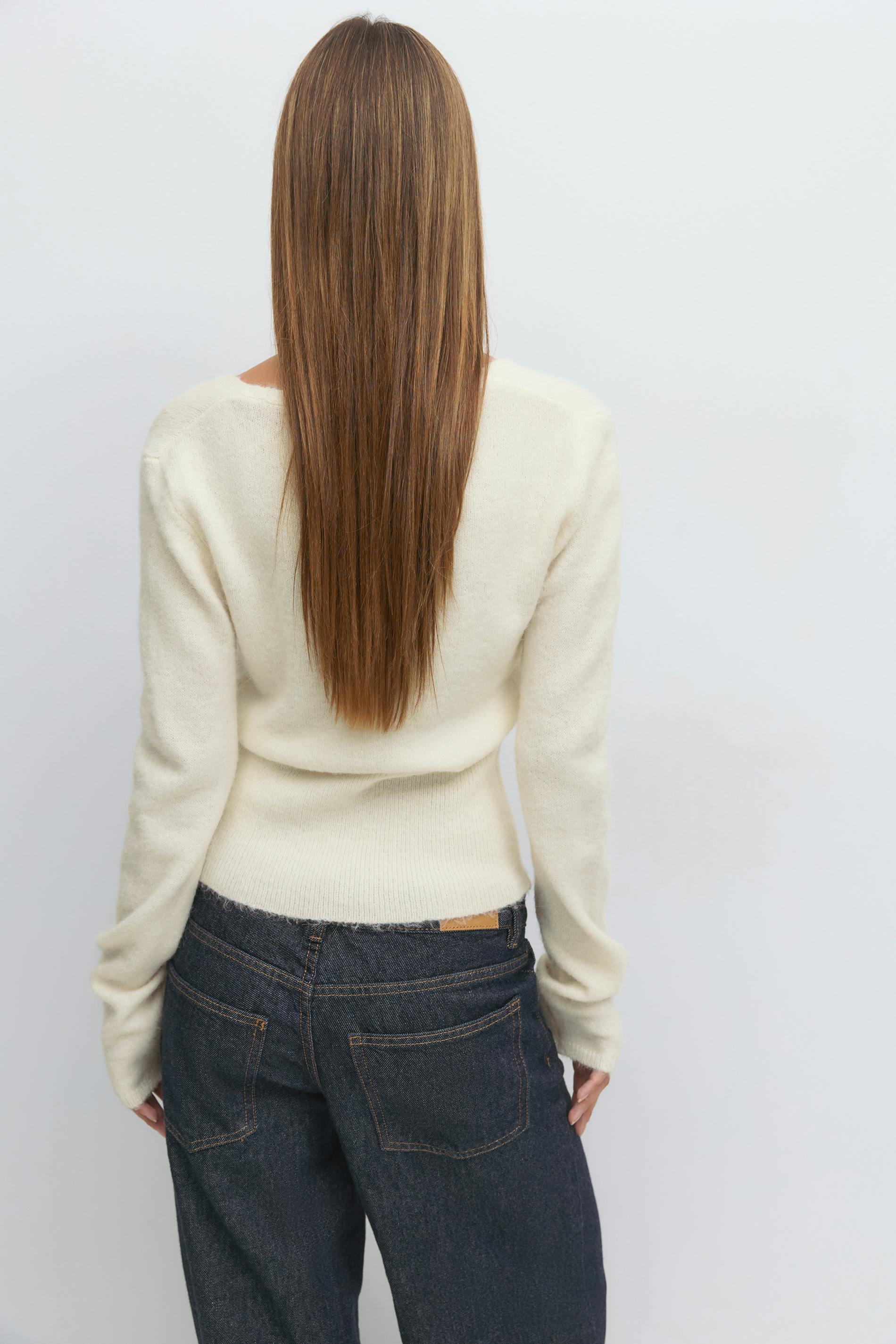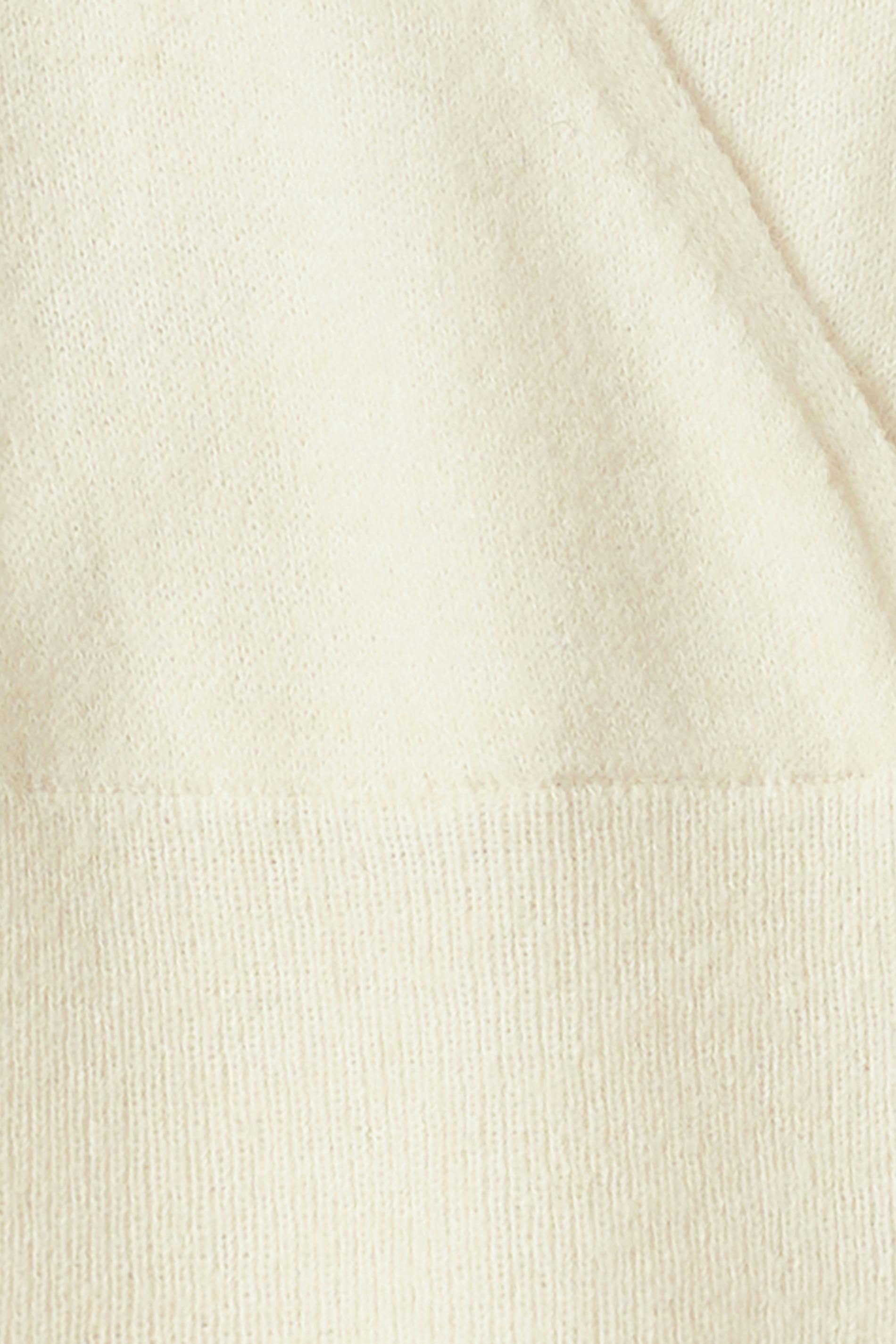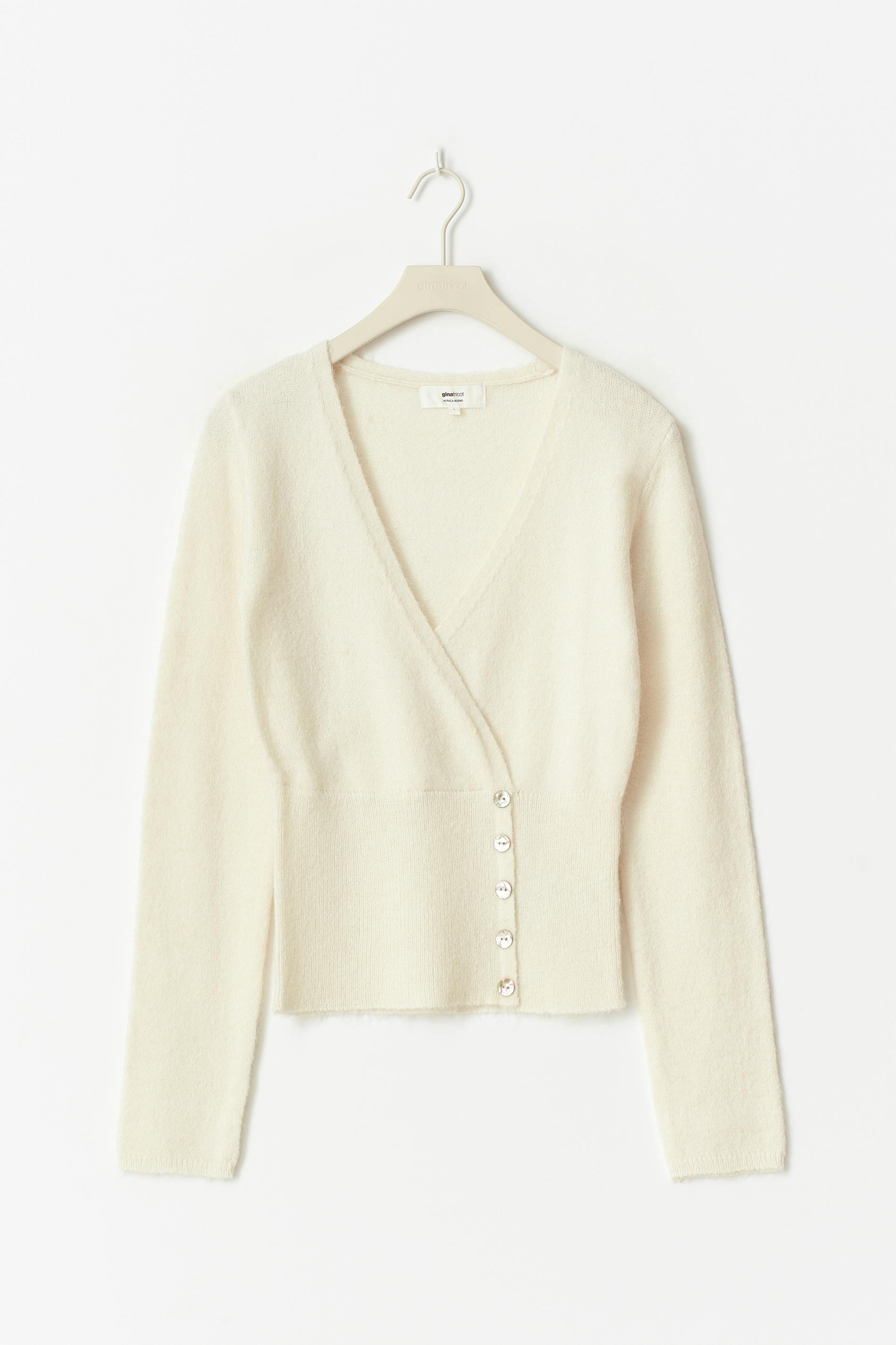 Stickad omlottkofta i alpackamix med v-ringning. Koftan är vit och har knappar i sidan. Den har normal passform, figurnära midja, lång ärm och bred ribbstickning i nederkant.
