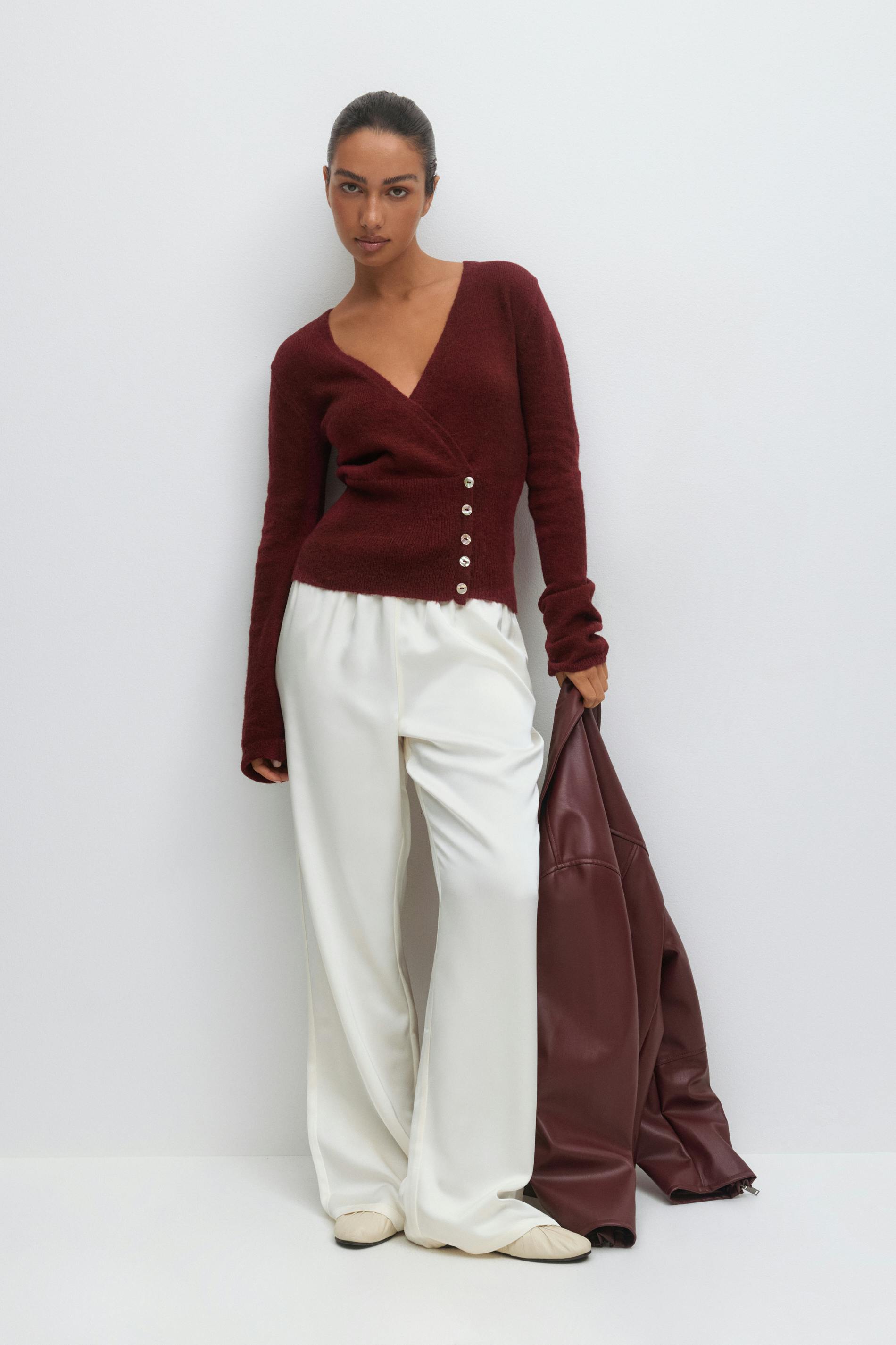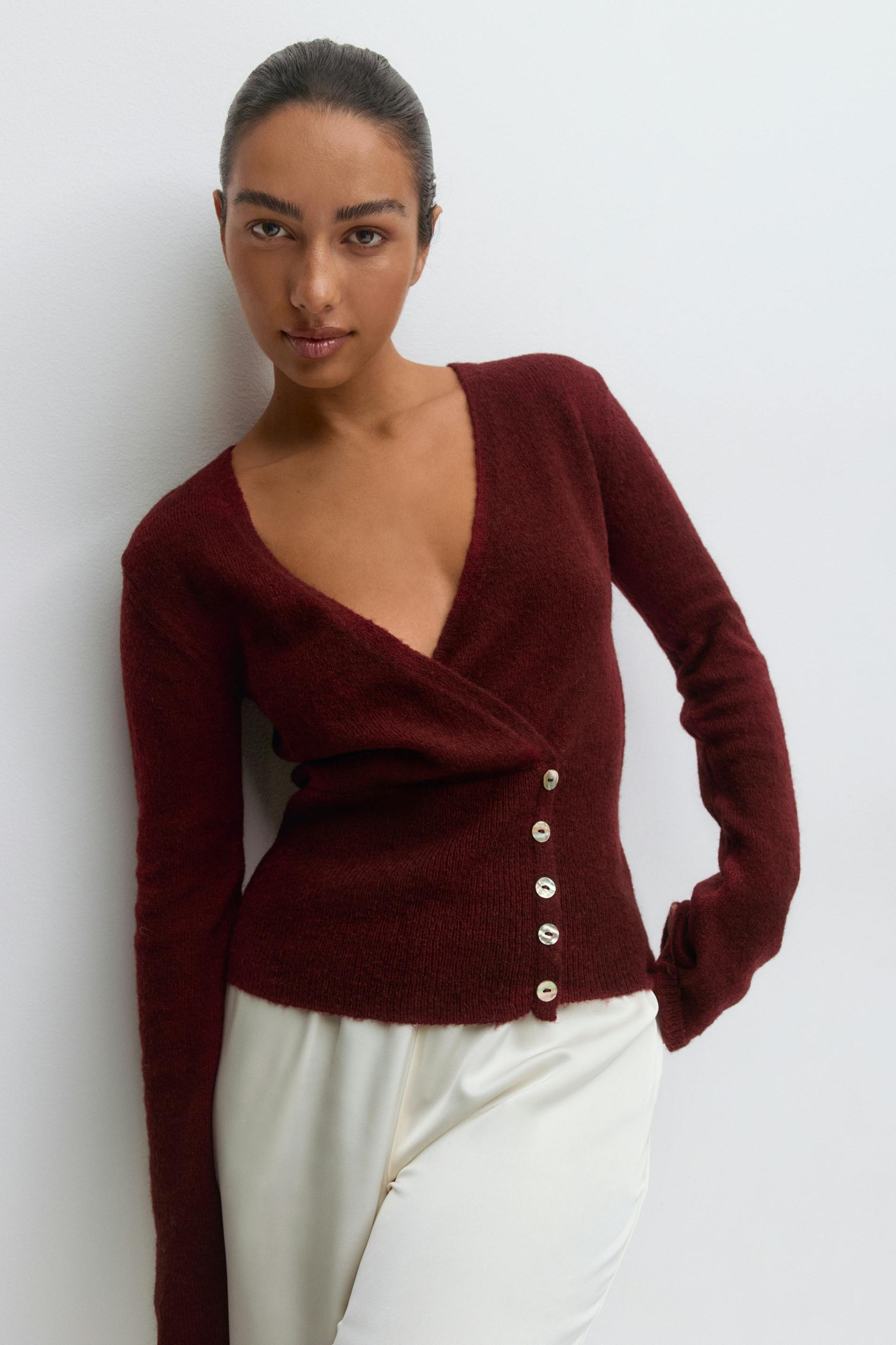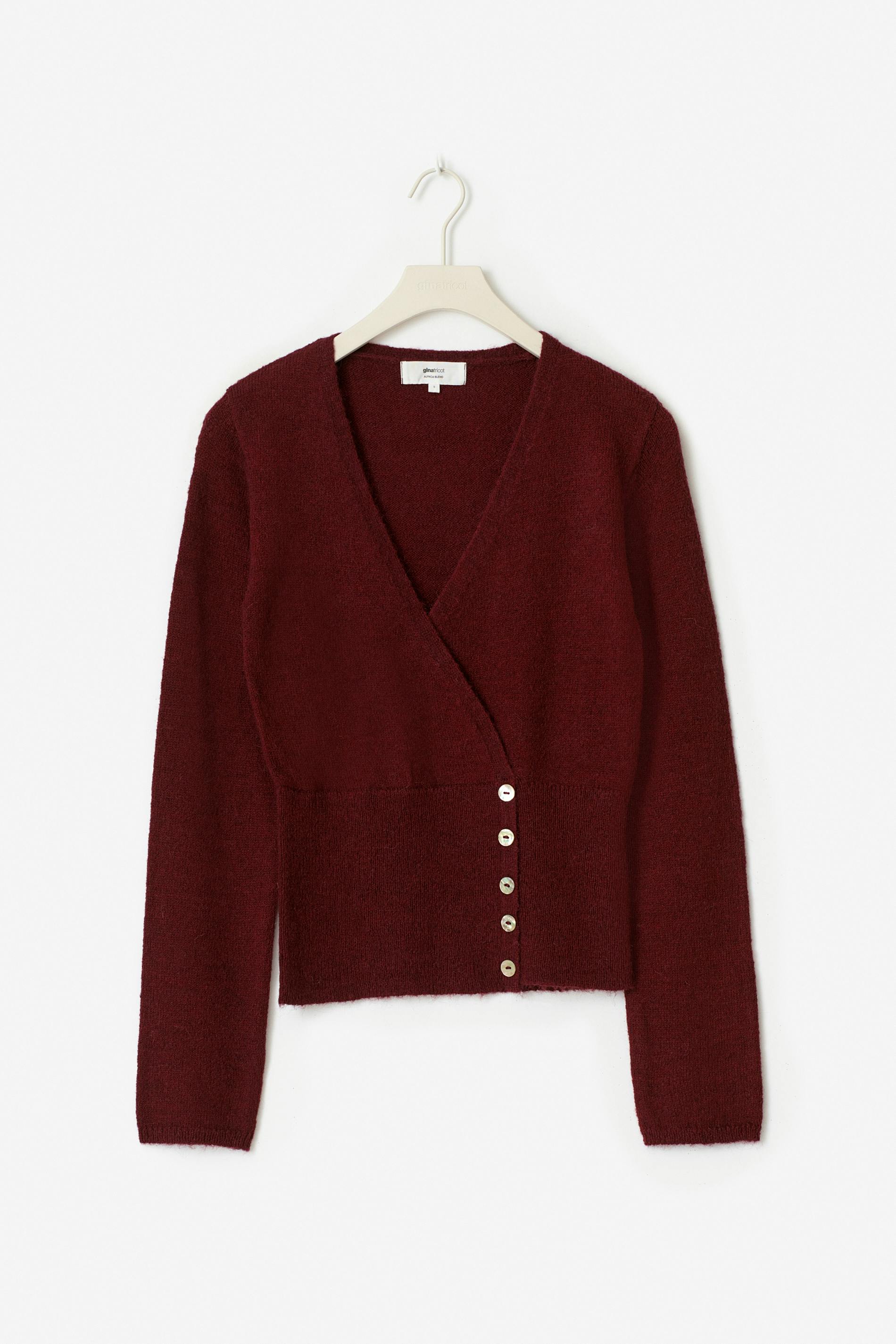 Stickad omlottkofta i alpackamix med v-ringning. Koftan är vinröd och har knappar i sidan. Den har normal passform, figurnära midja, lång ärm och bred ribbstickning i nederkant.