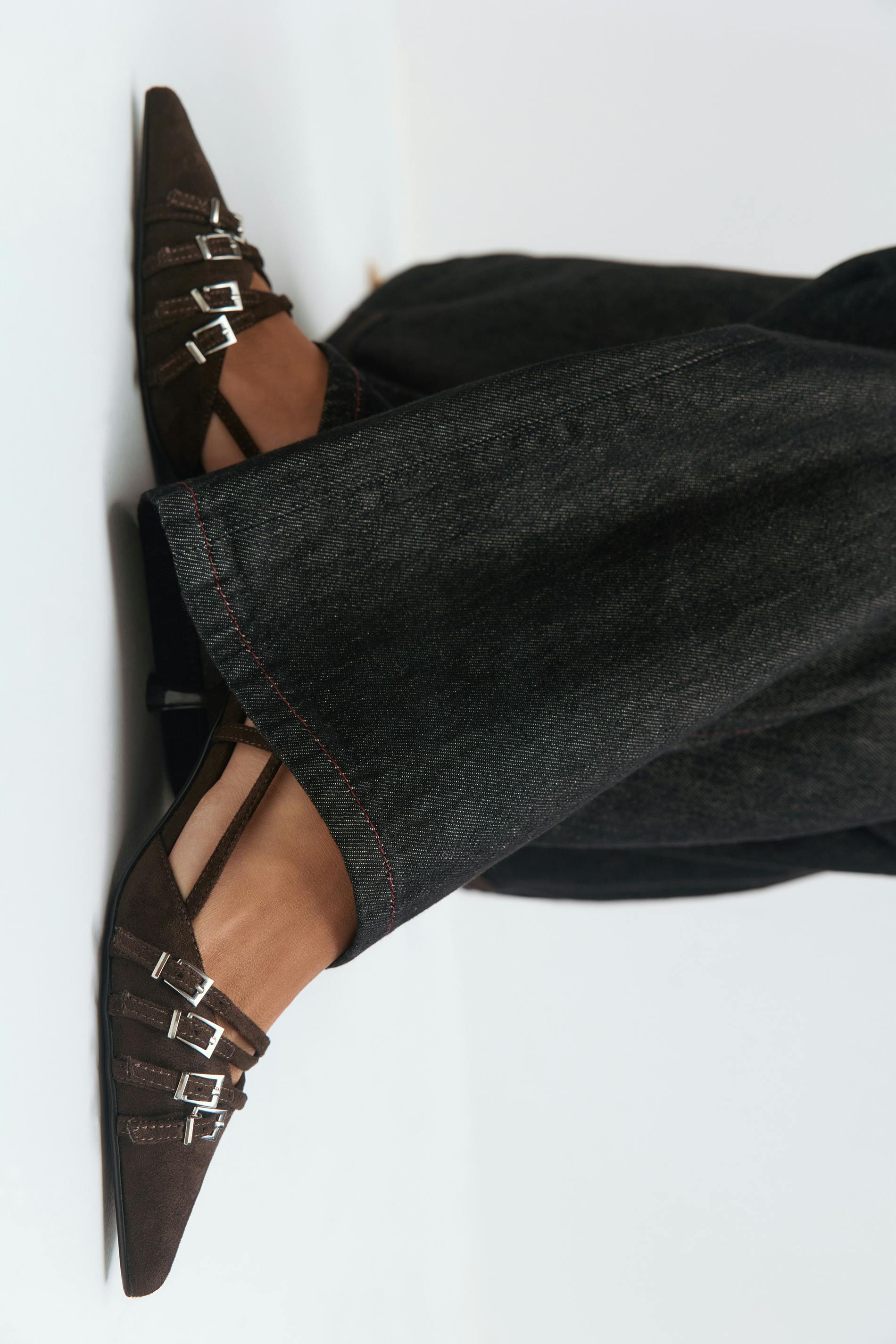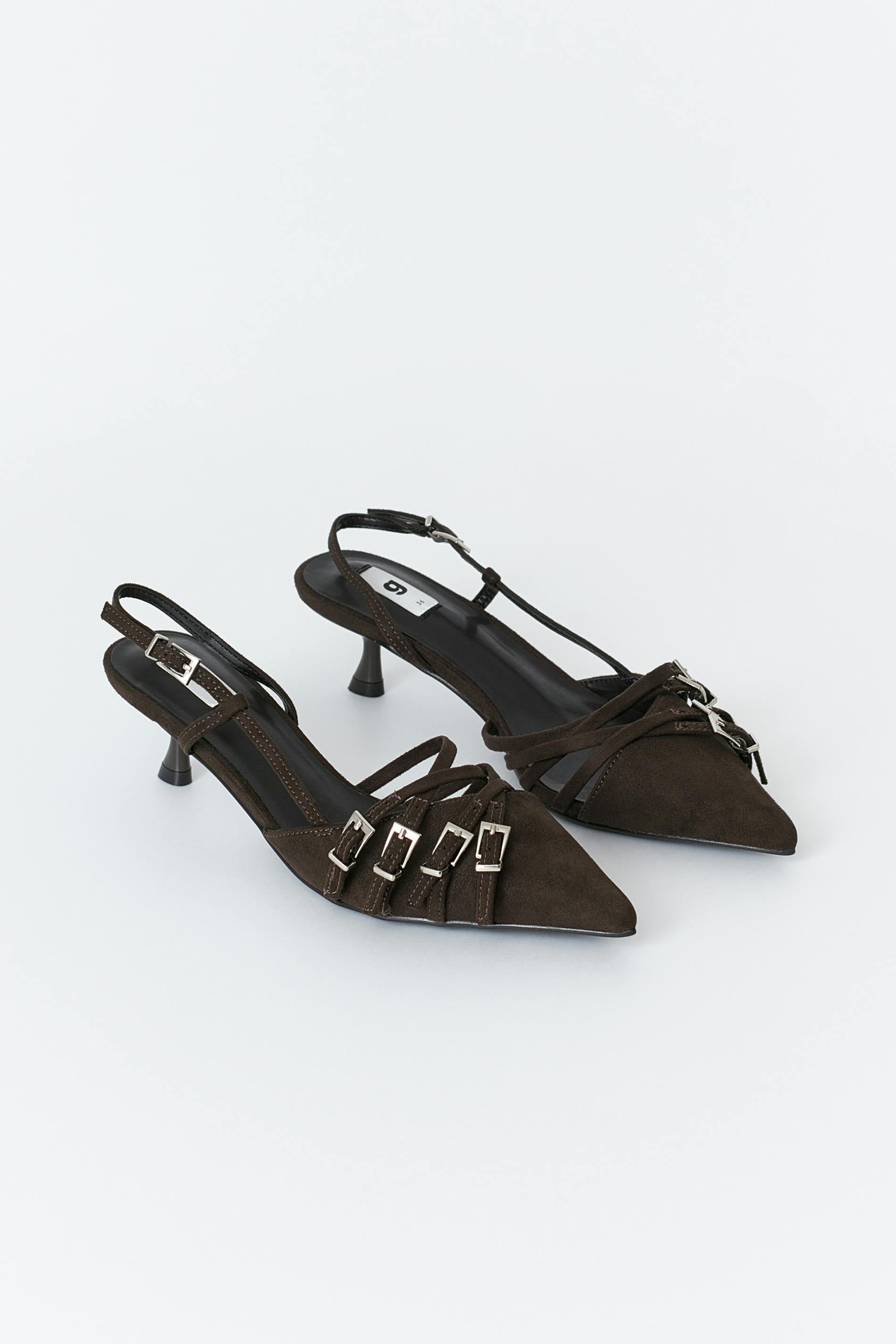 Glansiga klackskor med slingbacks. Skorna är bruna och har en spetsig tå. De har metallspännen fram och bak.