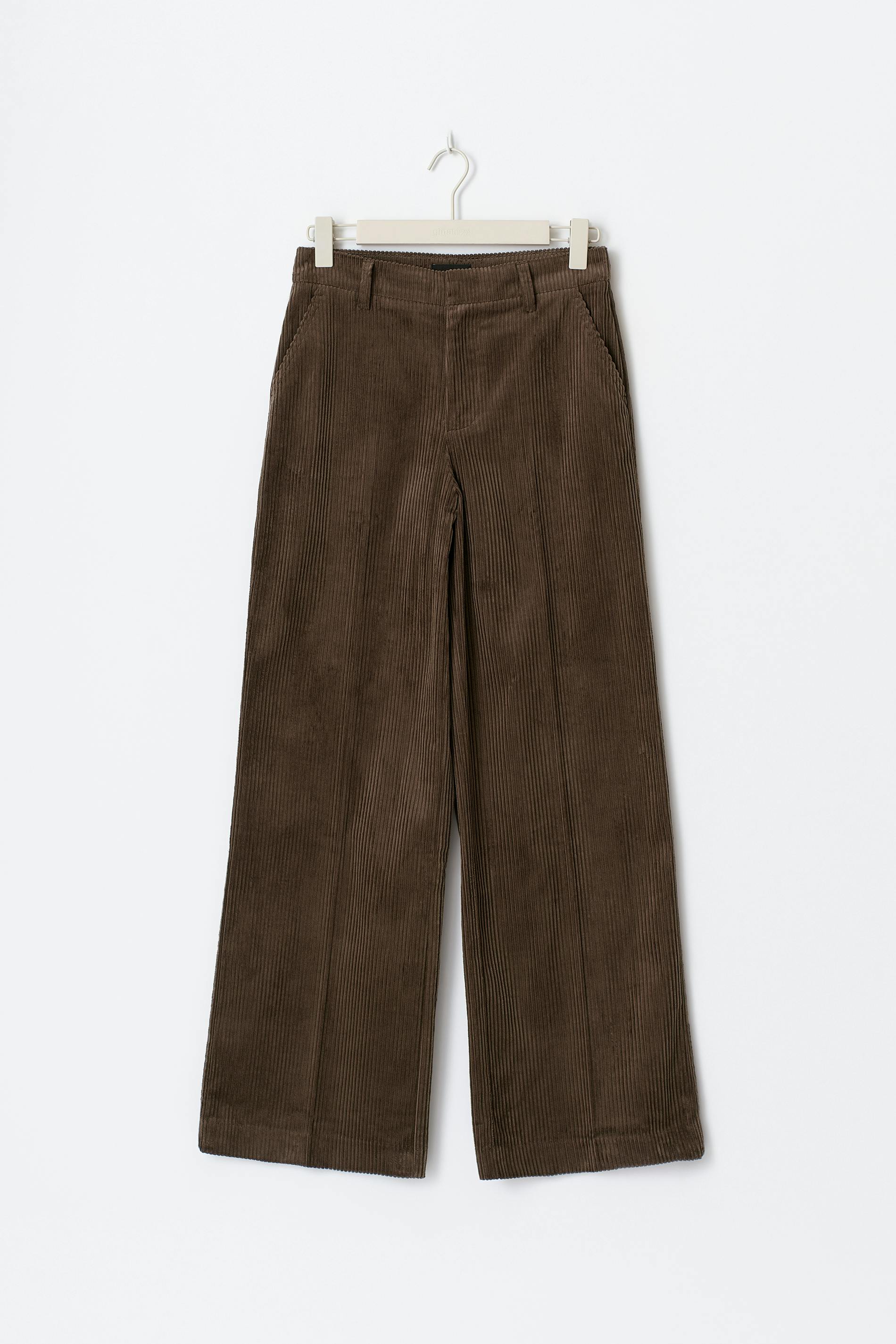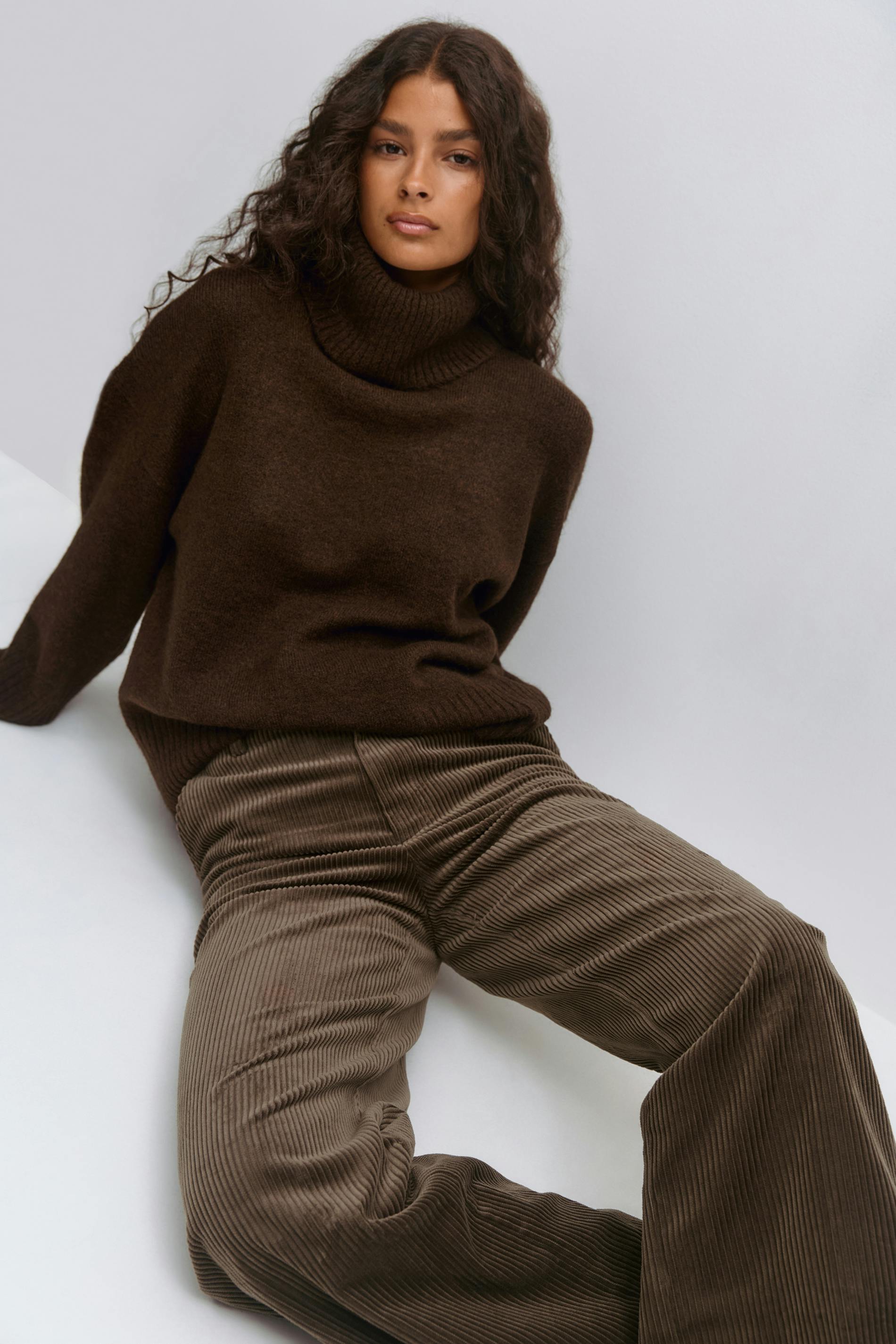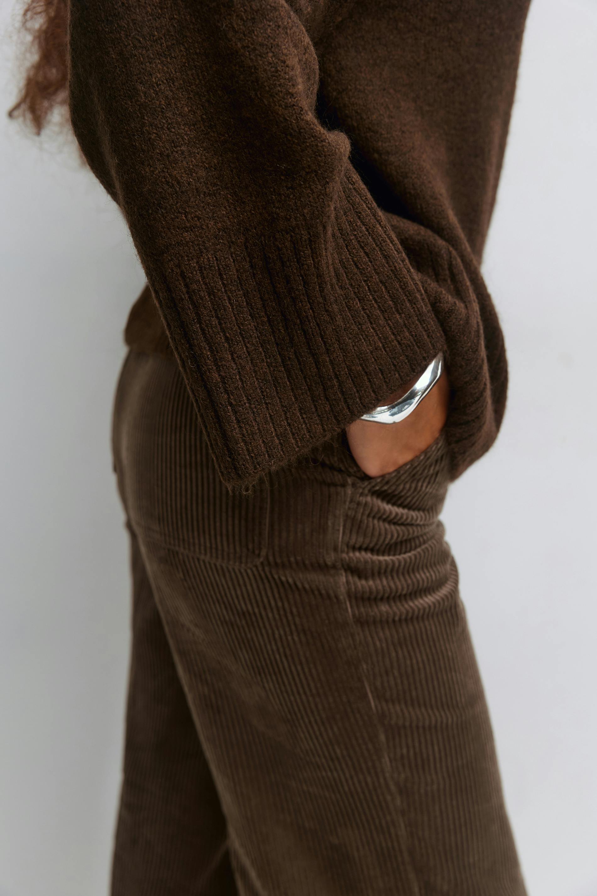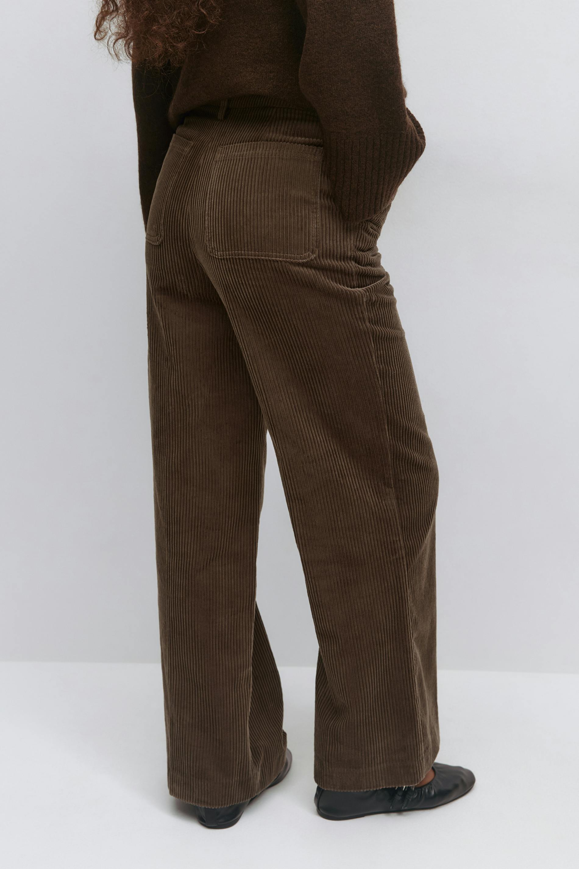 Manchesterbyxor med hög midja. Byxorna är bruna och har vida ben med fullängd. De har normal passform, dragkedjegylf, hysk- och hakestängning framtill och fickor fram och bak.