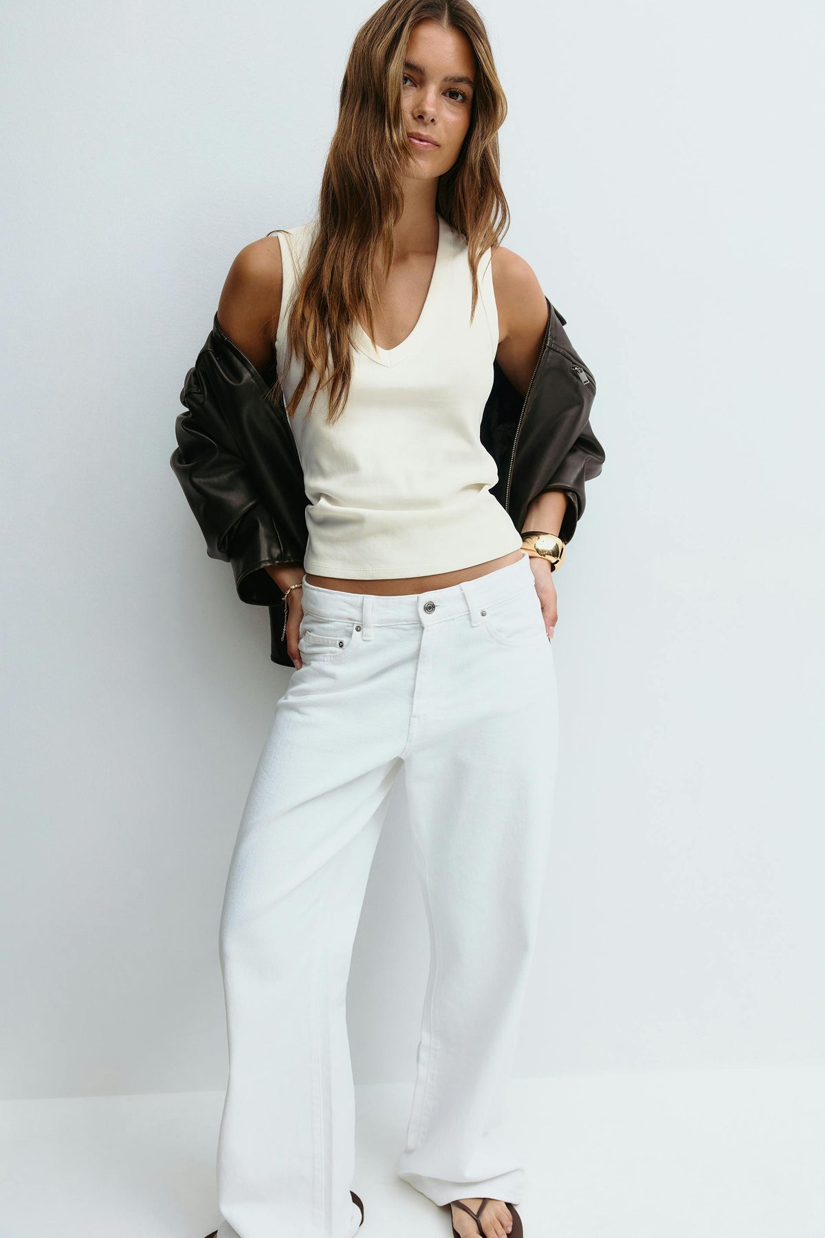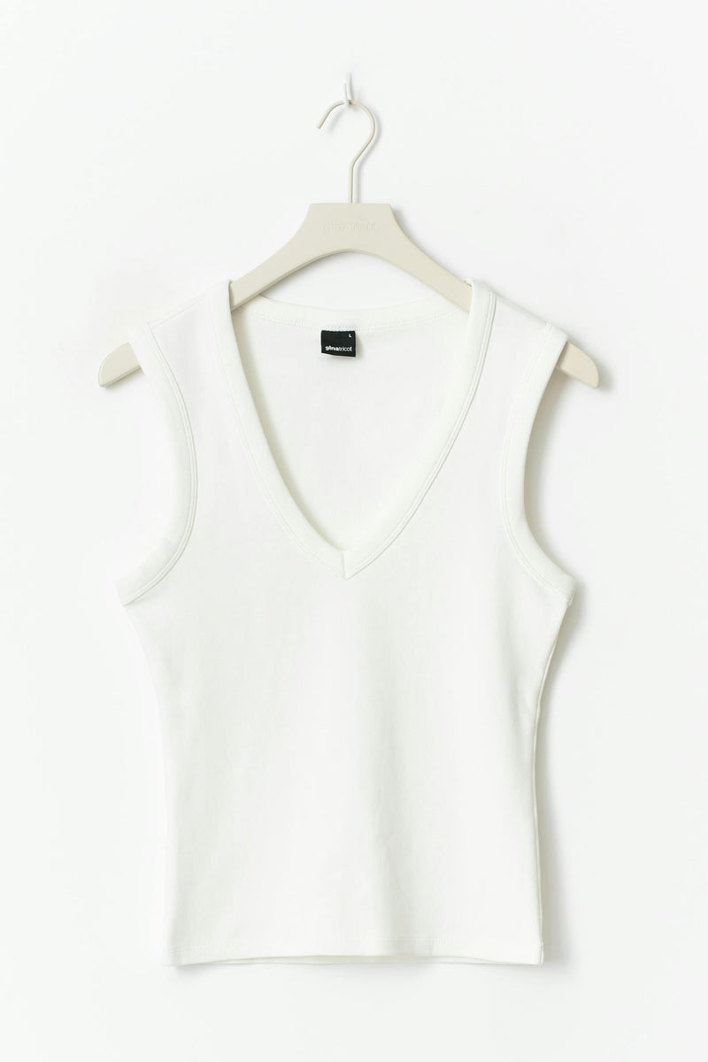 Ribbed tank with v-neck. The tank is white and has figure-hugging fit. It has sleeveless design and short length.