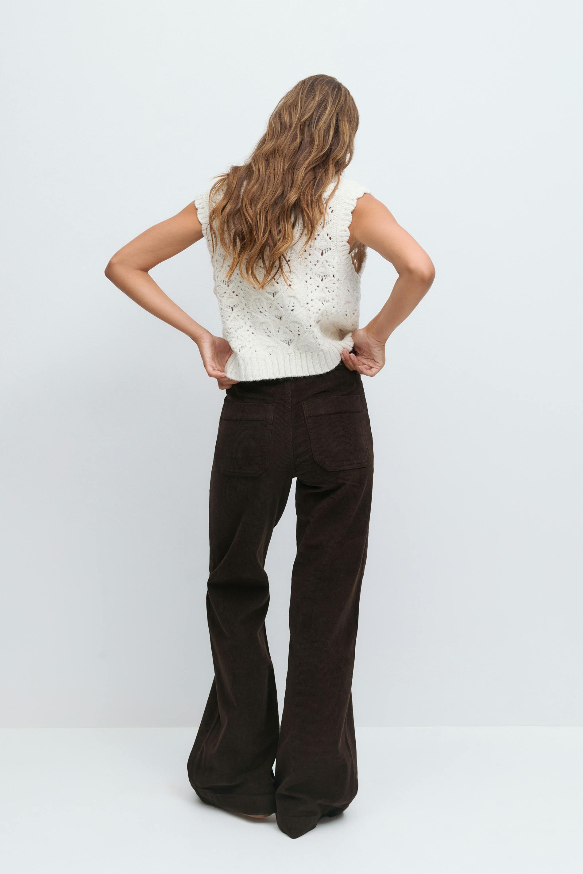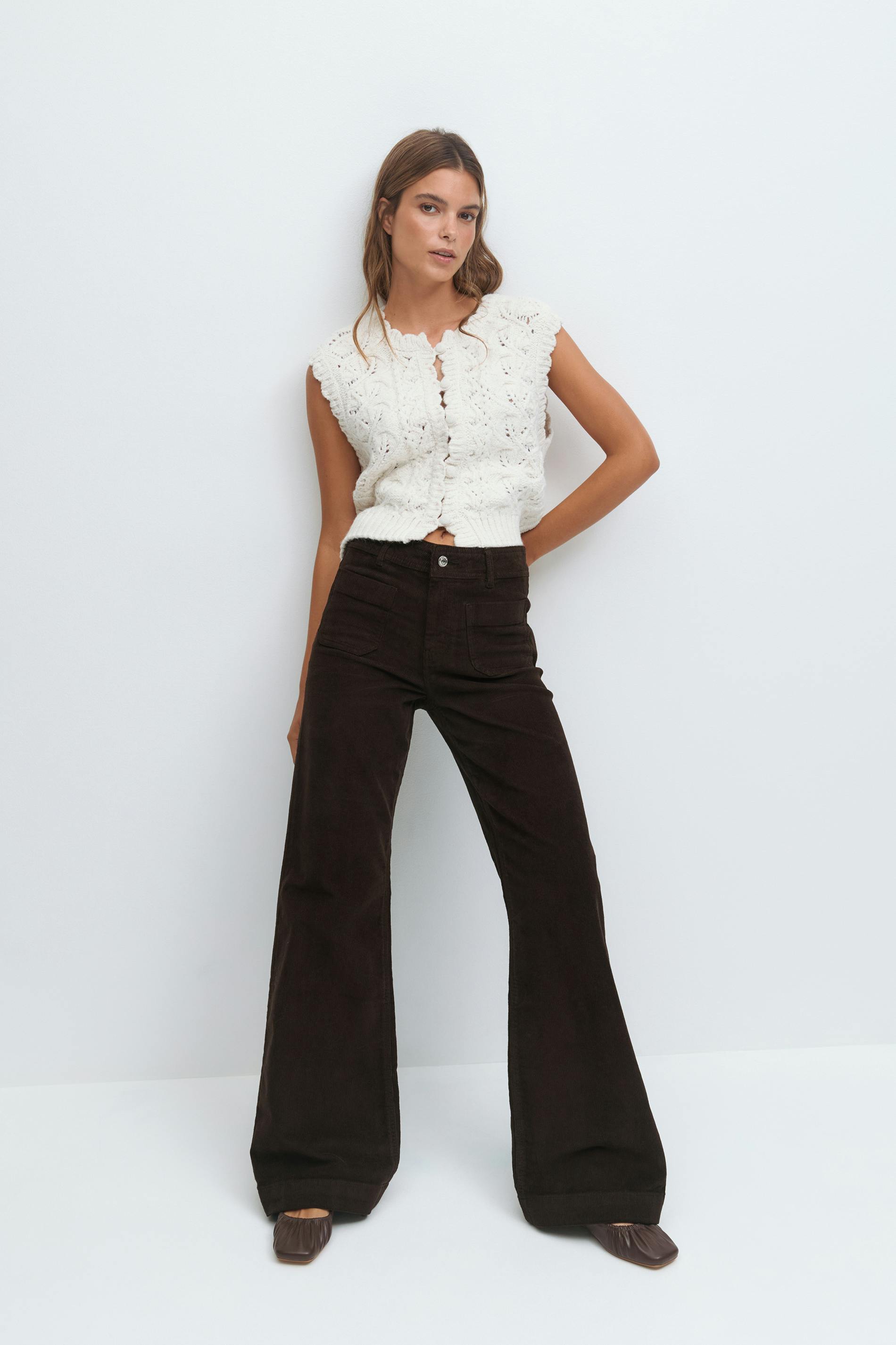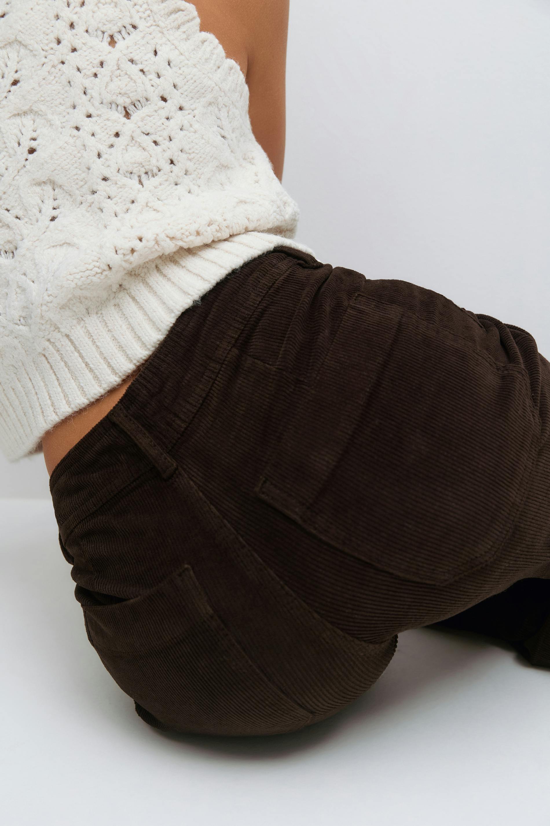 Manchesterbyxor med påsydda framfickor. Byxorna är bruna och har hög midja. De har utsvängda ben, figurnära passform, stretchig kvalitet, bakfickor och bälteshällor.