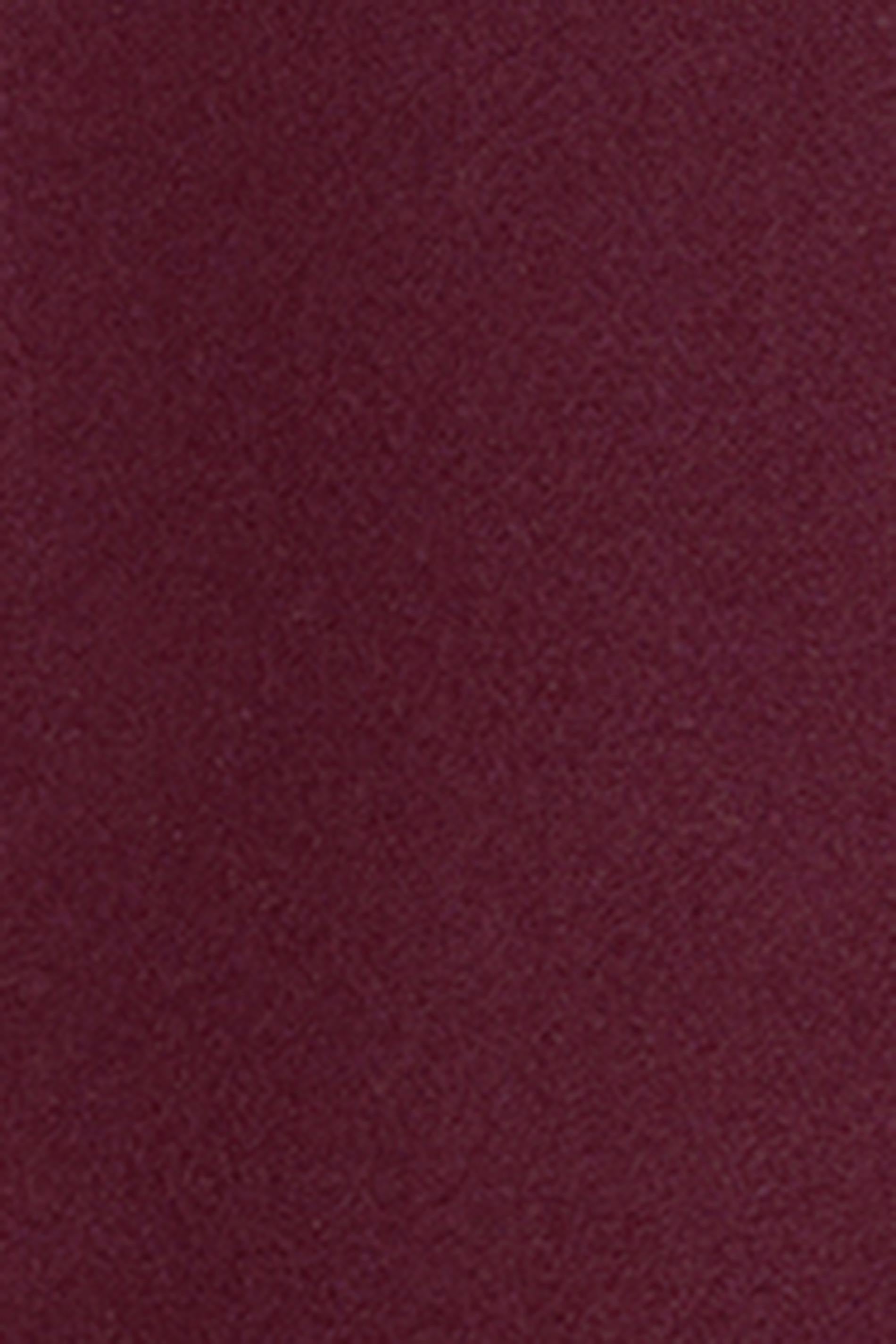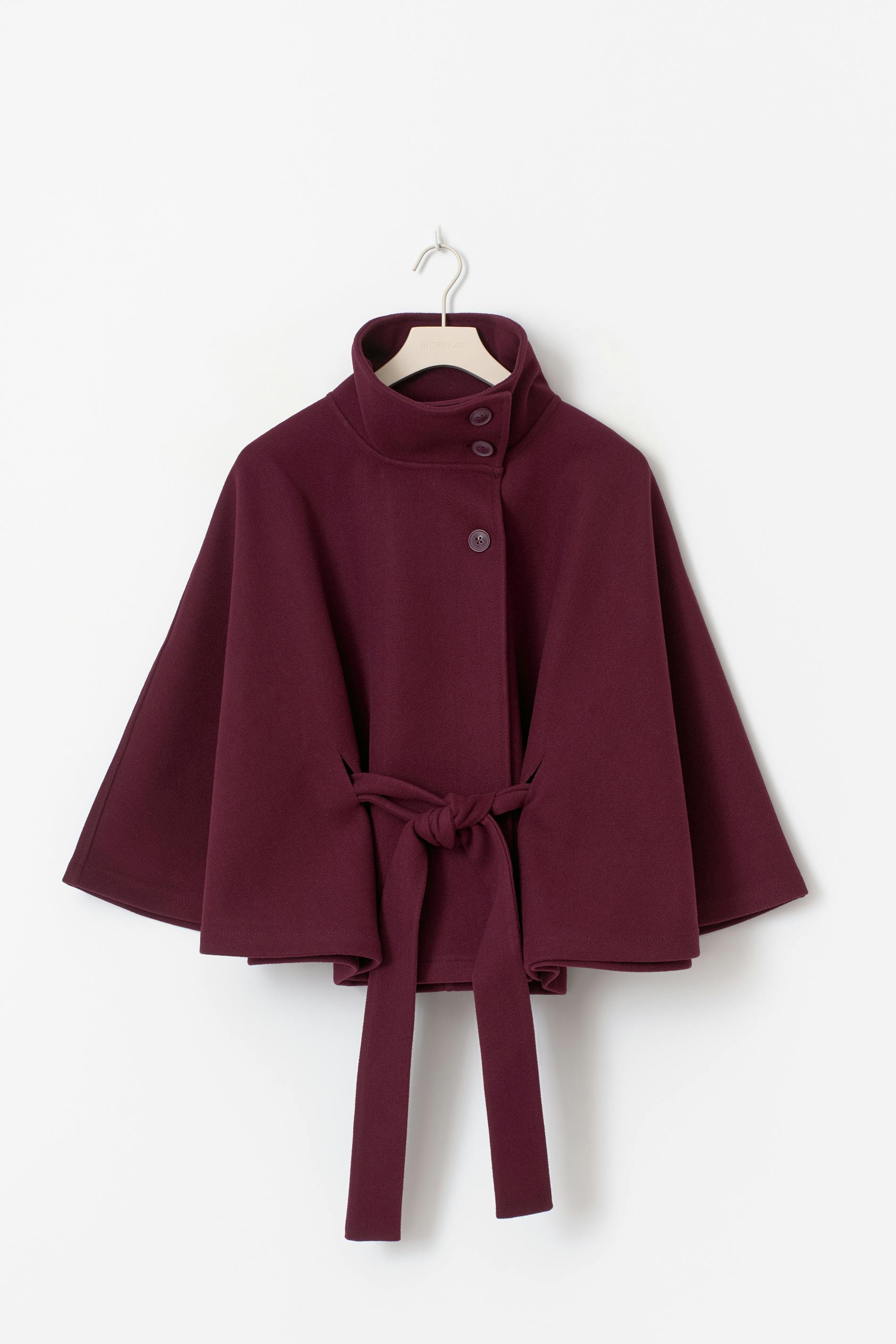 Cape med knytskärp i midjan. Kappan är vinröd och har långa, vida ärmar. Den har oversize fit, hög krage och knappar upptill.