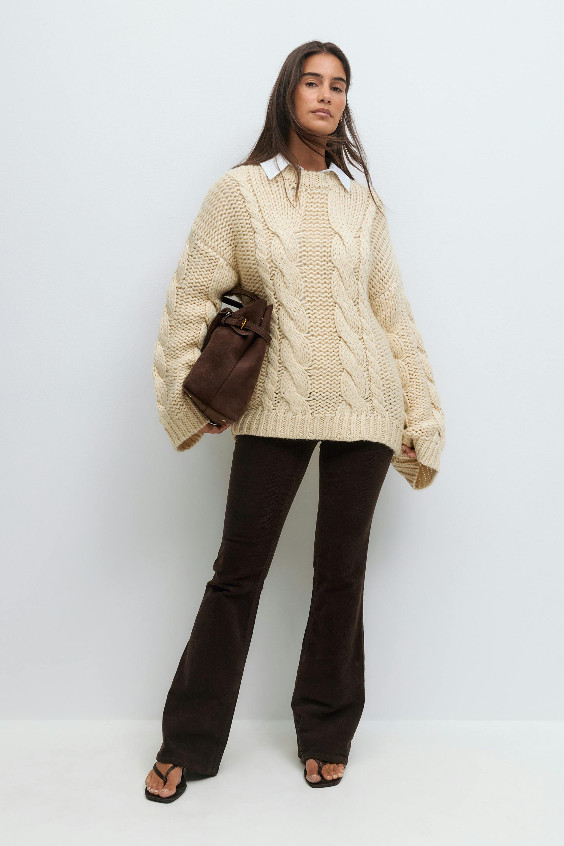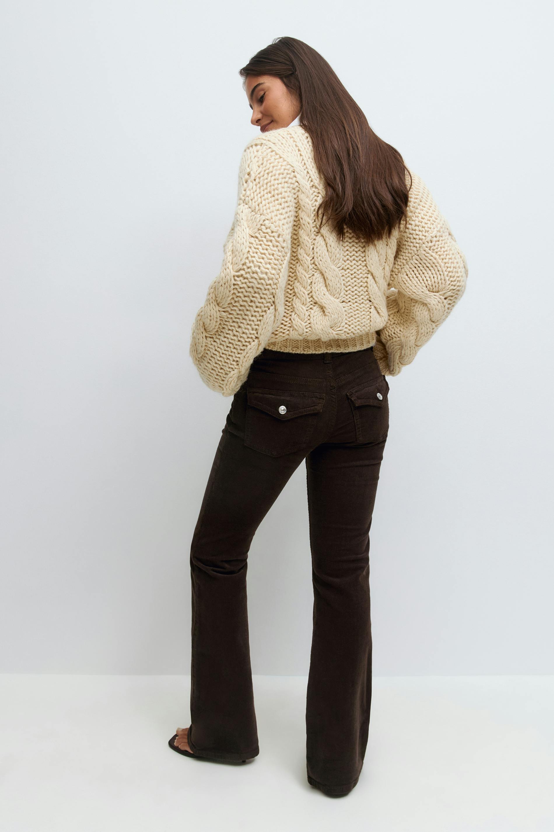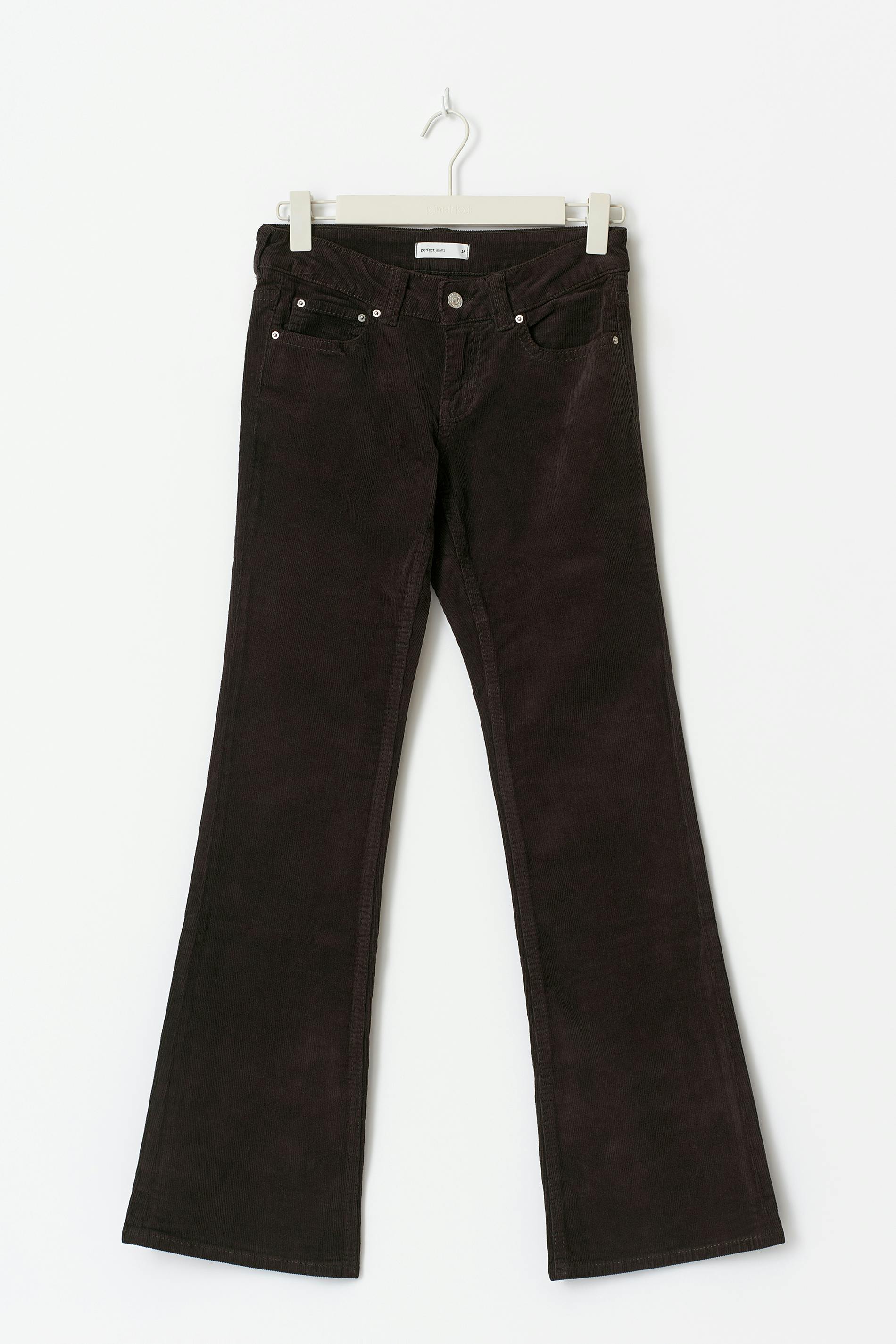 Utsvängda manchesterbyxor med låg midja. Byxorna är bruna och har bakfickor med knapp och lock. De har figurnära passform, framfickor, bälteshällor och dragkedjegylf.