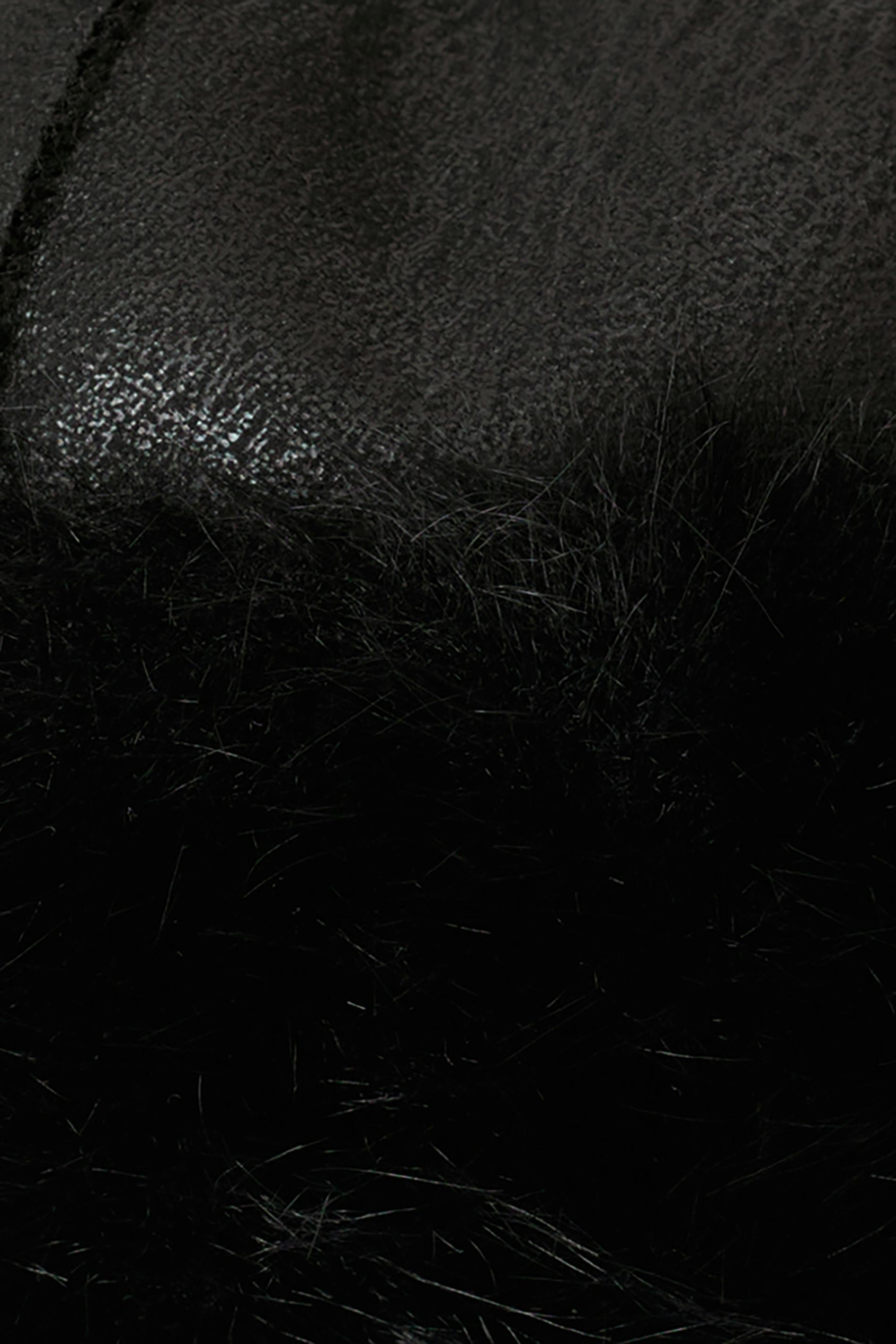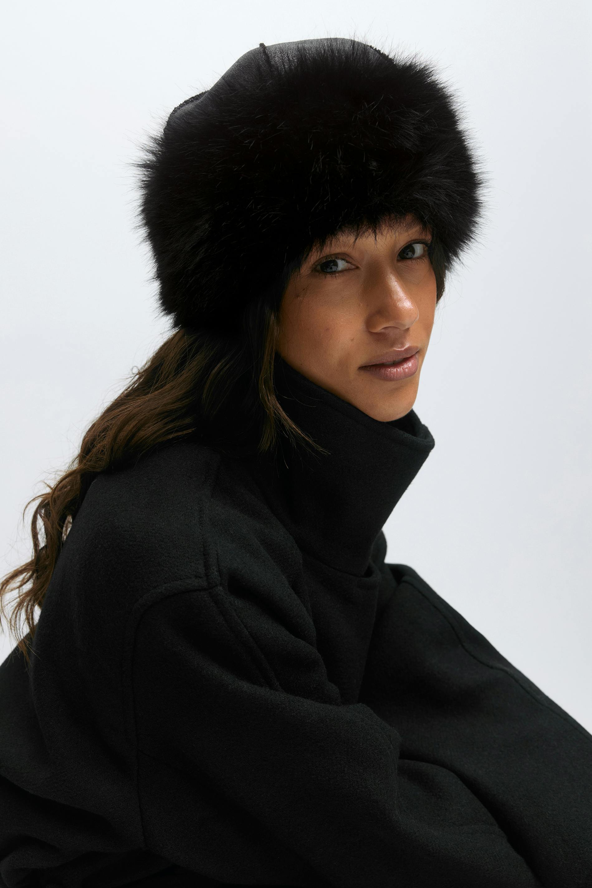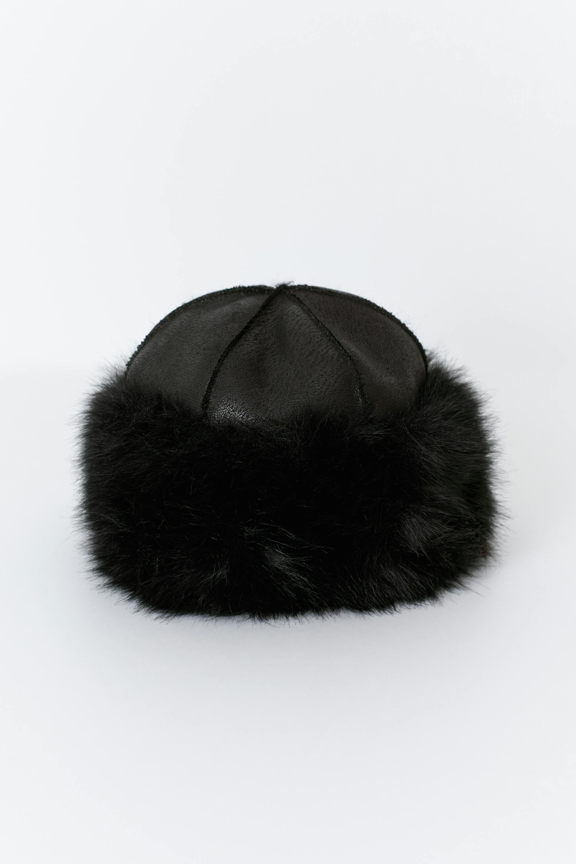 Pälsmössa i skinnimitation med bred fuskpälskant. Mössan är svart och har dekorativa sömmar upptill.