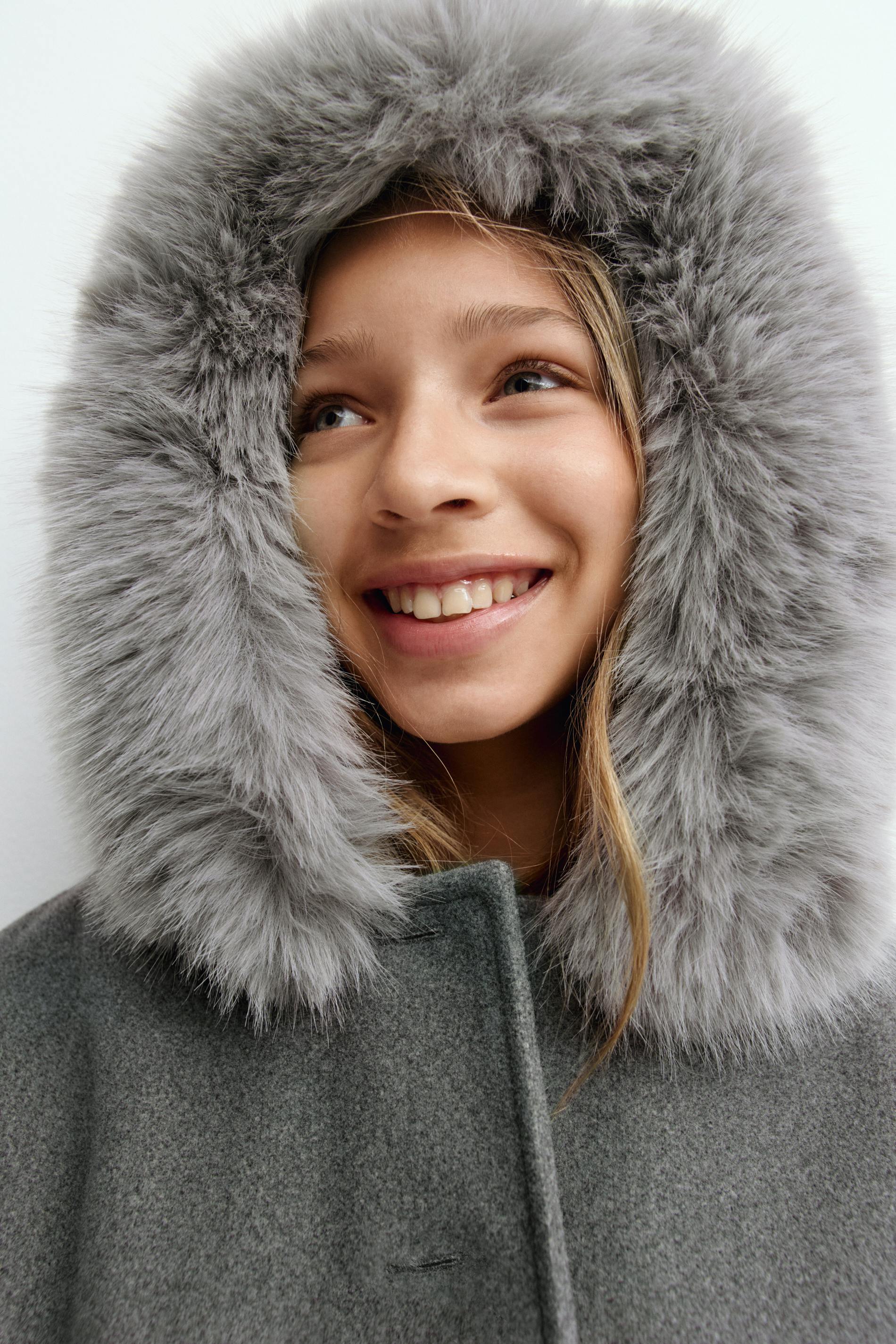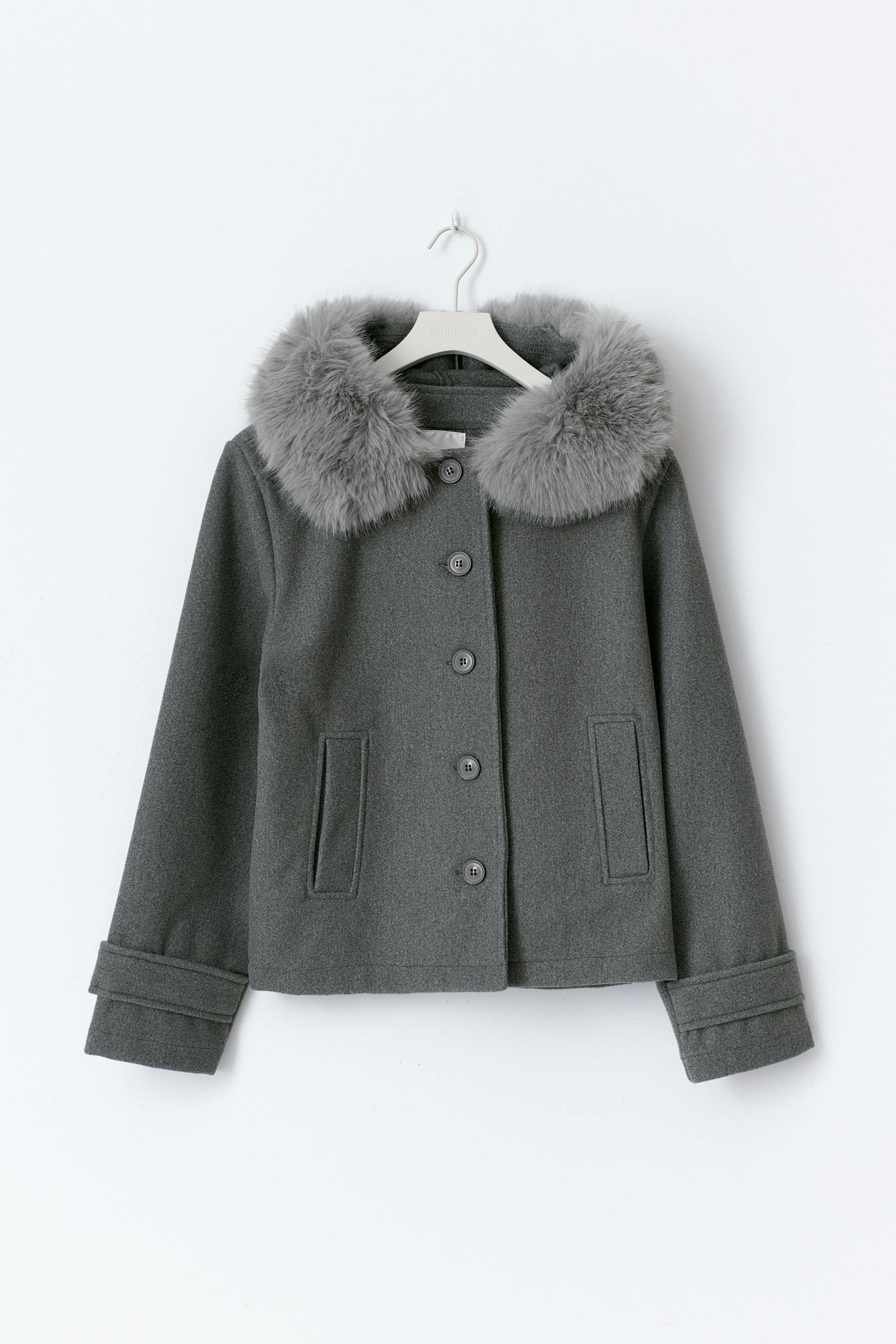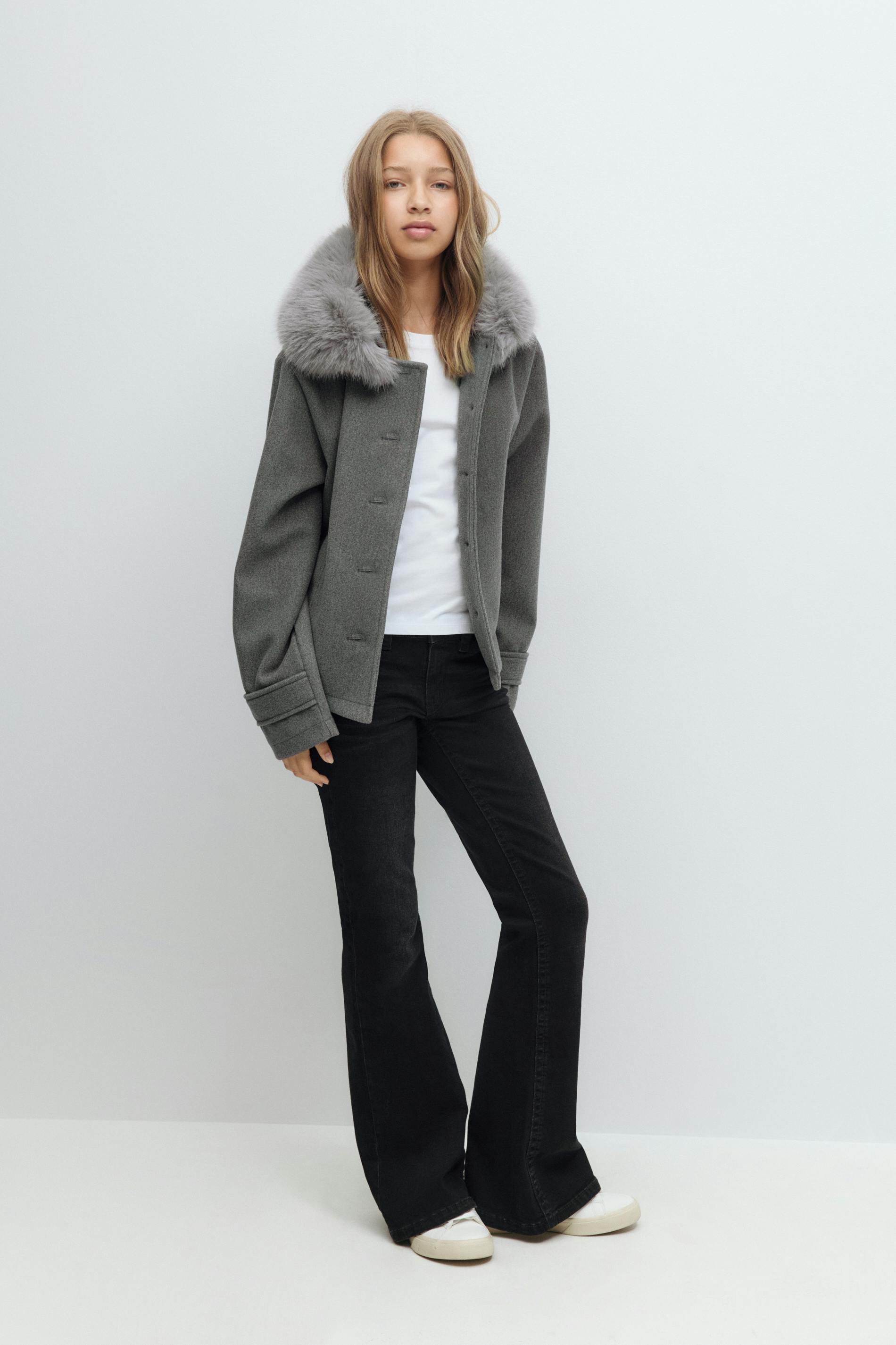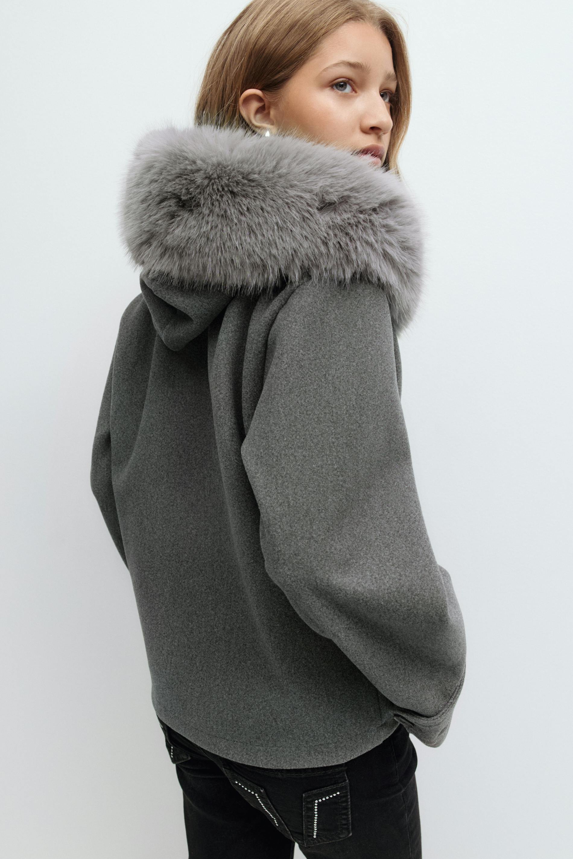 Jacka med avtagbar pälskrage. Jackan är grå och har knäppning fram. Den har oversize fit, fickor i sidorna, nedhasade axlar och långa ärmar. Ofodrad.