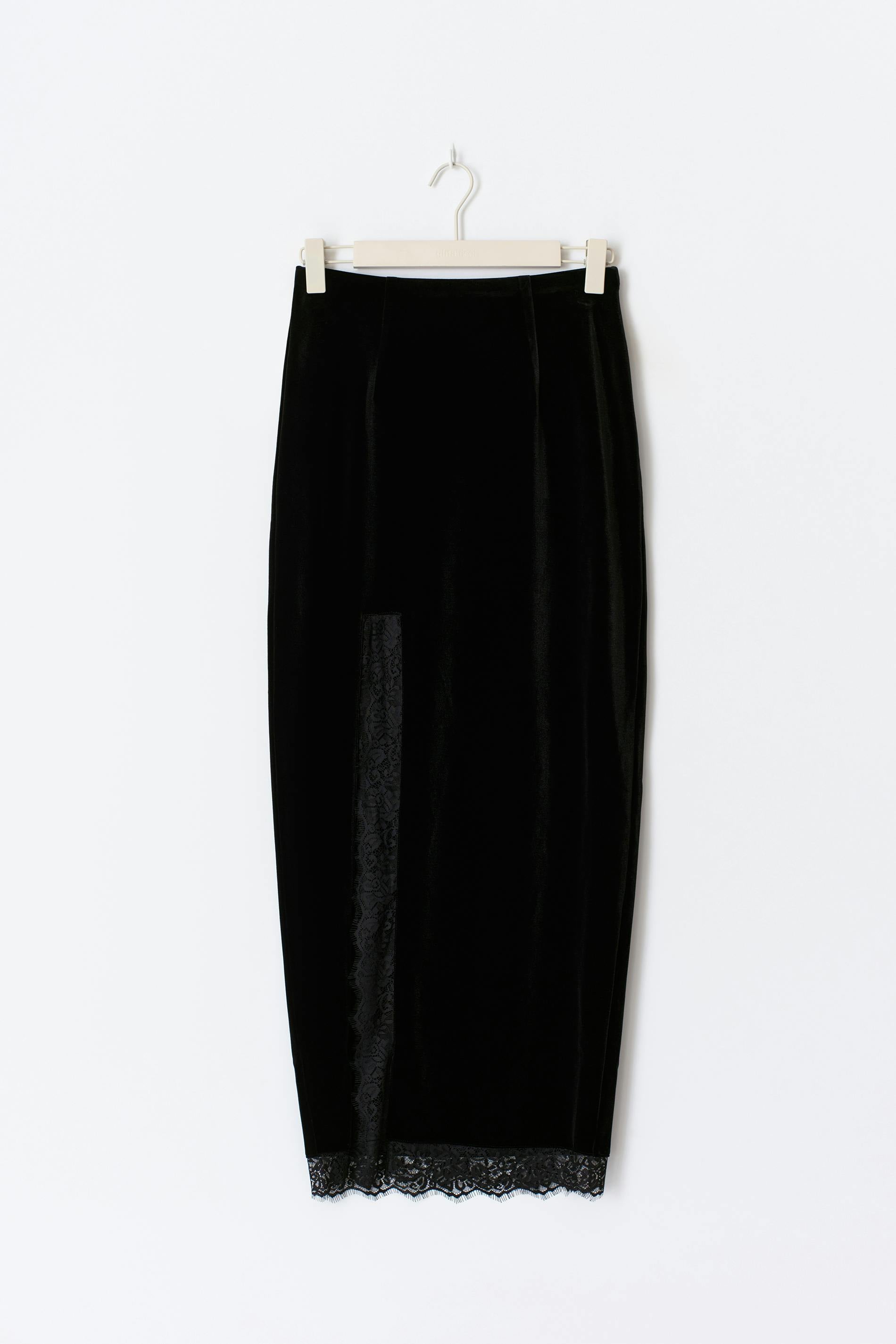 Långkjol i sammet med en figurnära passform. Kjolen är svart och har en slits med spetsdetalj. Den har en hög midja, en dragkedjestängning och en elastisk midja.