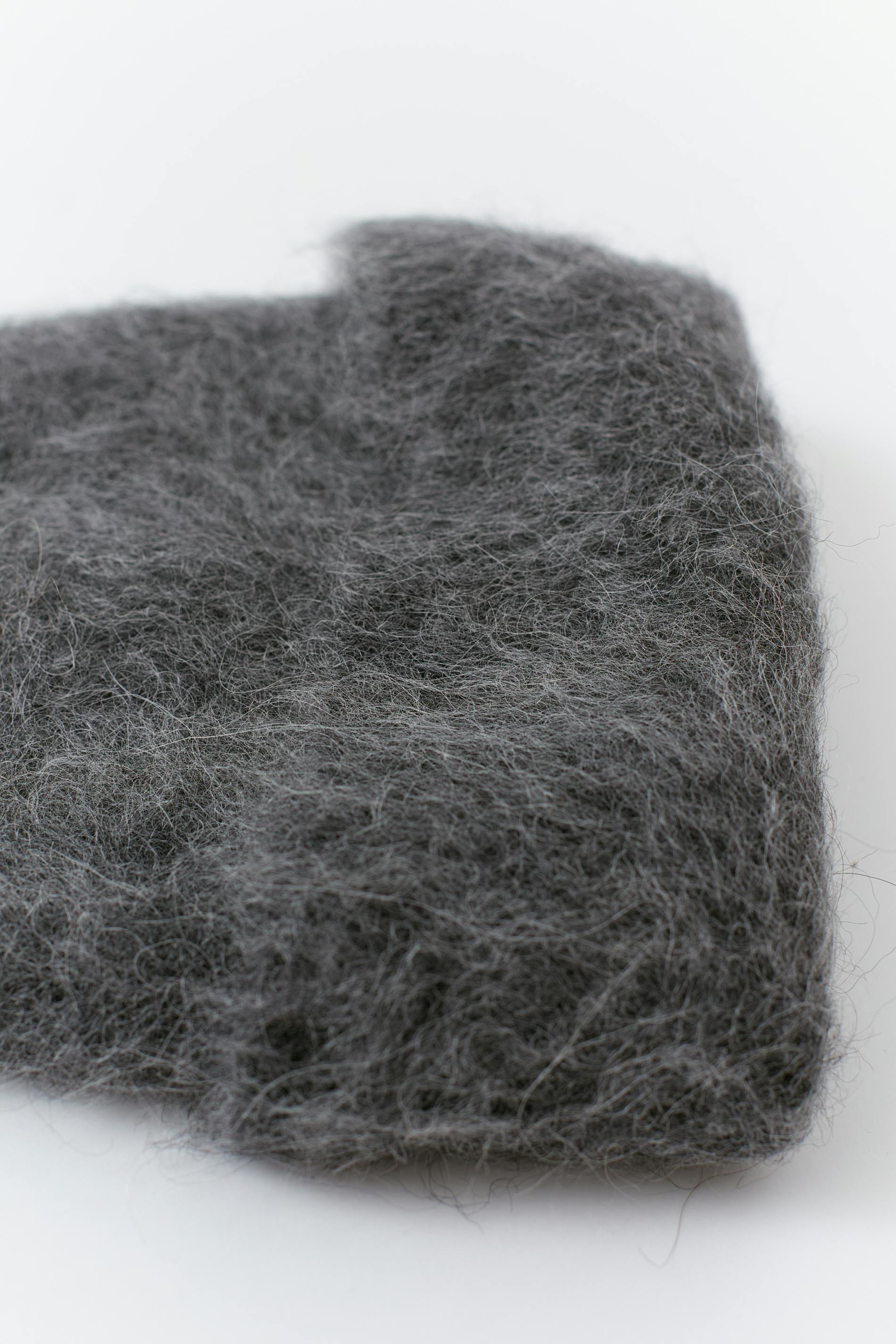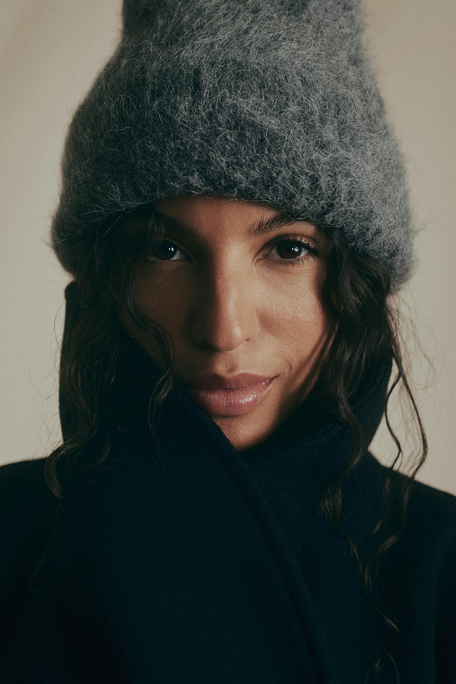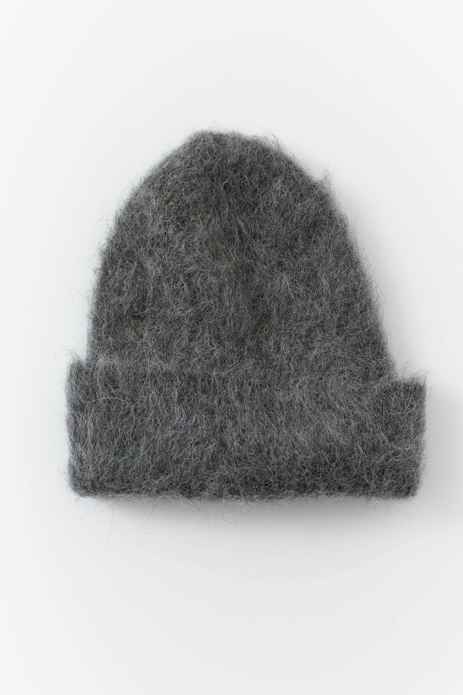 Stickad mössa i alpackamix med uppvikt kant. Hatten är grå och har mjuk, fluffig kvalitet.