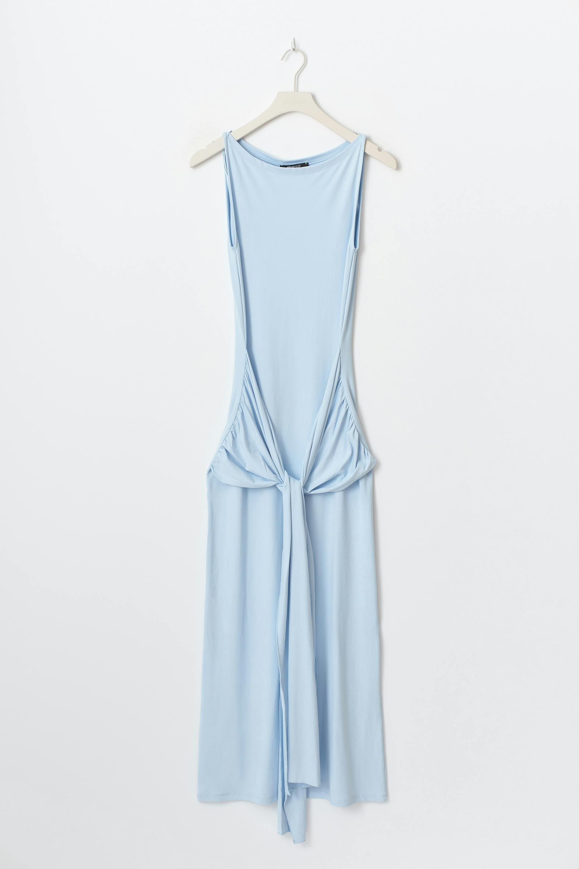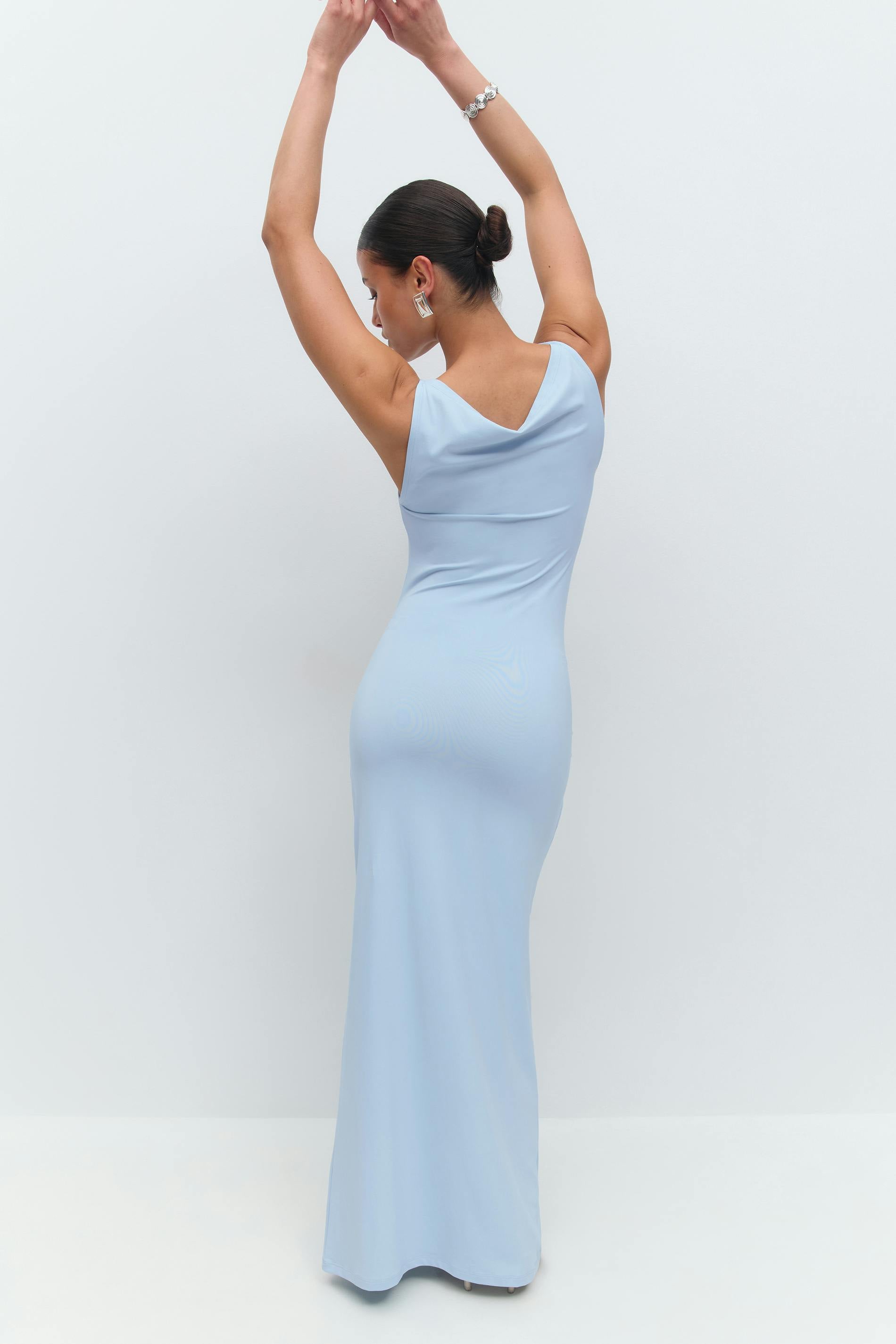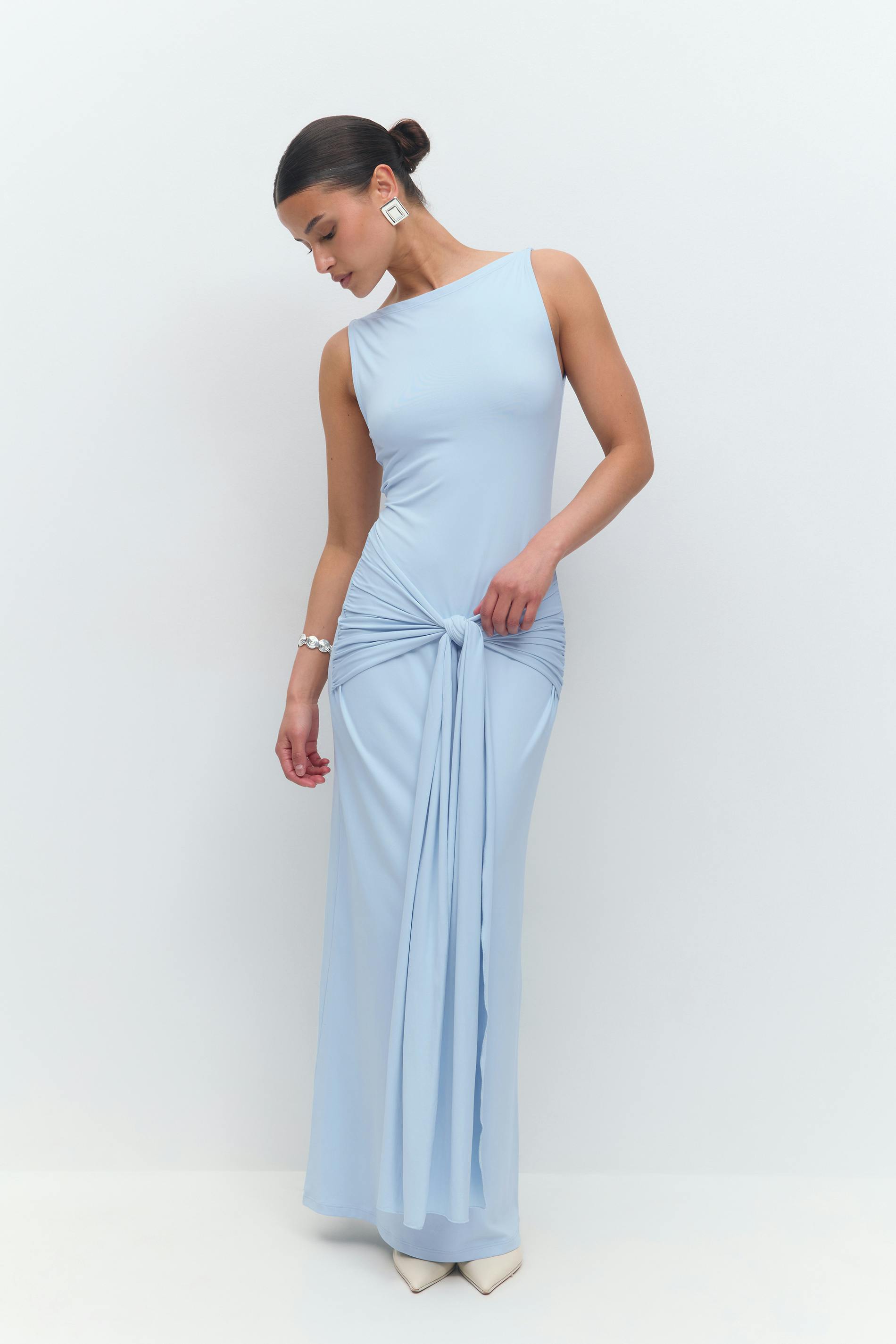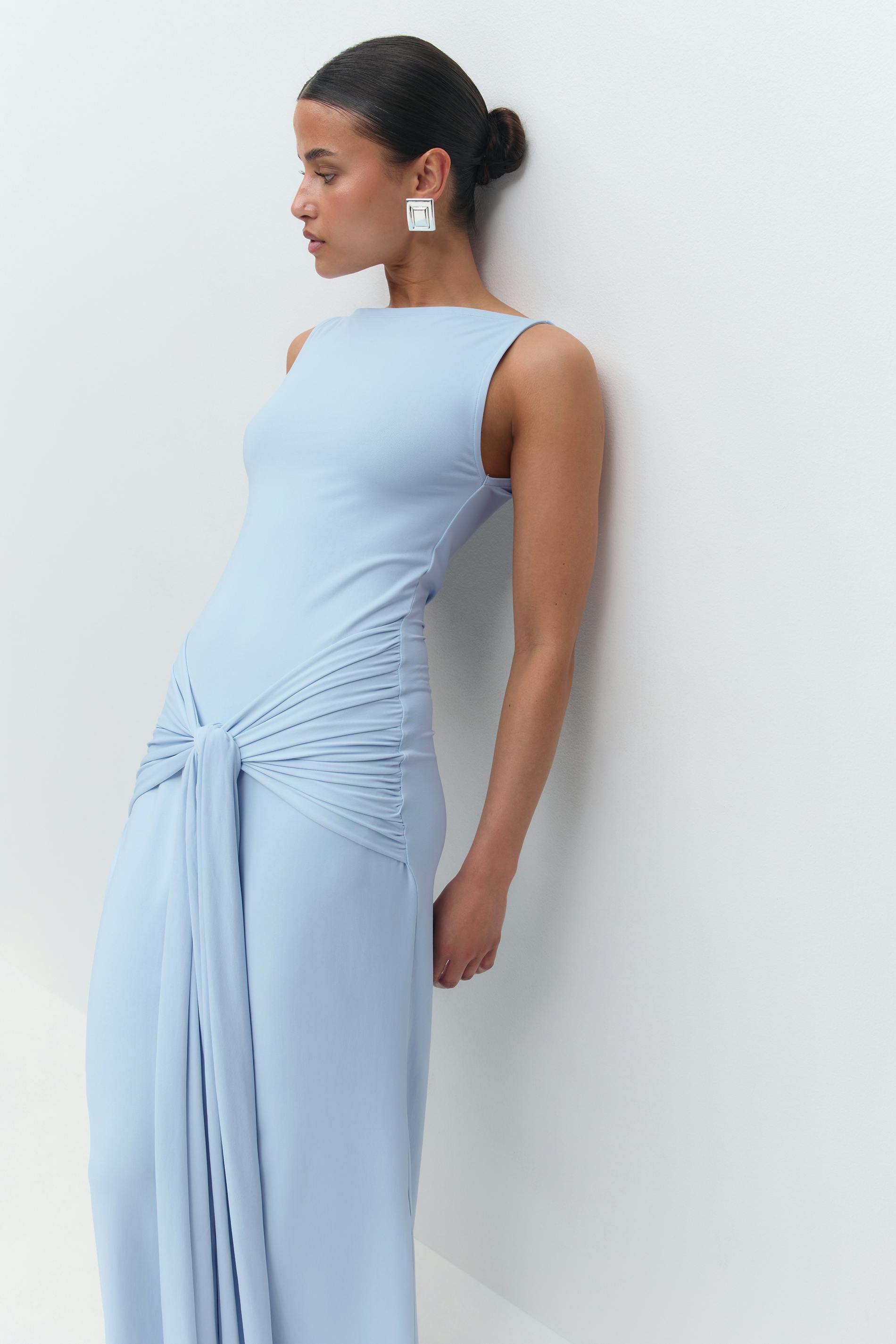 Sleeveless maxi dress with tie detail at the waist. The dress is blue and has boat neckline. It has stretchy quality, figure-hugging fit and maxi length.