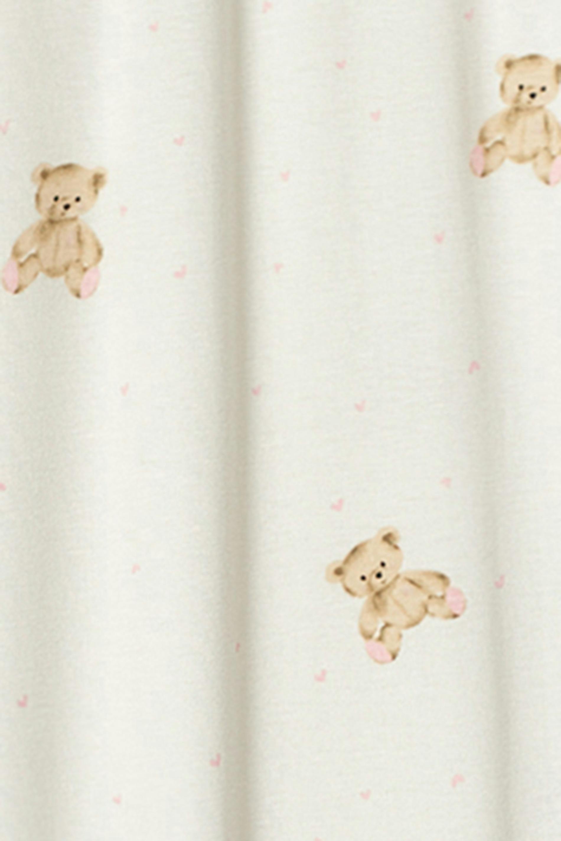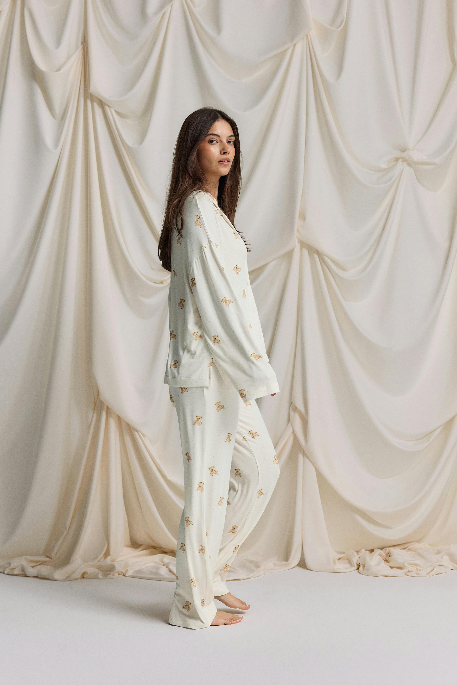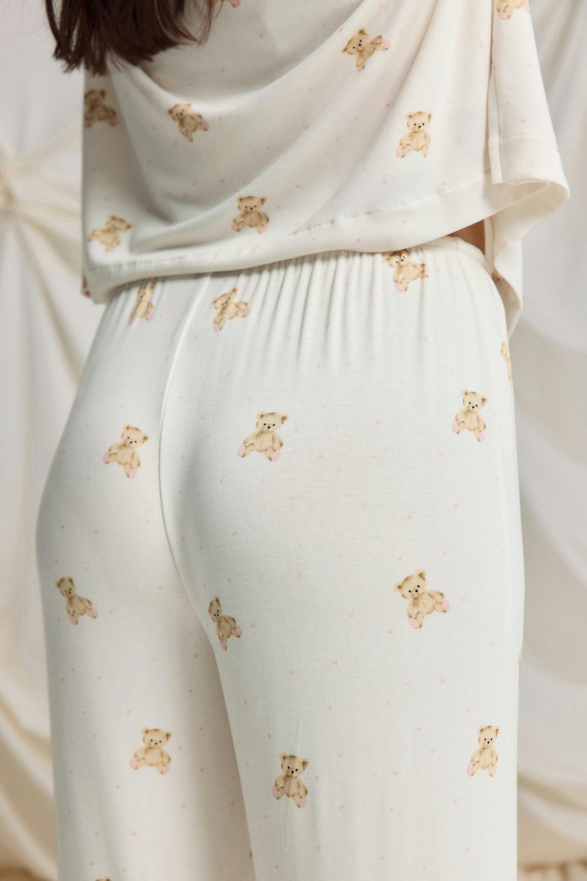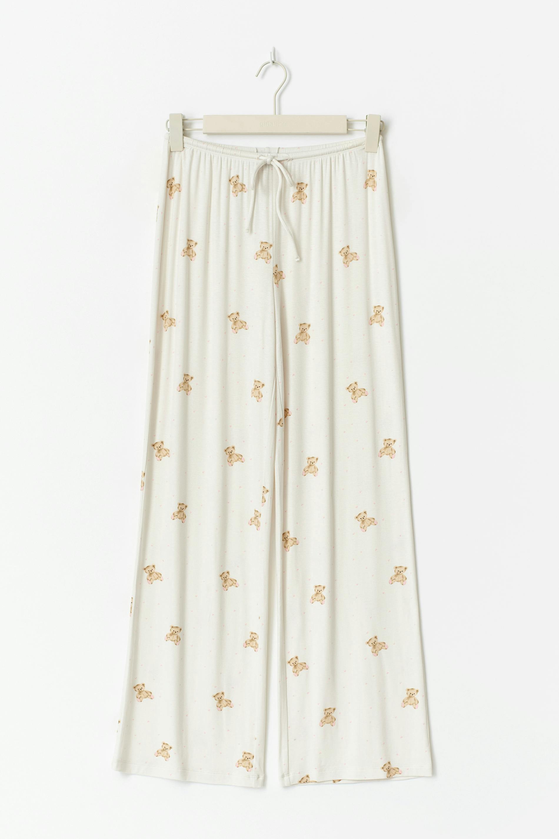 Mjuka pyjamasbyxor med små nallebjörnar. Pyjamasbyxorna är vita och har oversize fit. De har knytning fram, medelhög midja med resår och raka ben med fullängd.
