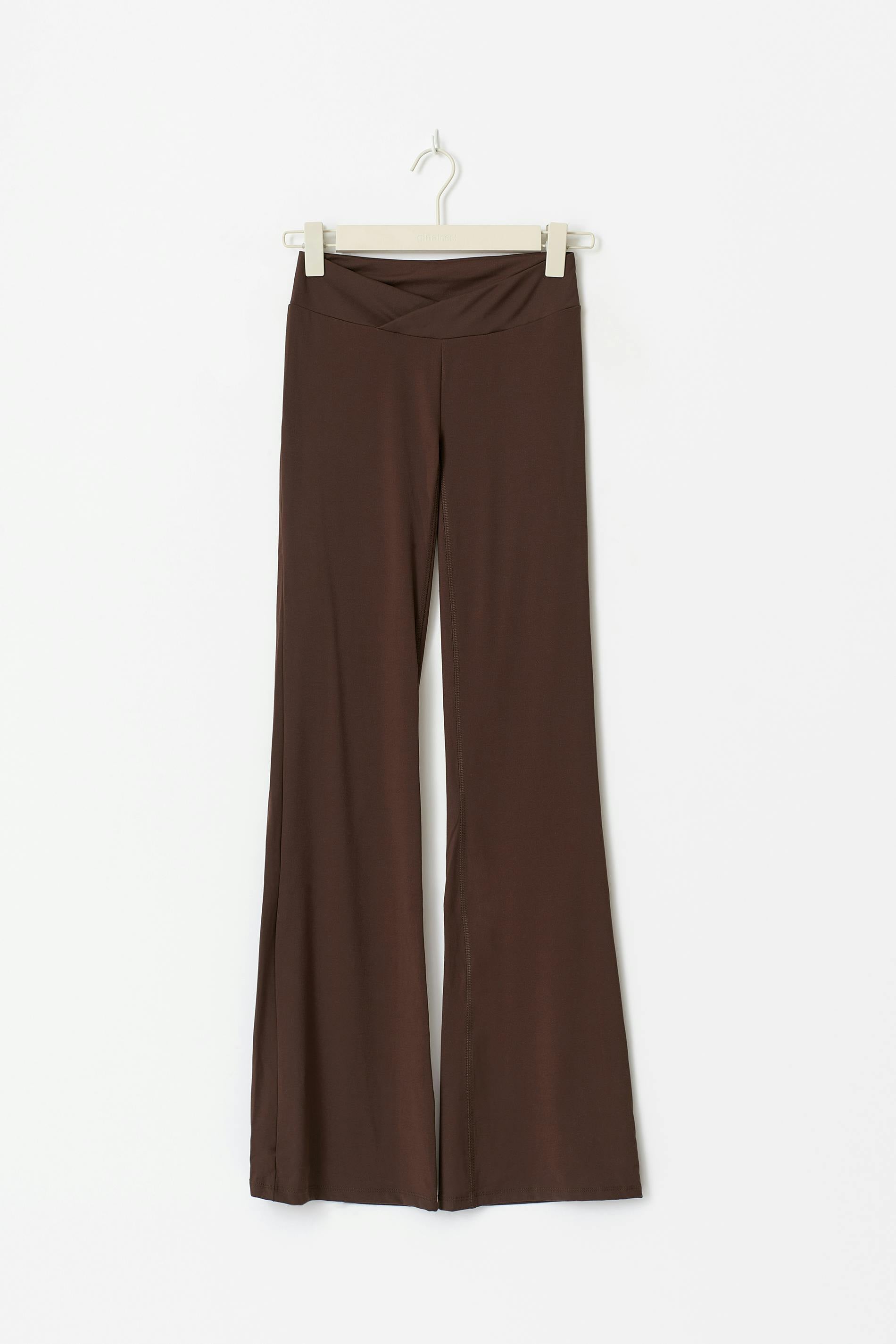 Yoga leggings with wrap detail at the waist. The trousers are brown and have figure-hugging fit. They have mid waist and flared legs. The garment is made of material that wicks away moisture and keeps you dry during all types of physical activity.