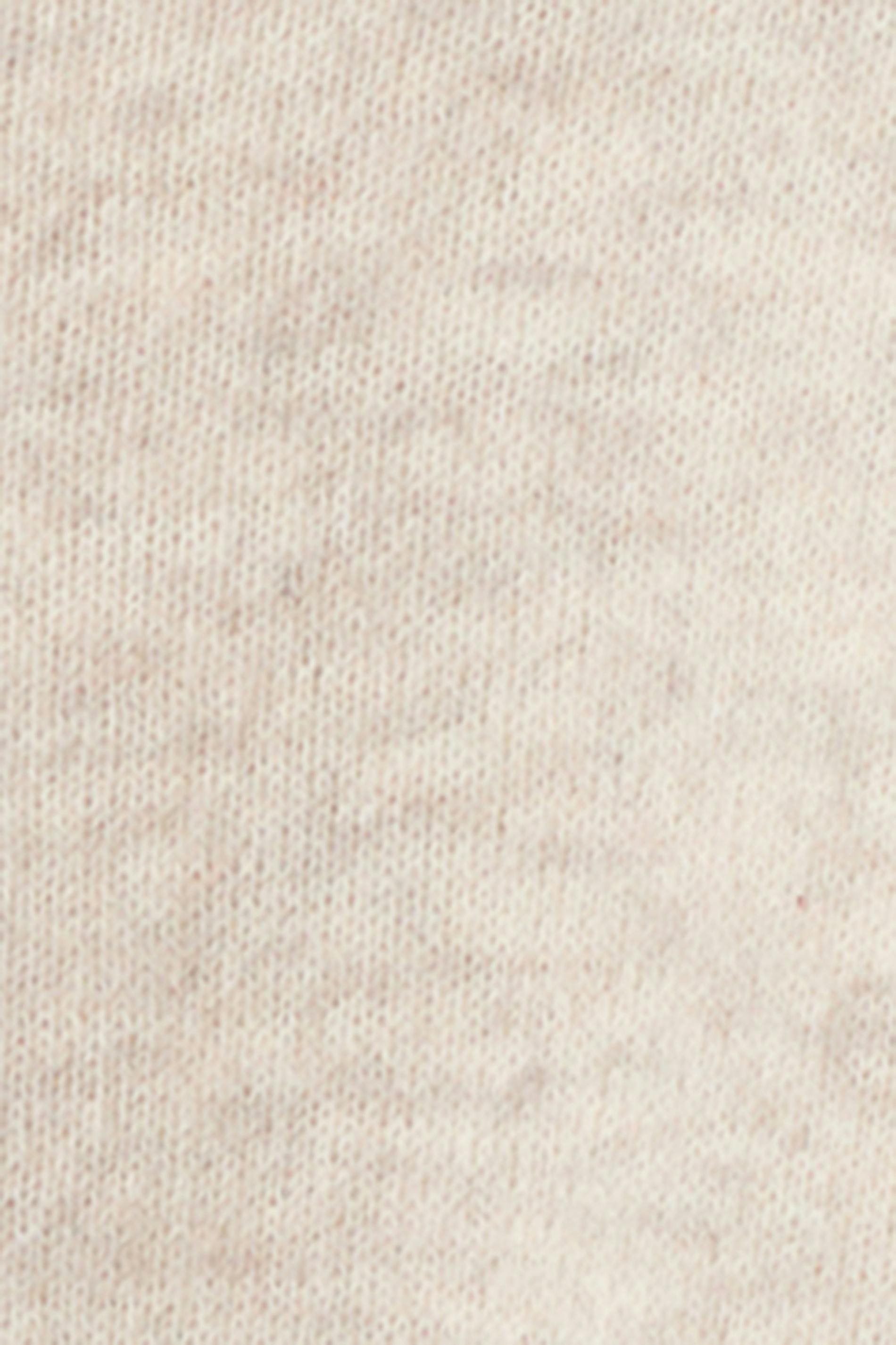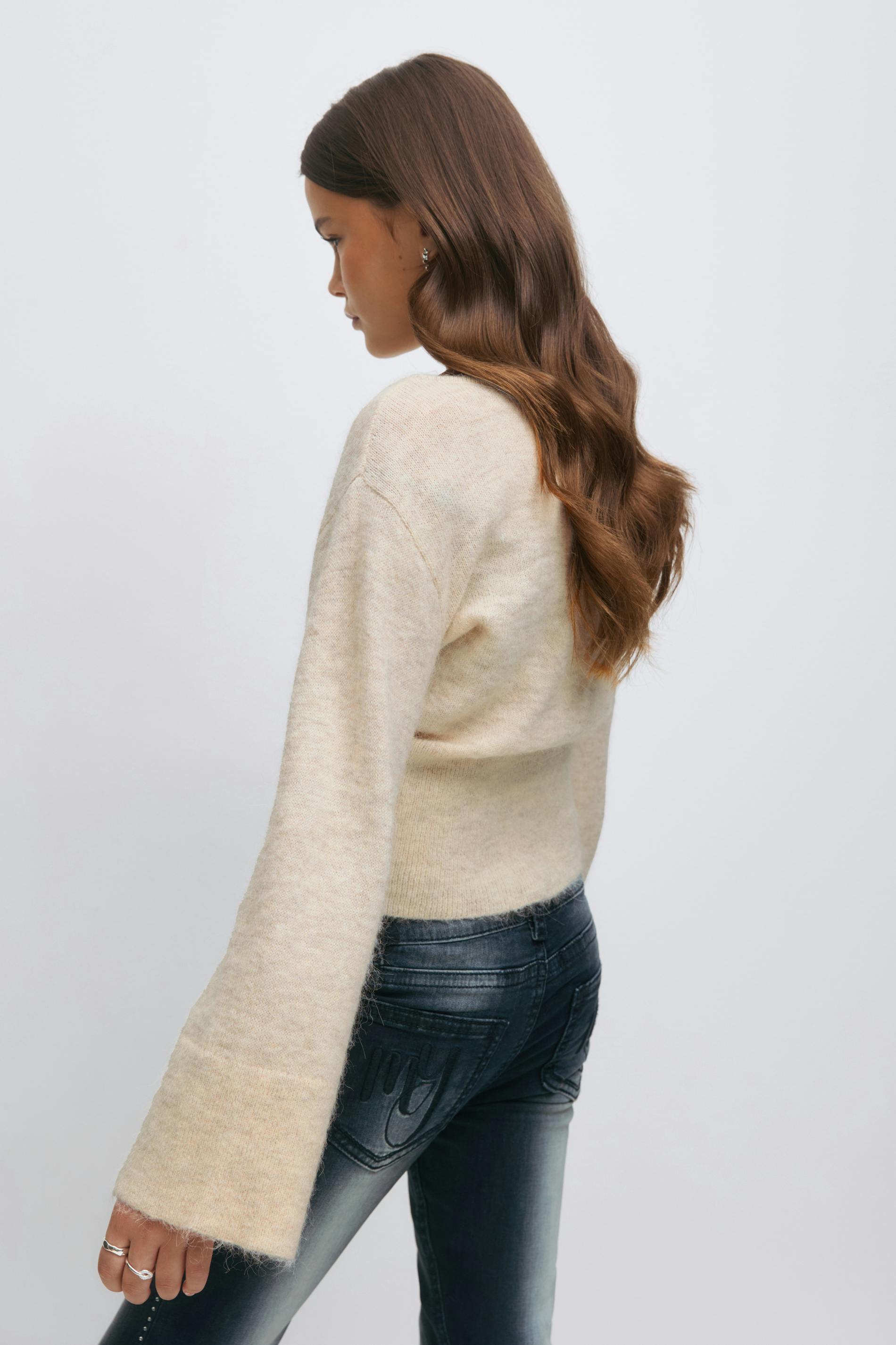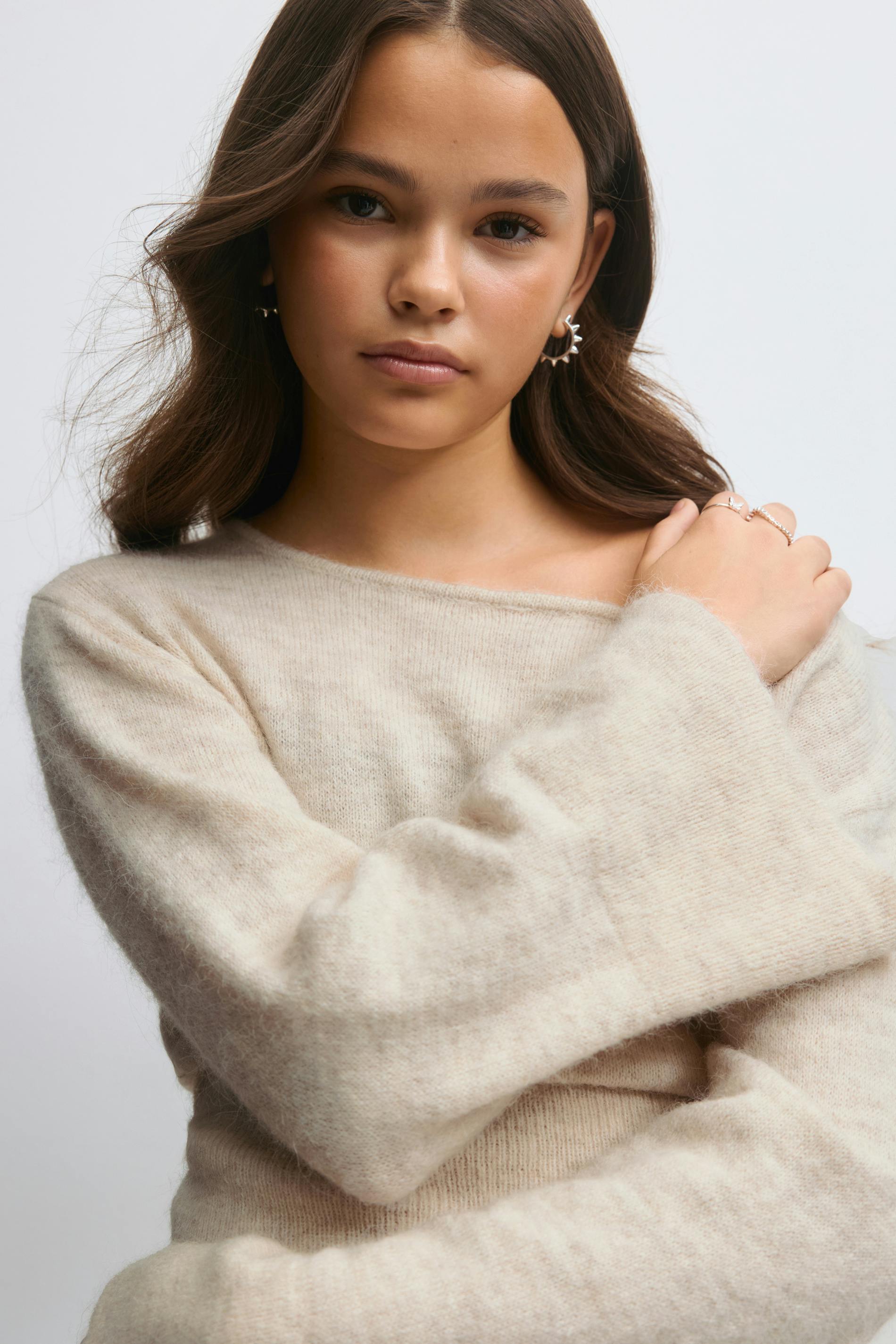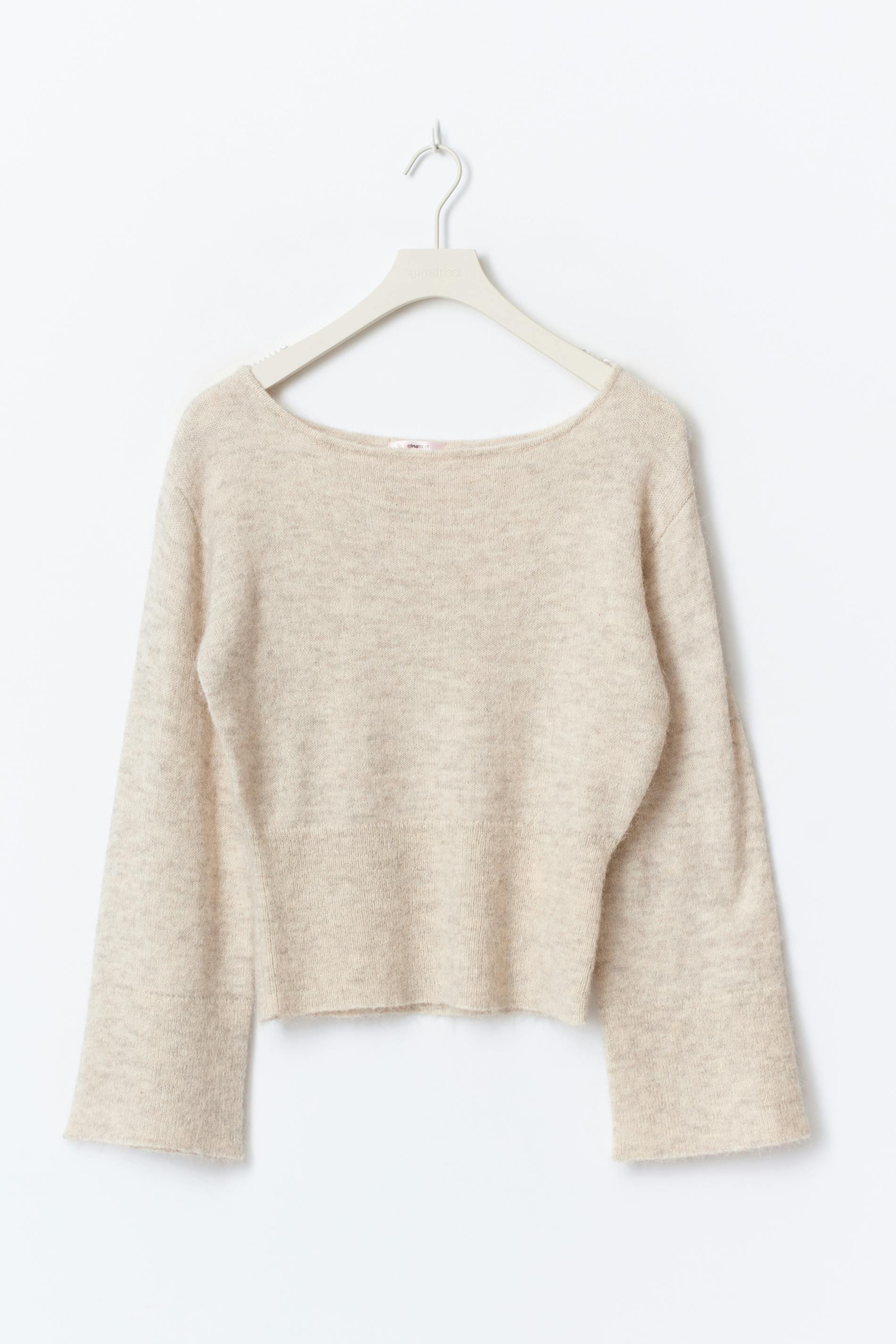 Stickad tröja med en lång ärm. Den stickade tröjan är beige och har en båtringning. Den har en normal passform och en ribbad nederkant.