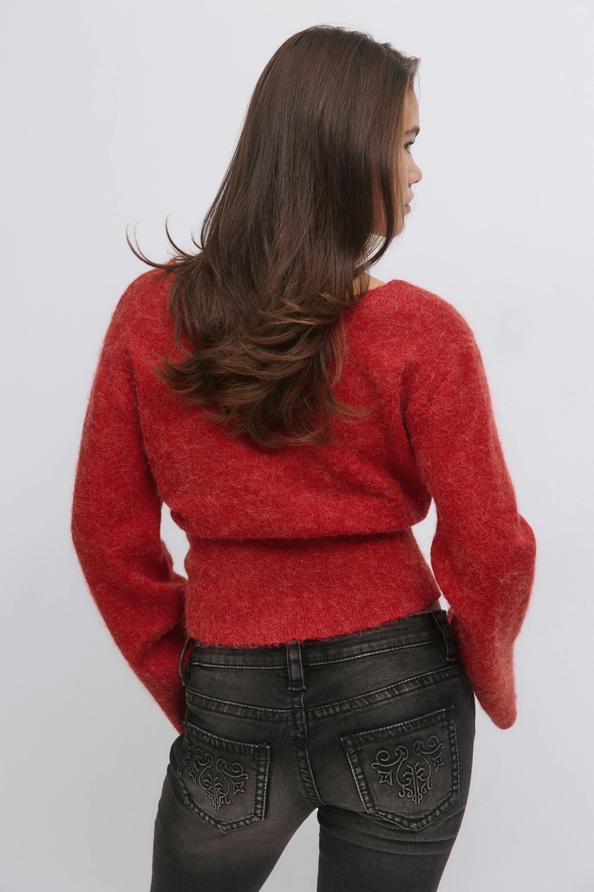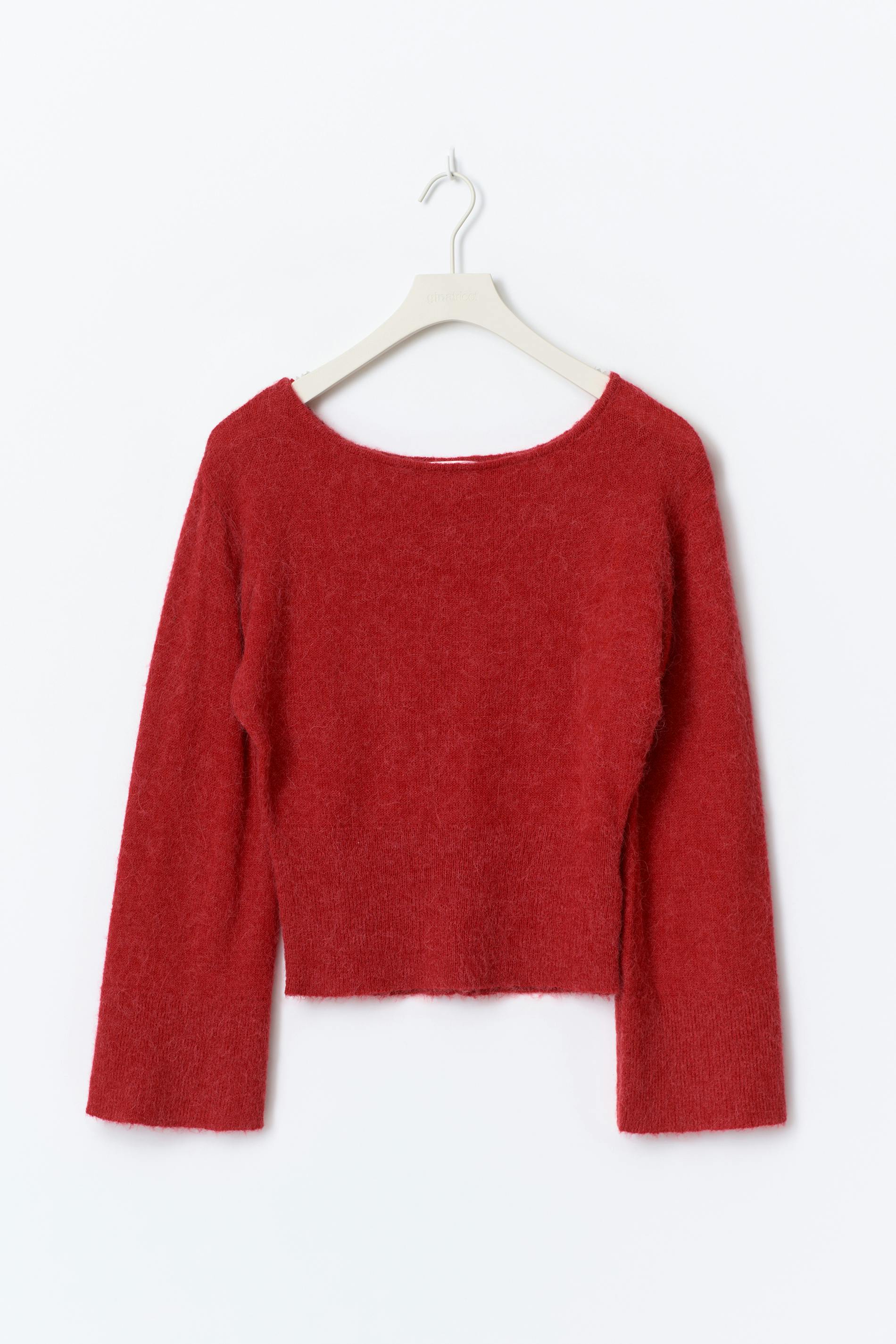 Stickad tröja med en lång ärm. Den stickade tröjan är röd och har en båtringning. Den har en normal passform och en ribbad nederkant.