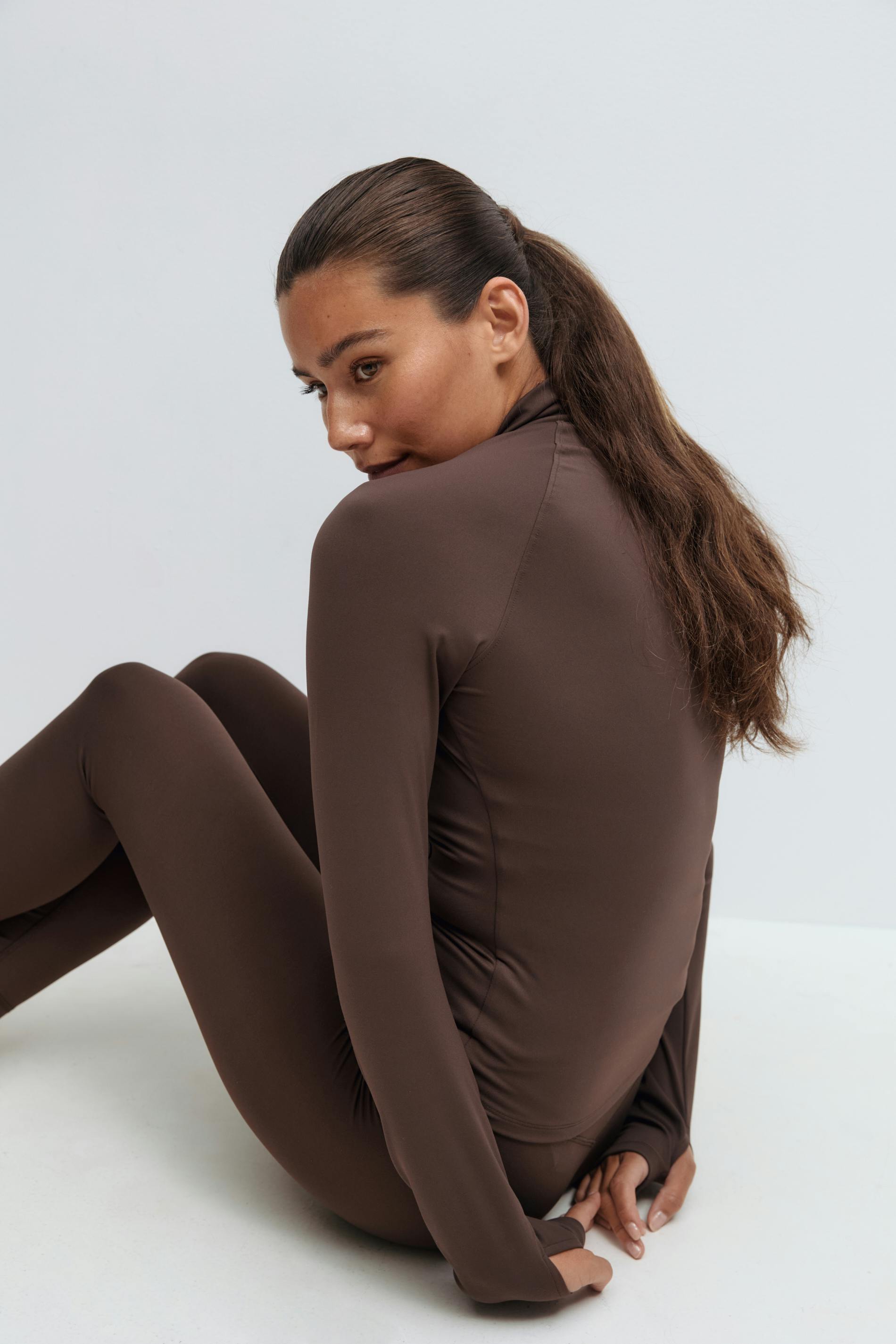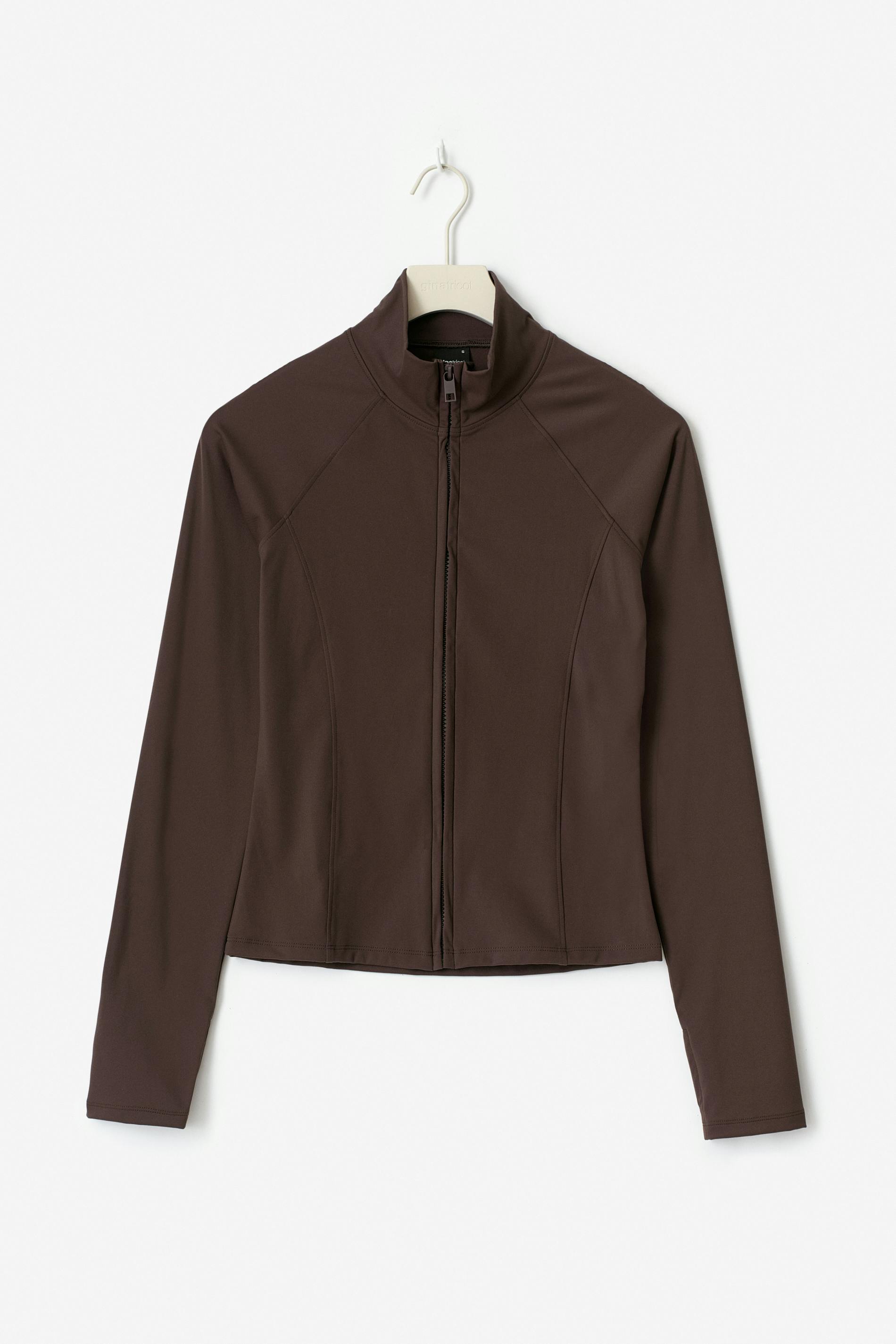 Sportig jacka med tumhål. Jackan är brun och har dragkedja fram. Den har en polokrage, dekorativa sömmar fram och bak, figurnära passform, långa ärmar och mjuk, stretchig kvalitet.