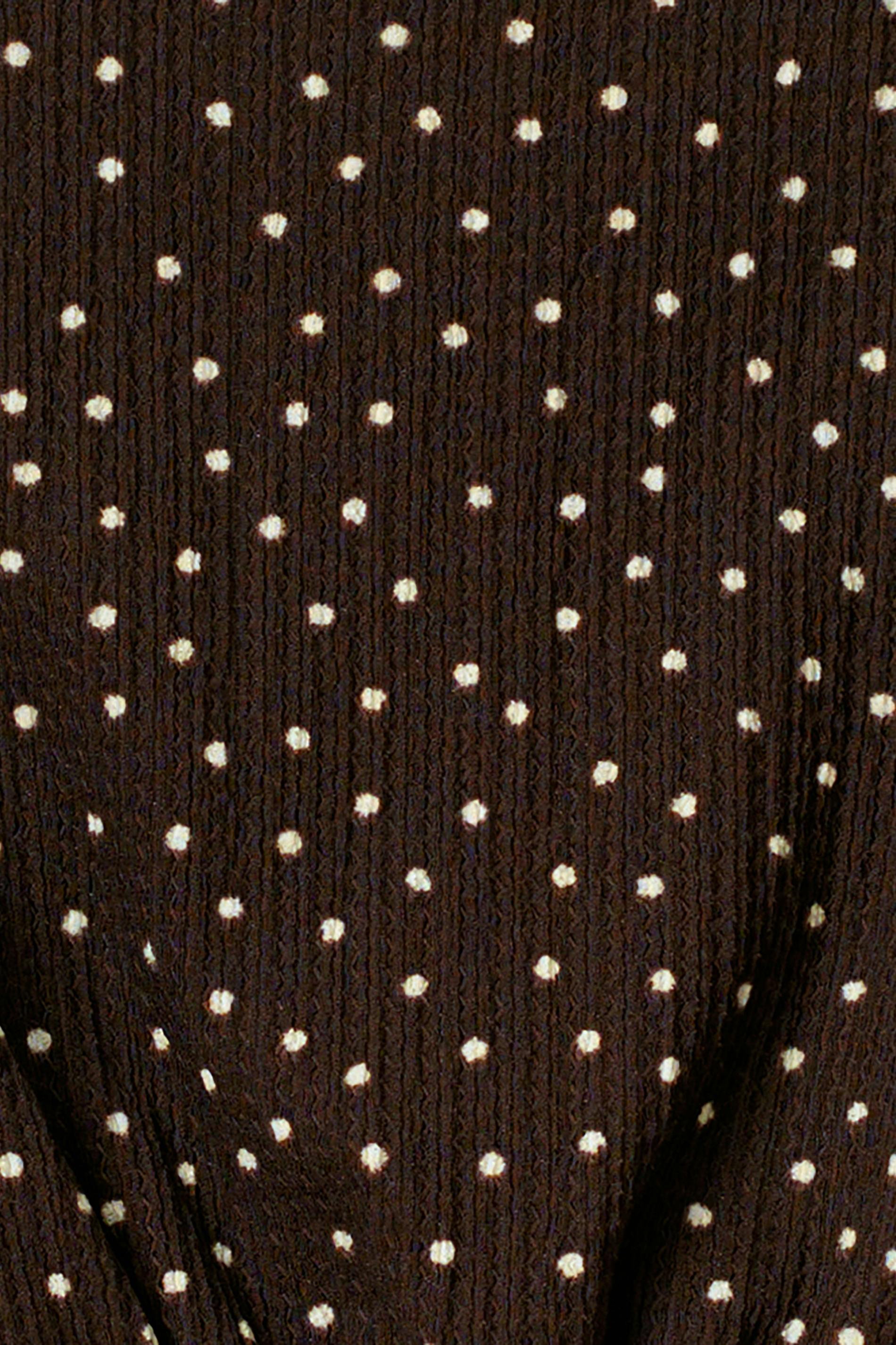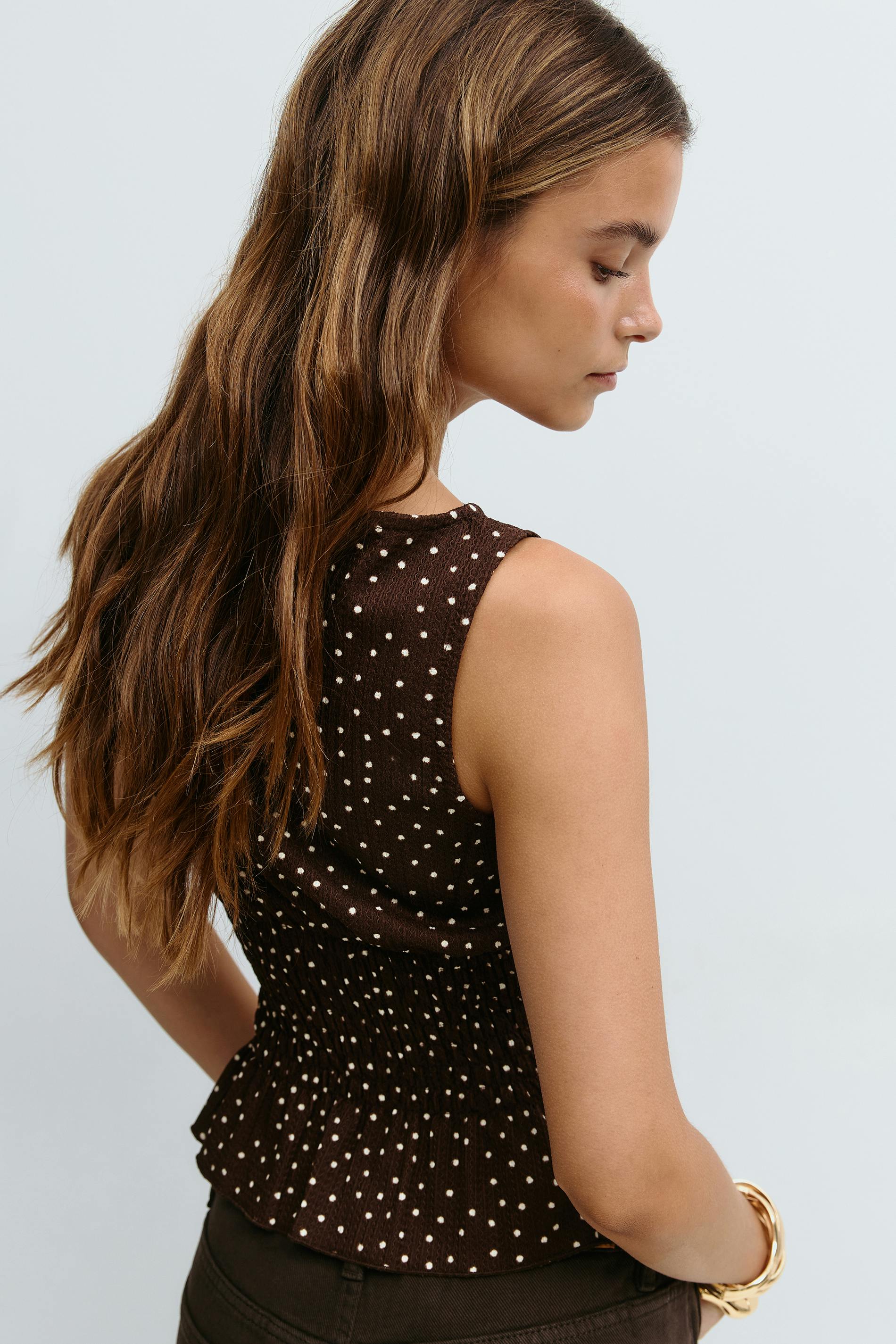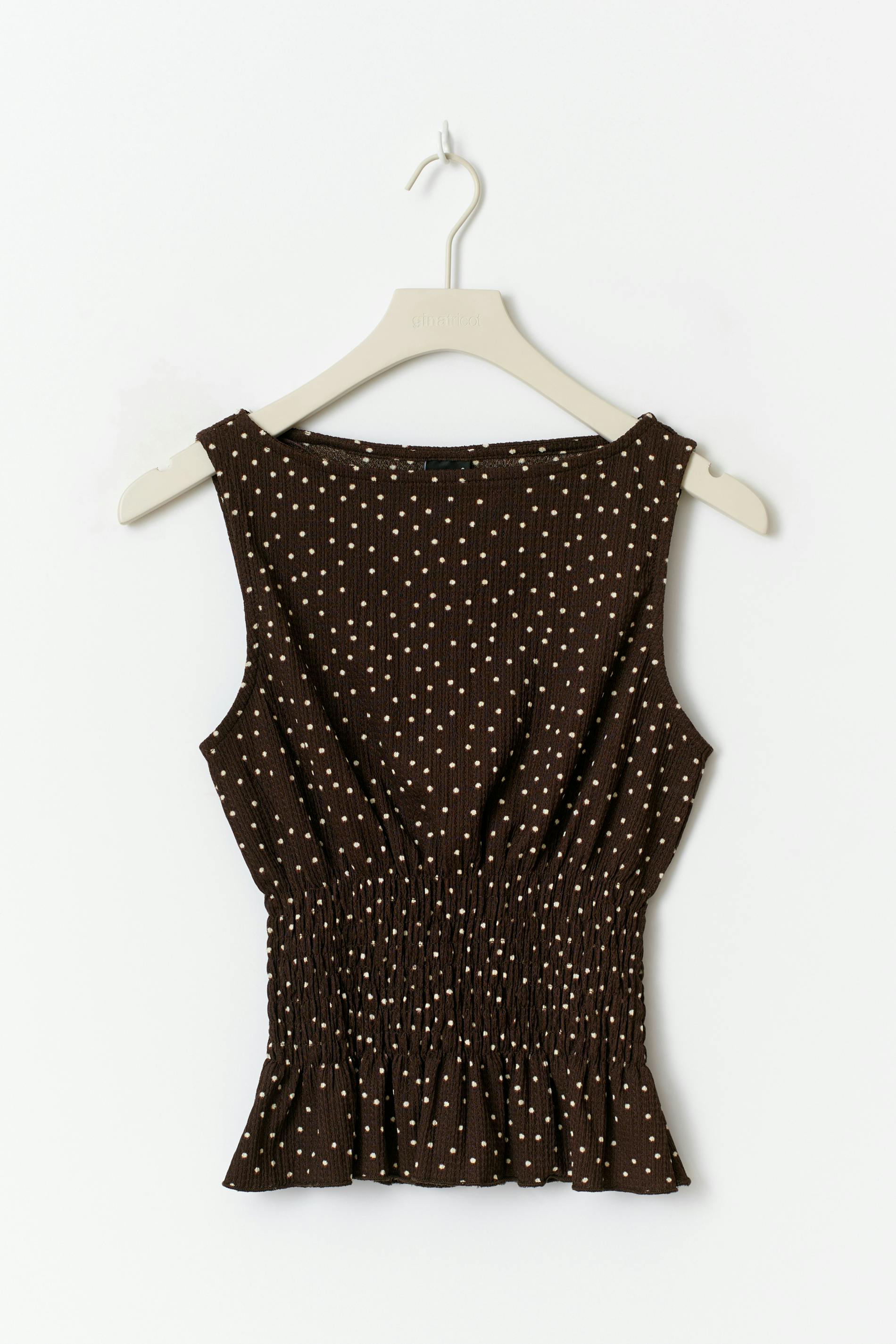 Dotted top with smocking at the waist. The top is brown and has frill at the bottom. It has textured material, sleeveless design, regular fit and boat neckline.
