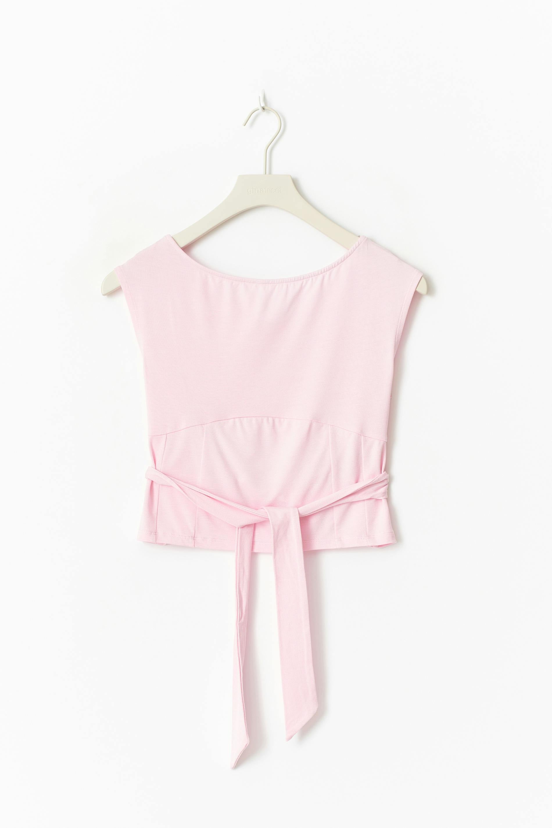 Sleeveless top with open back. The top is pink and has tie detail at the back. It has crew neckline, dropped shoulder, decorative seam below the bust, cropped length and figure-hugging fit.