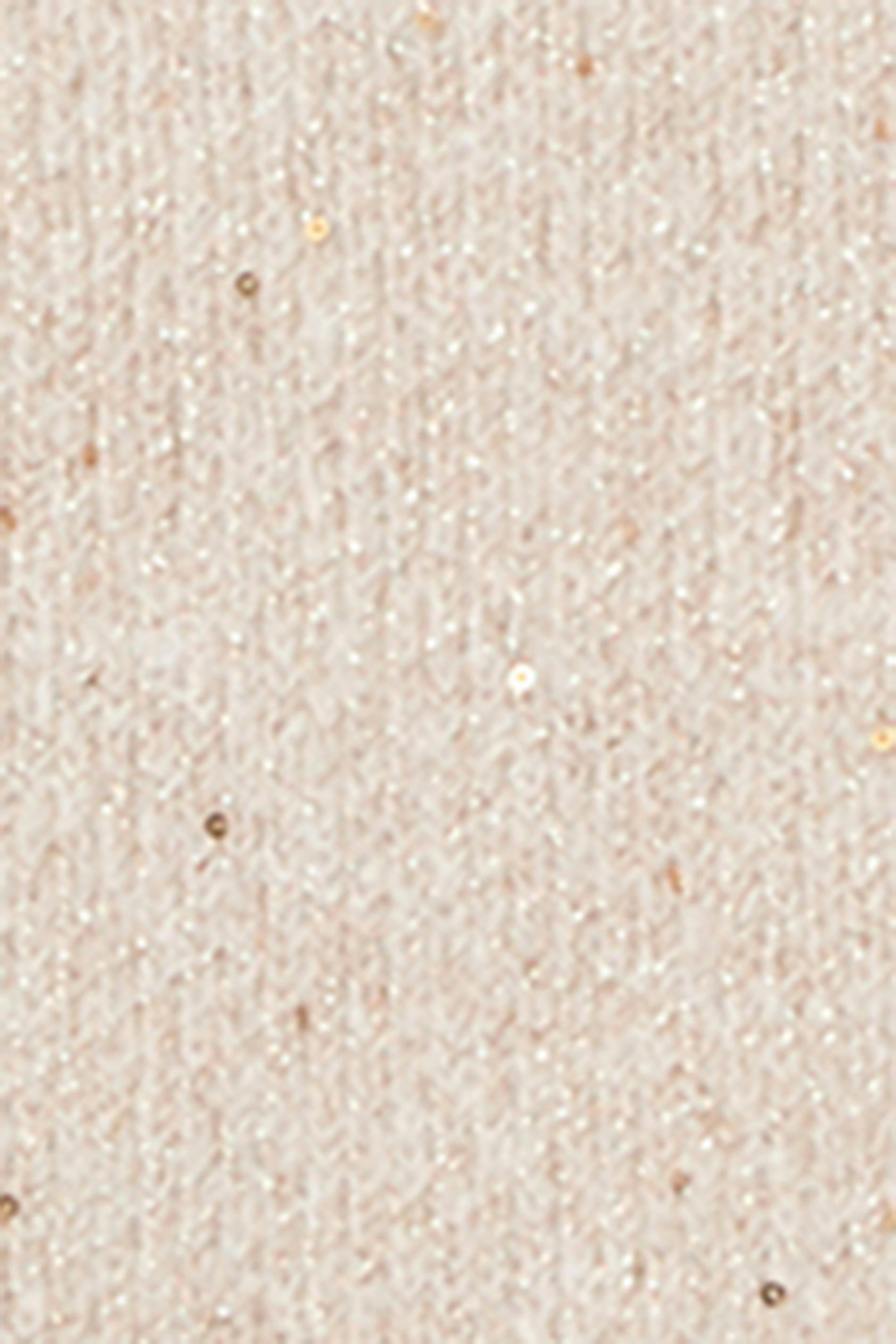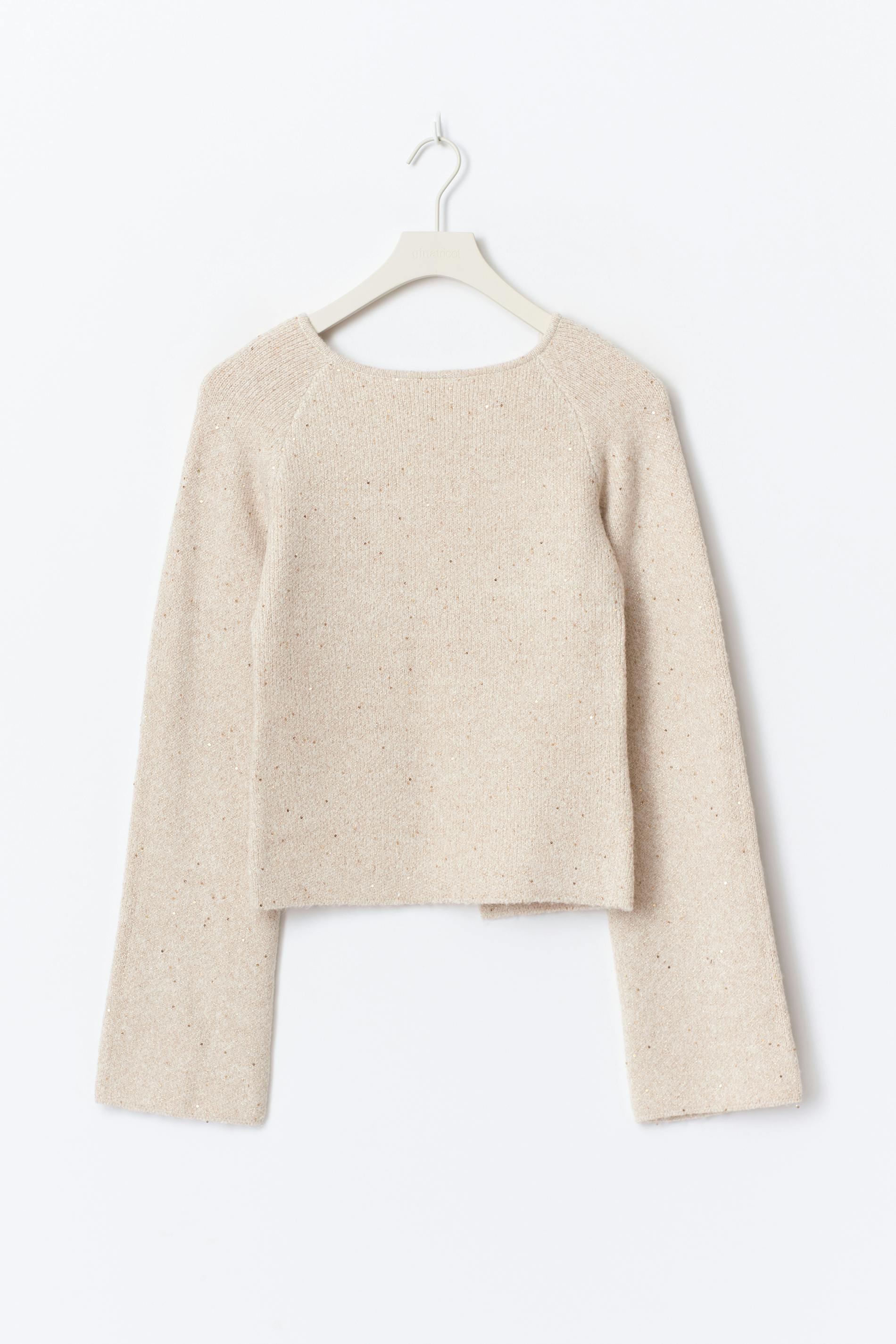 Stickad långärmad topp med paljettdetaljer. Toppen är krämfärgad och har en öppen rygg. Den har en knytdetalj baktill, en båtringning, rak ärm och normal passform.