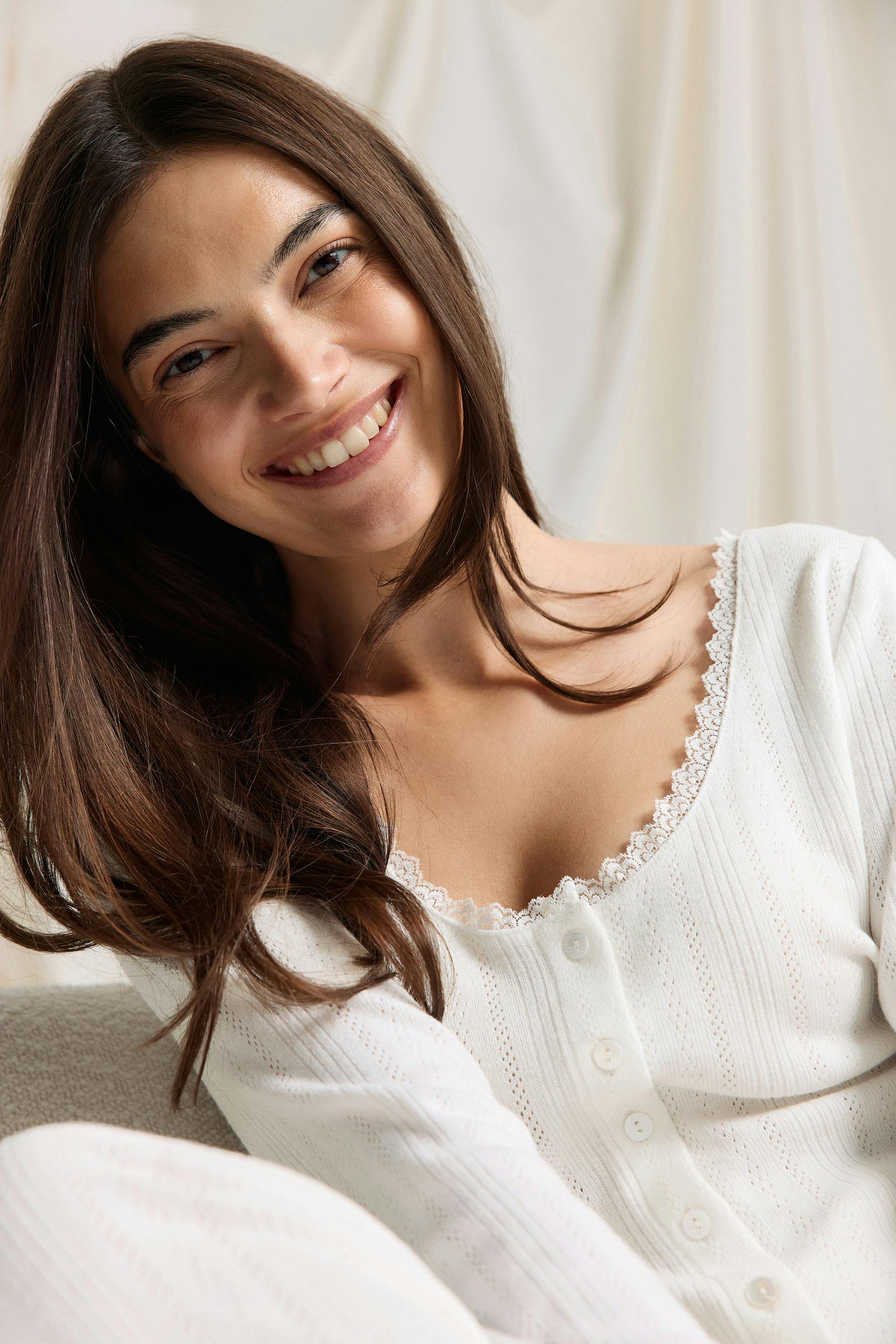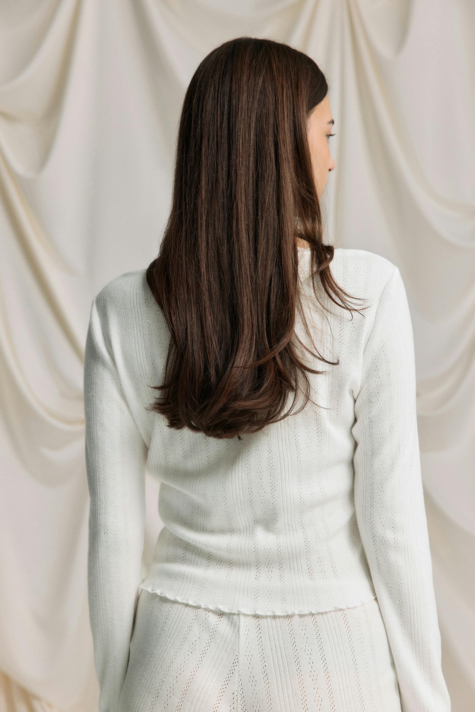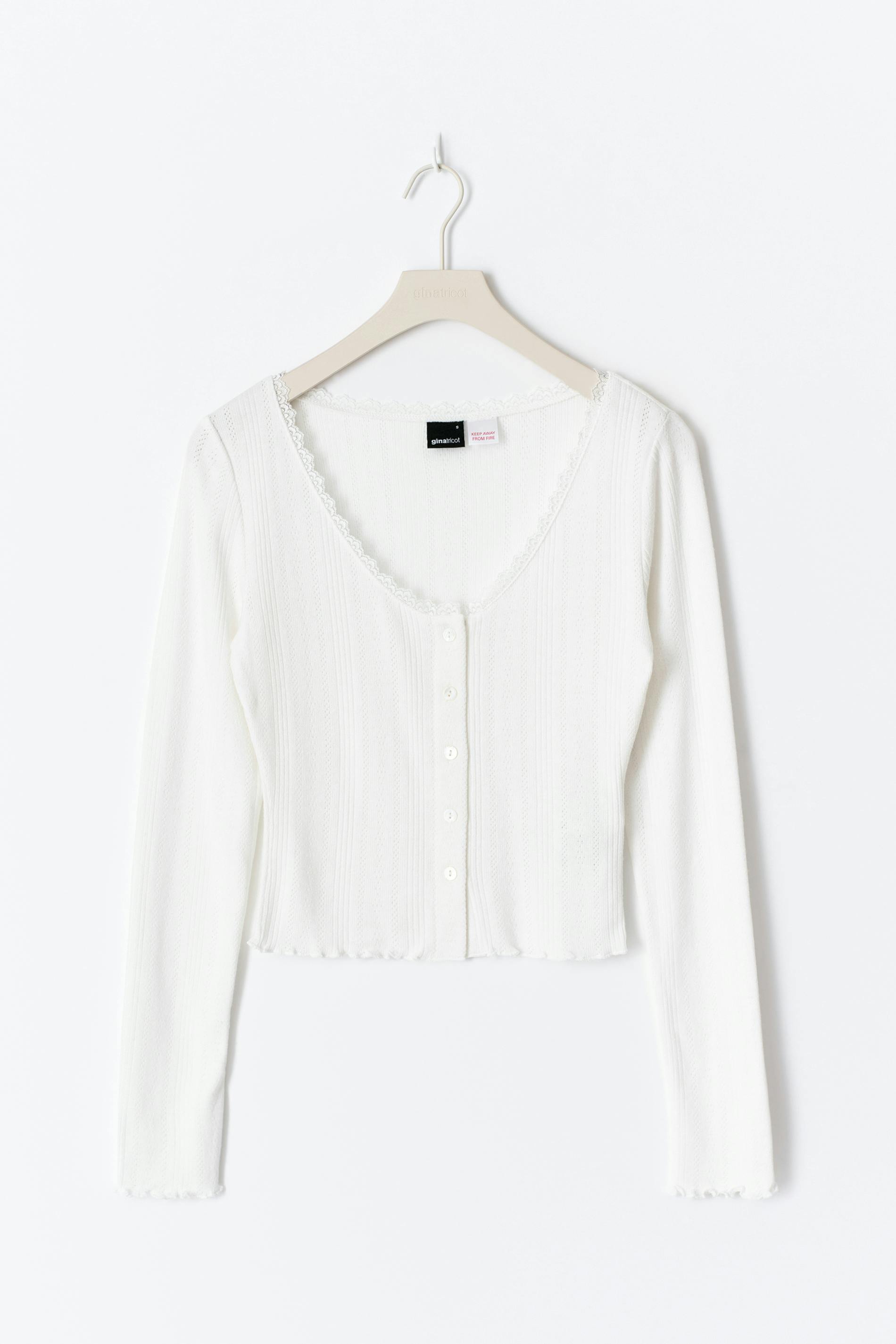Långärmad topp i pointelle med knäppning framtill. Toppen är krämfärgad och har en u-ringning. Den har en normal passform.