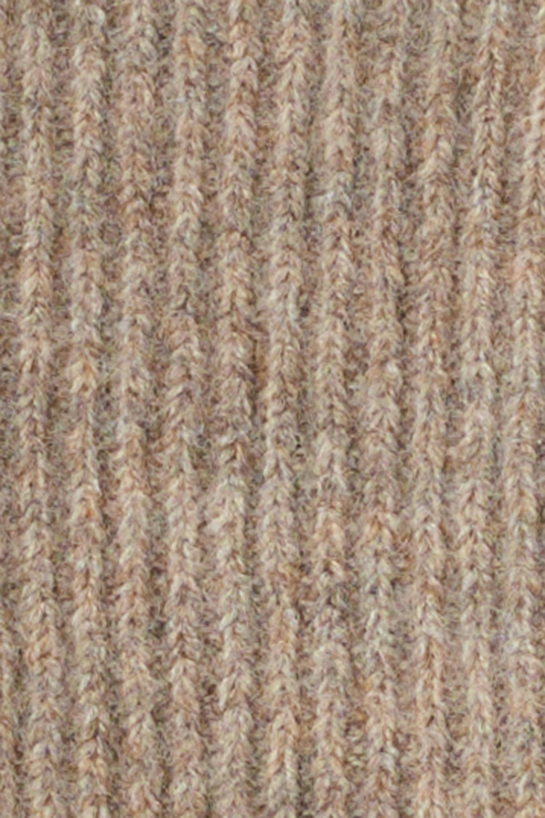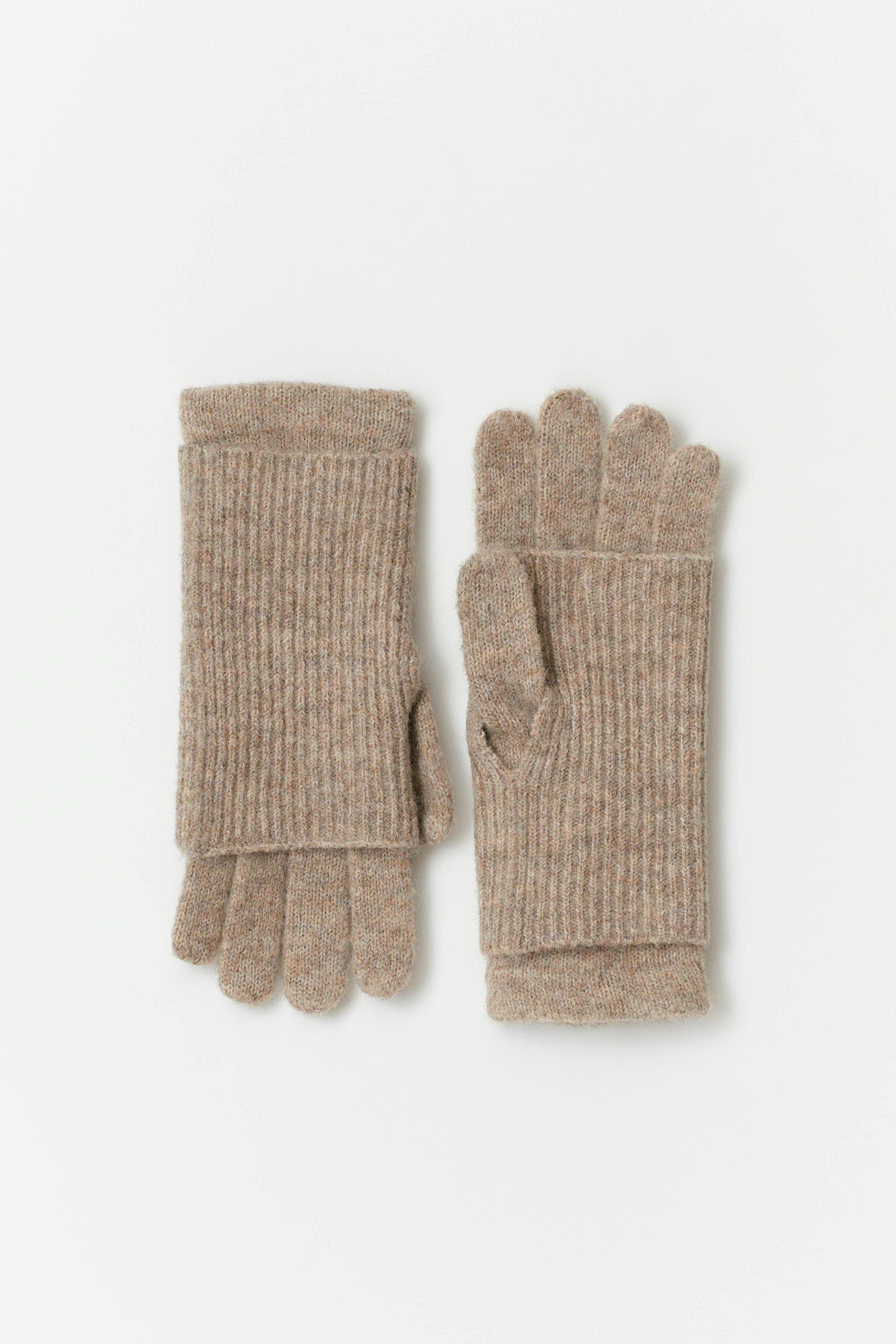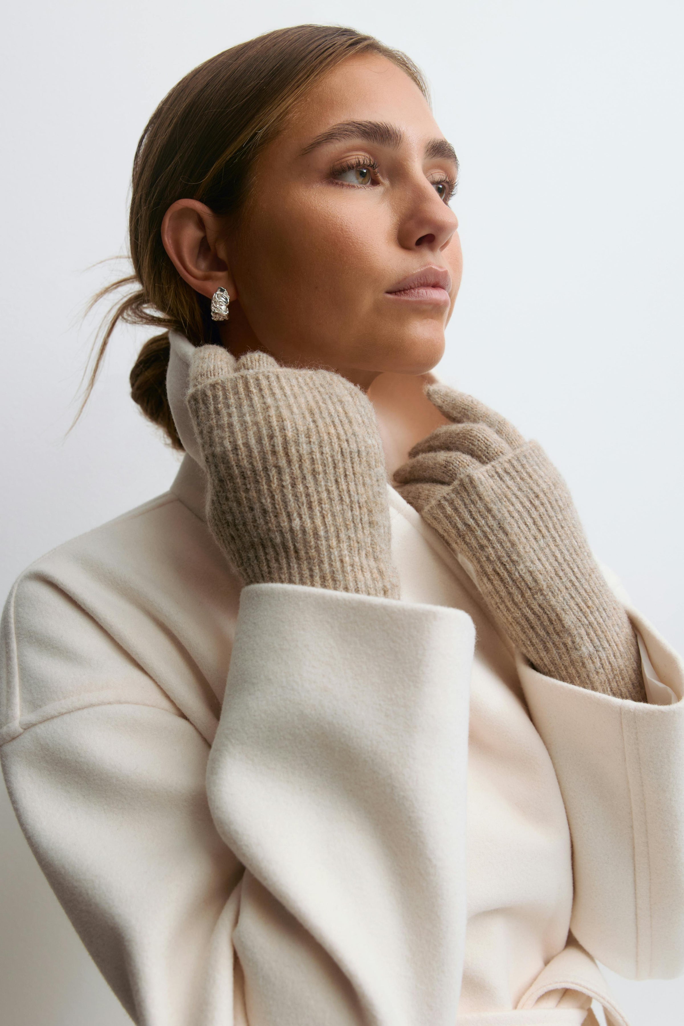 Stickade fingervantar med extra lång, uppvikt mudd. Fingervantarna är beigea.