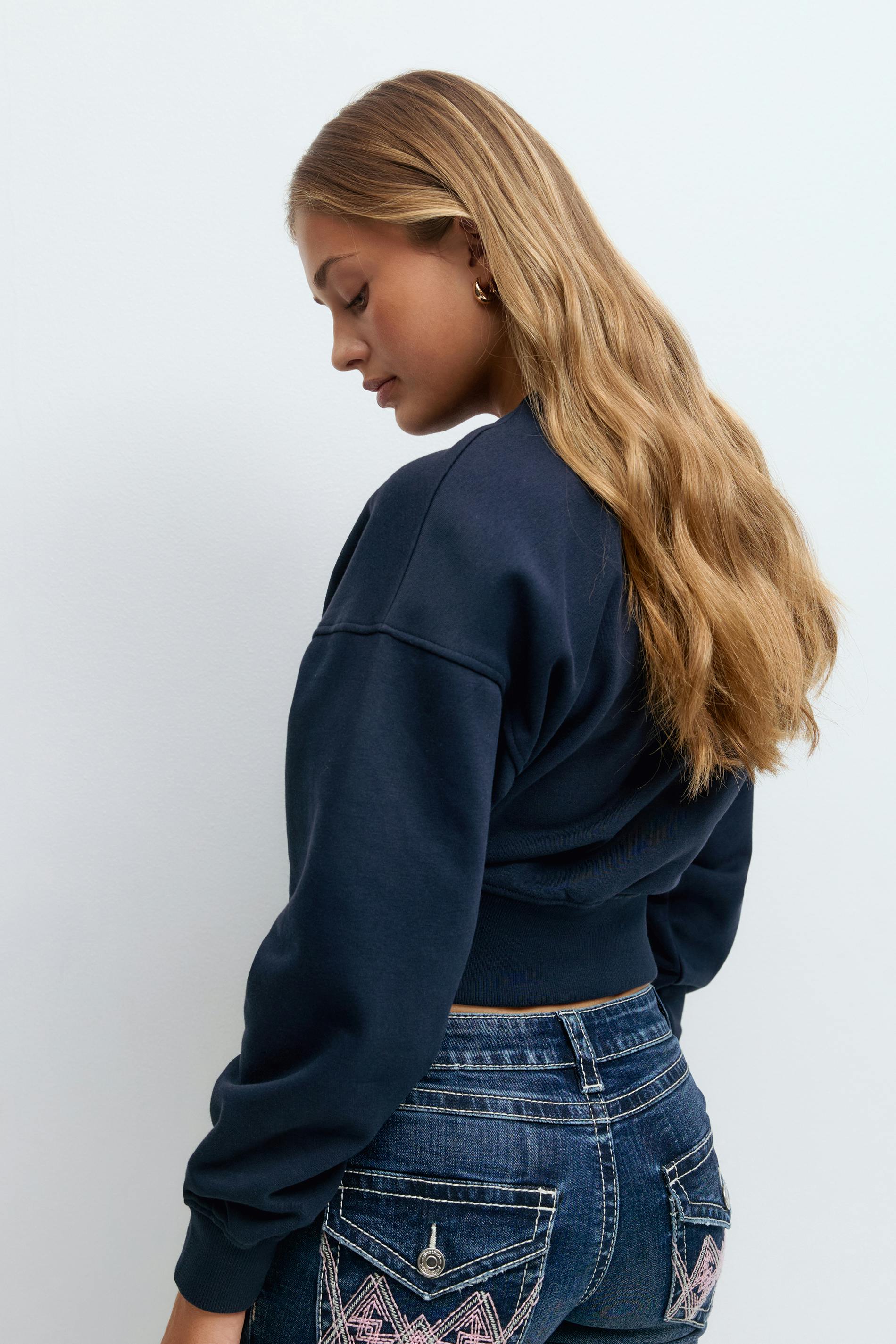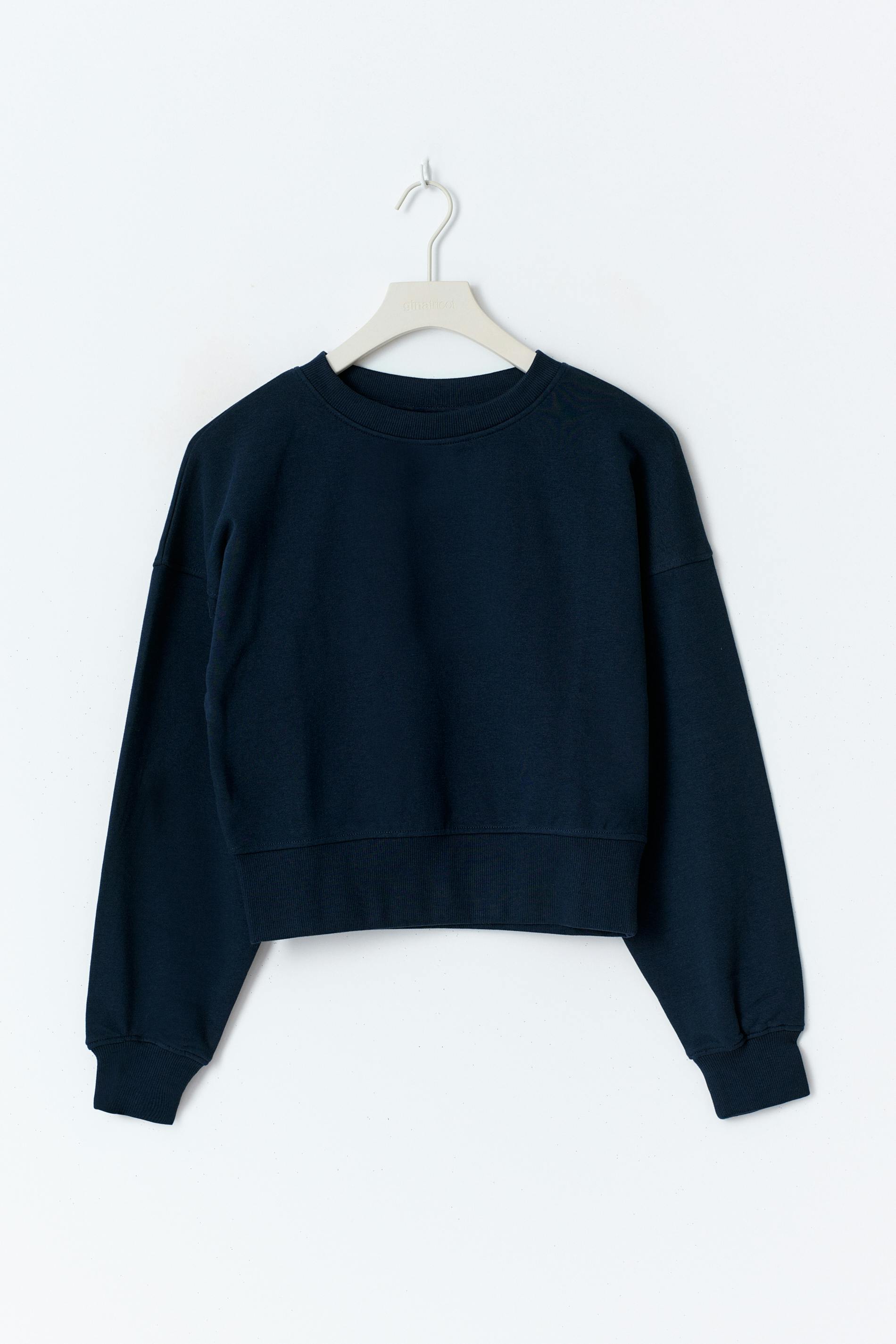 Croppad tröja med lös passform. Tröjan är marinblå och har rund halsringning. Den har långa ärmar, nedhasade axlar och ribbad mudd vid ärmslut och i nederkant.