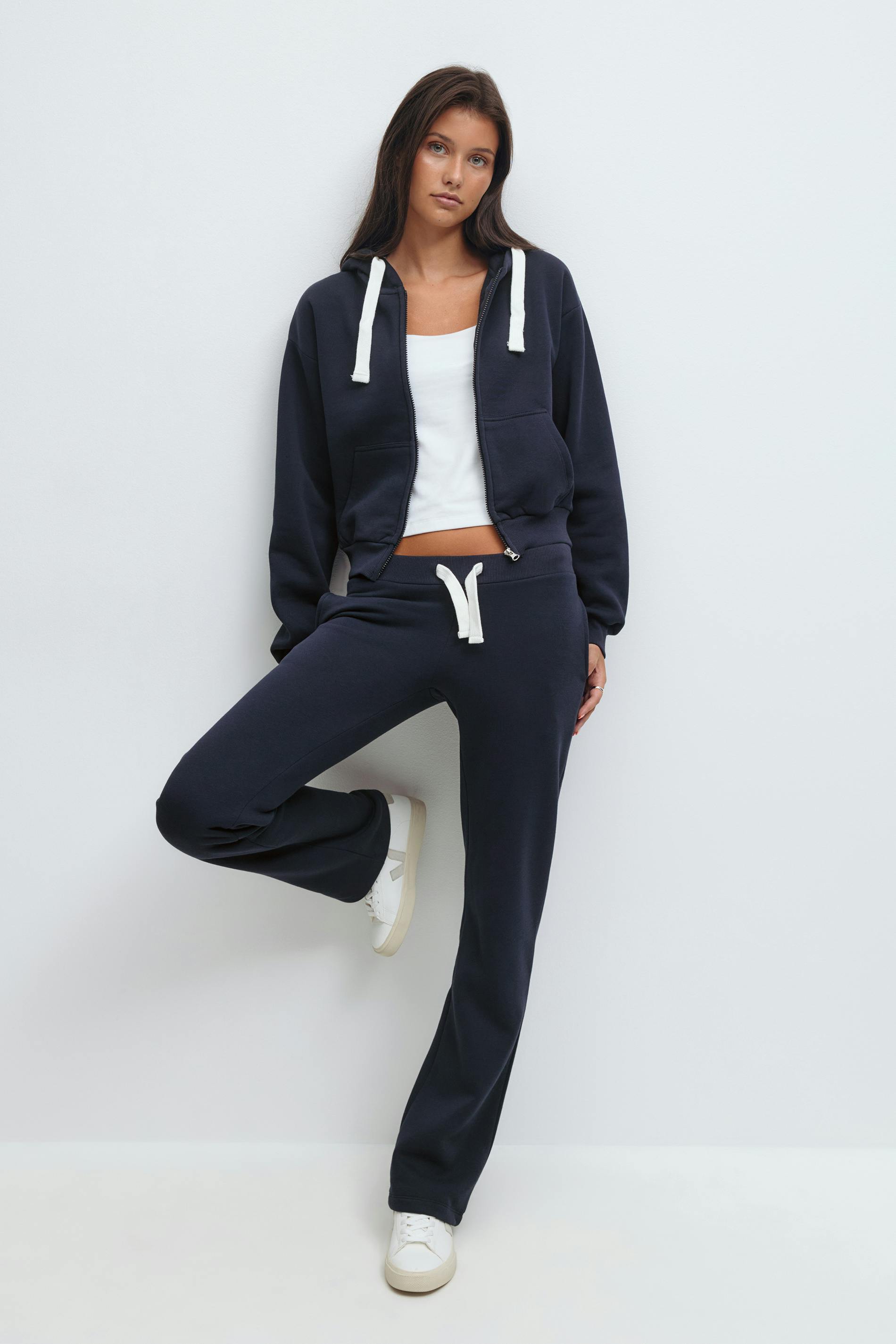 Lågmidjade mjukisbyxor med bakfickor. Byxorna är marinblåa och har justerbara knytband framtill. De har vida ben, fickor i sidorna, resår i midjan och normal passform.