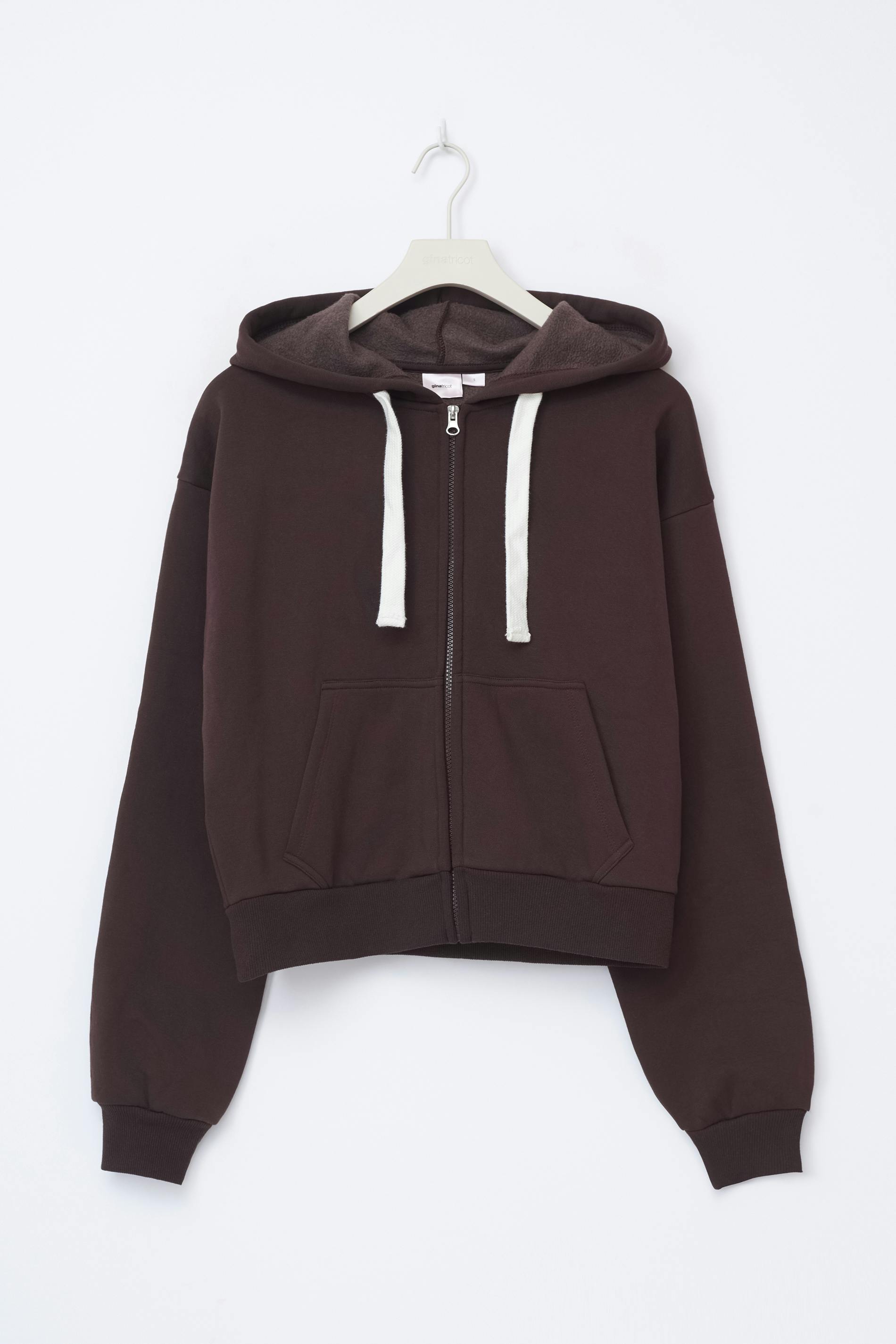 Huvtröja med dragkedja fram. Tröjan är svart och har huva med dragsko. Den har fickor framtill, ribbad mudd vid ärmslut och i nederkant, mjukt tyg och generös passform.