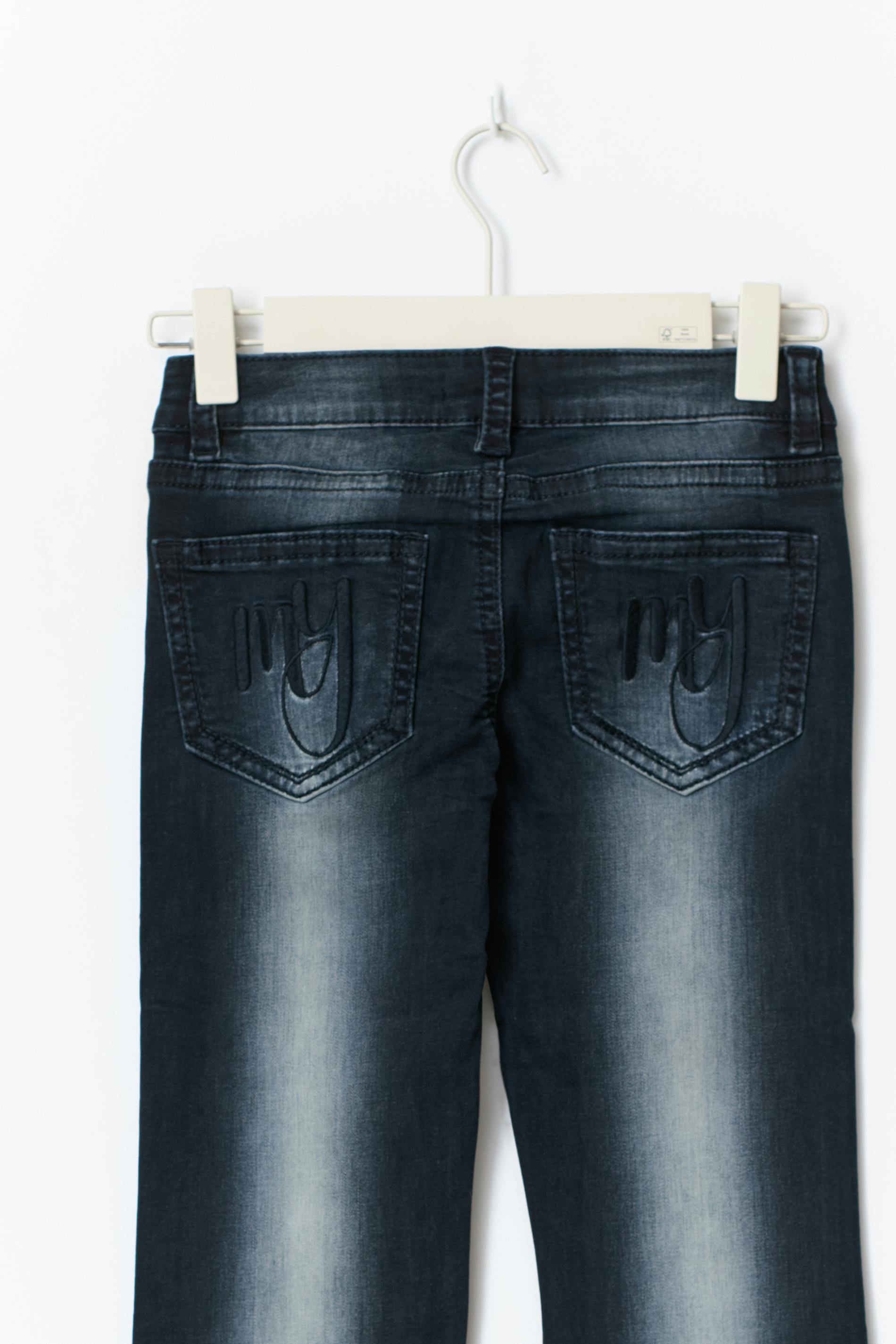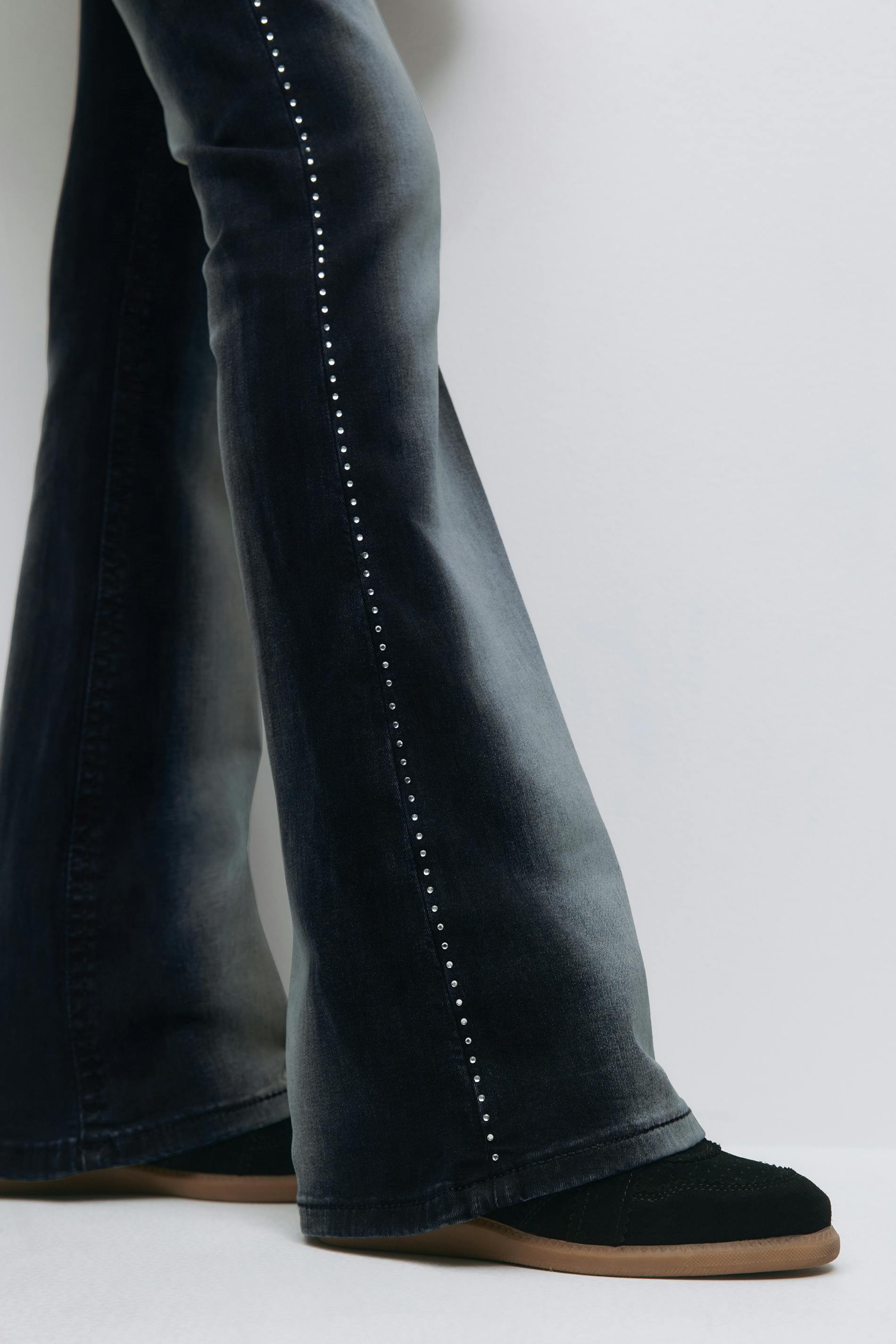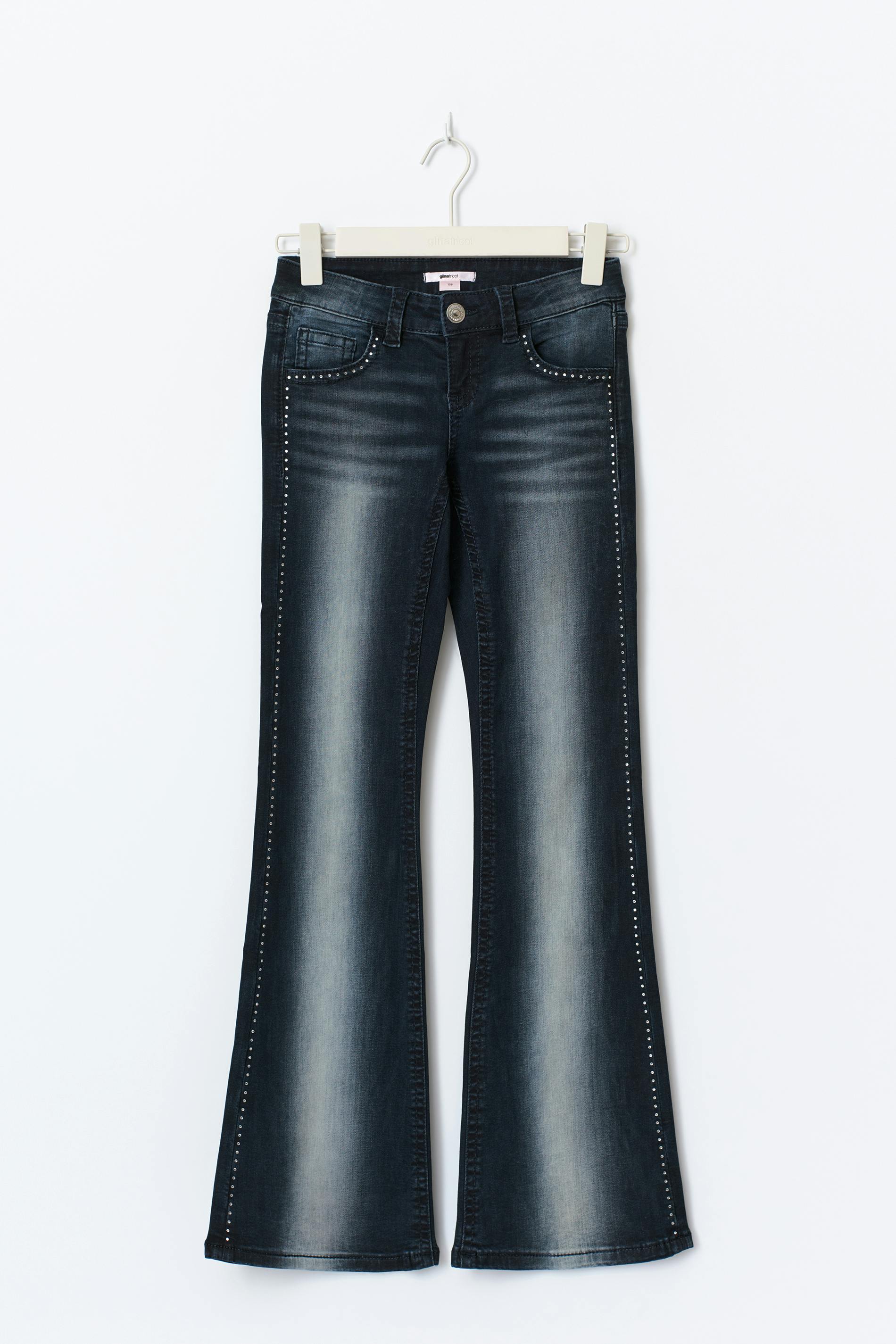 Flare jeans med strass på sidan av låret. Jeansen är mörkblåa och har låg midja. De har bälteshällor, bakfickor, framfickor, justerbar resår i midjan, en dragkedjestängning och en normal passform.