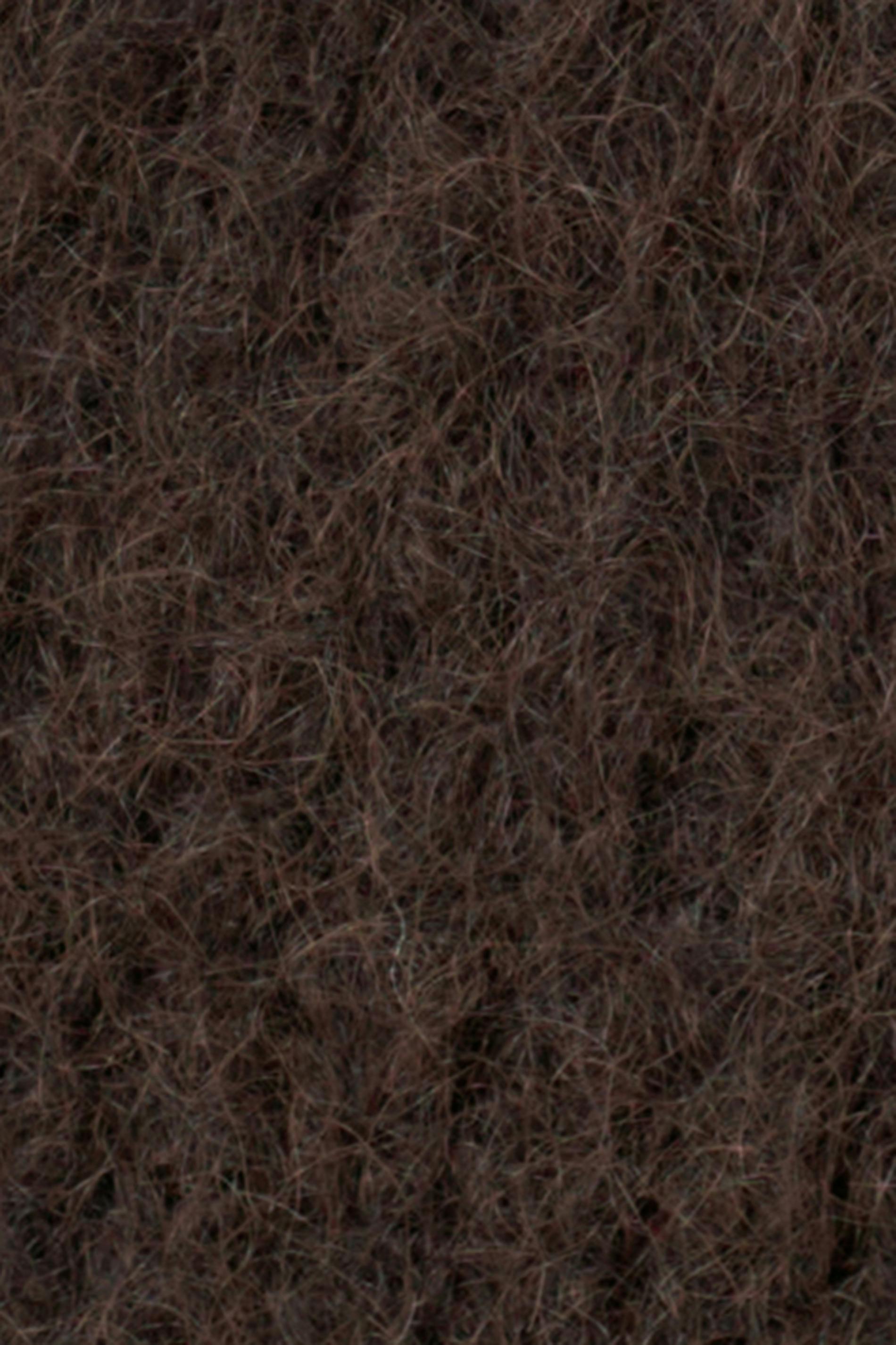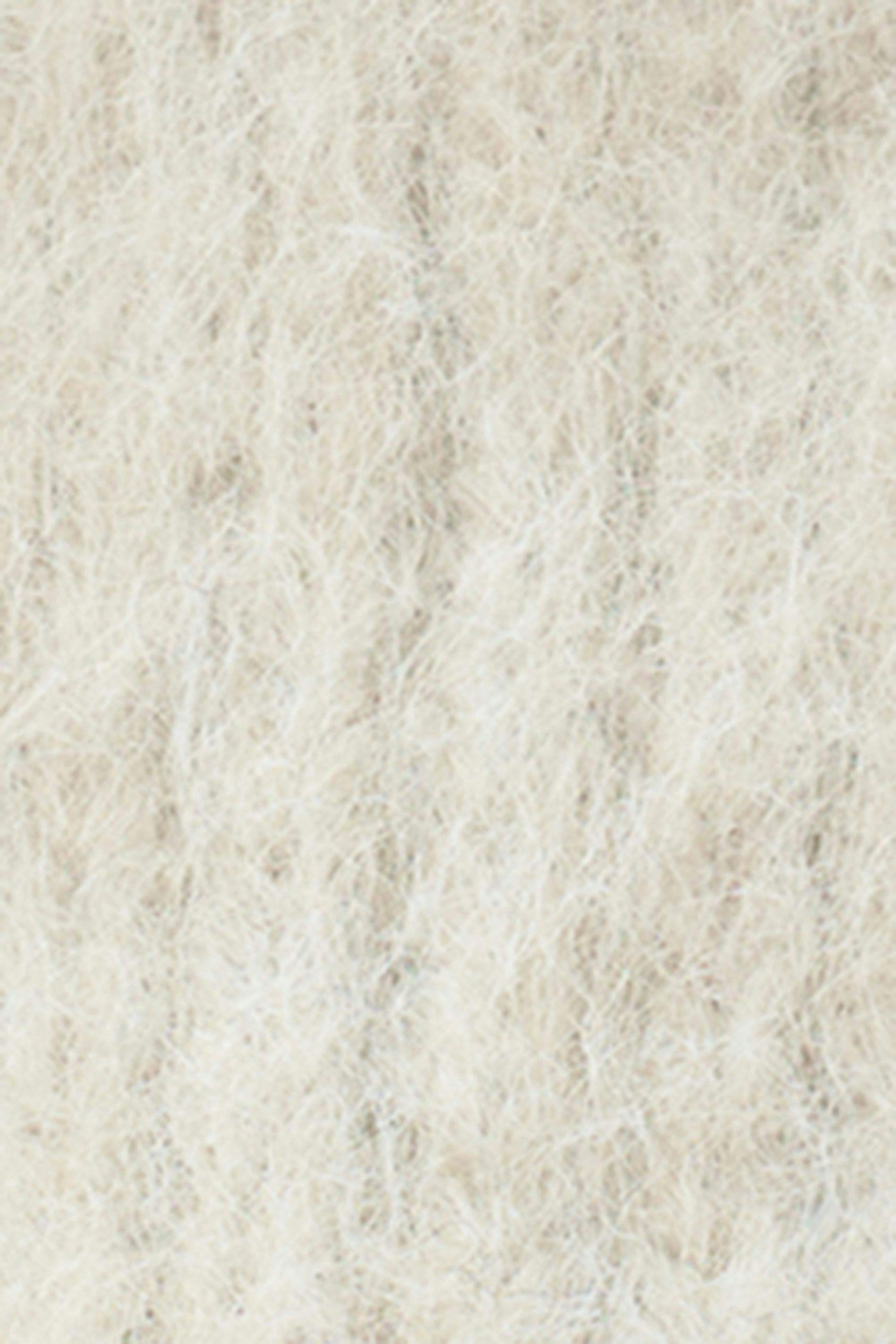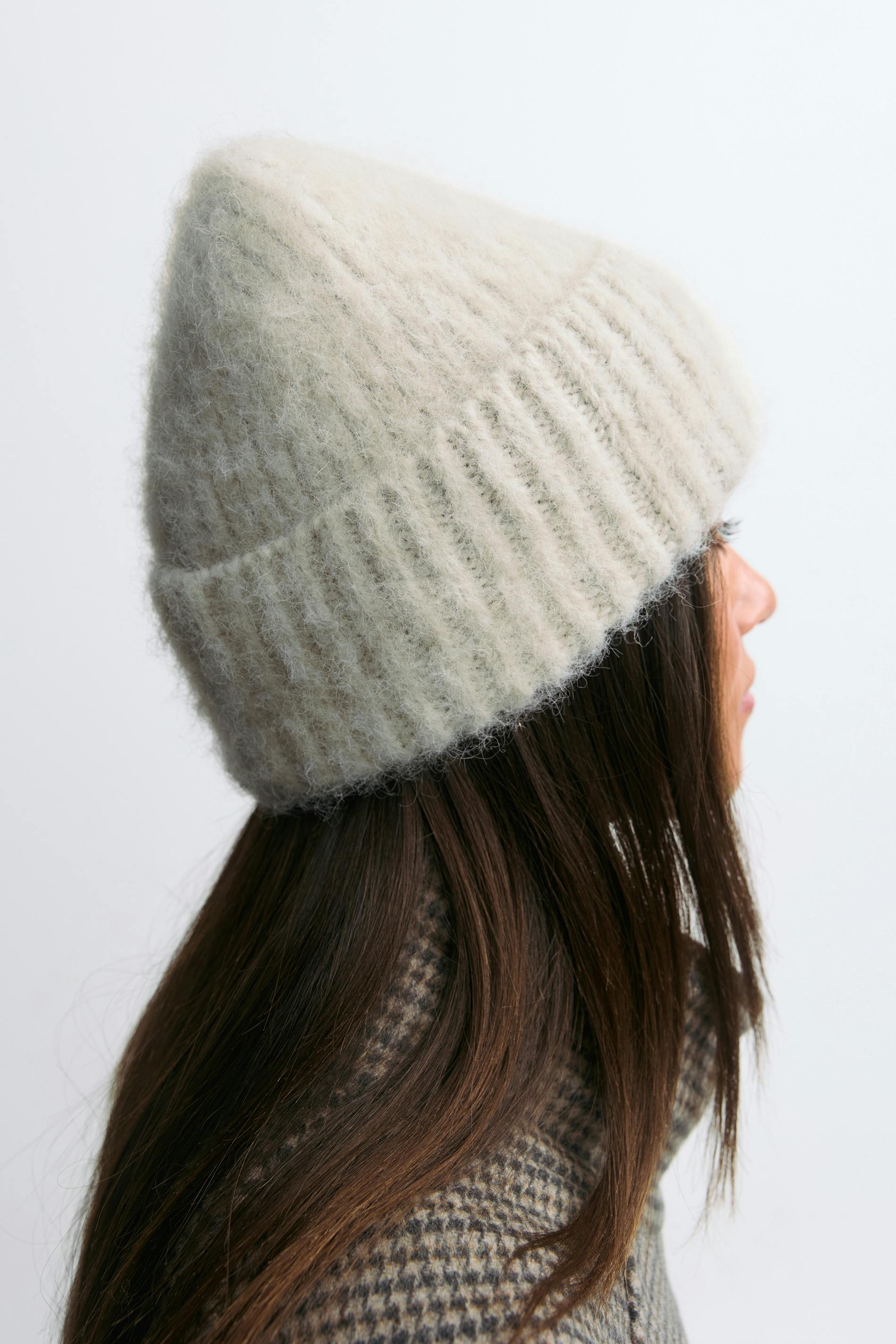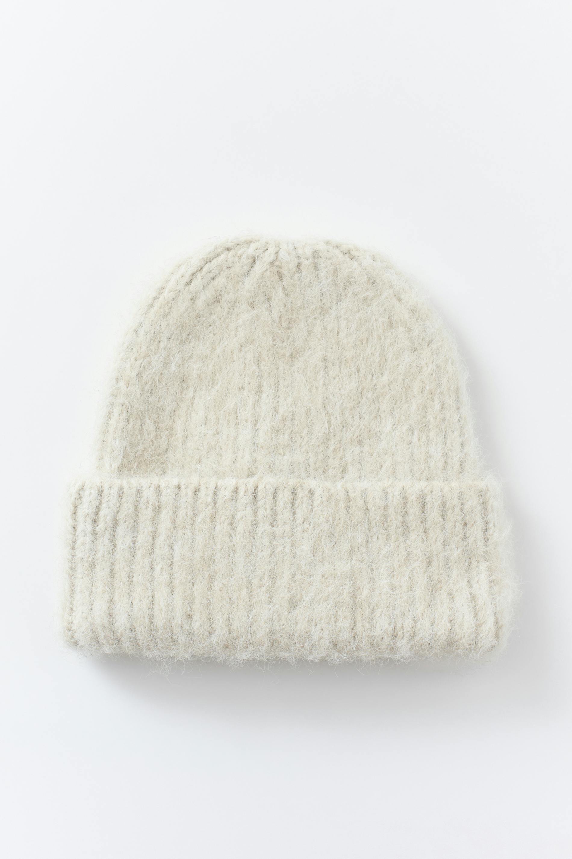 Ribbstickad mössa med bred, uppvikt kant. Hatten är vit och har fluffig kvalitet.