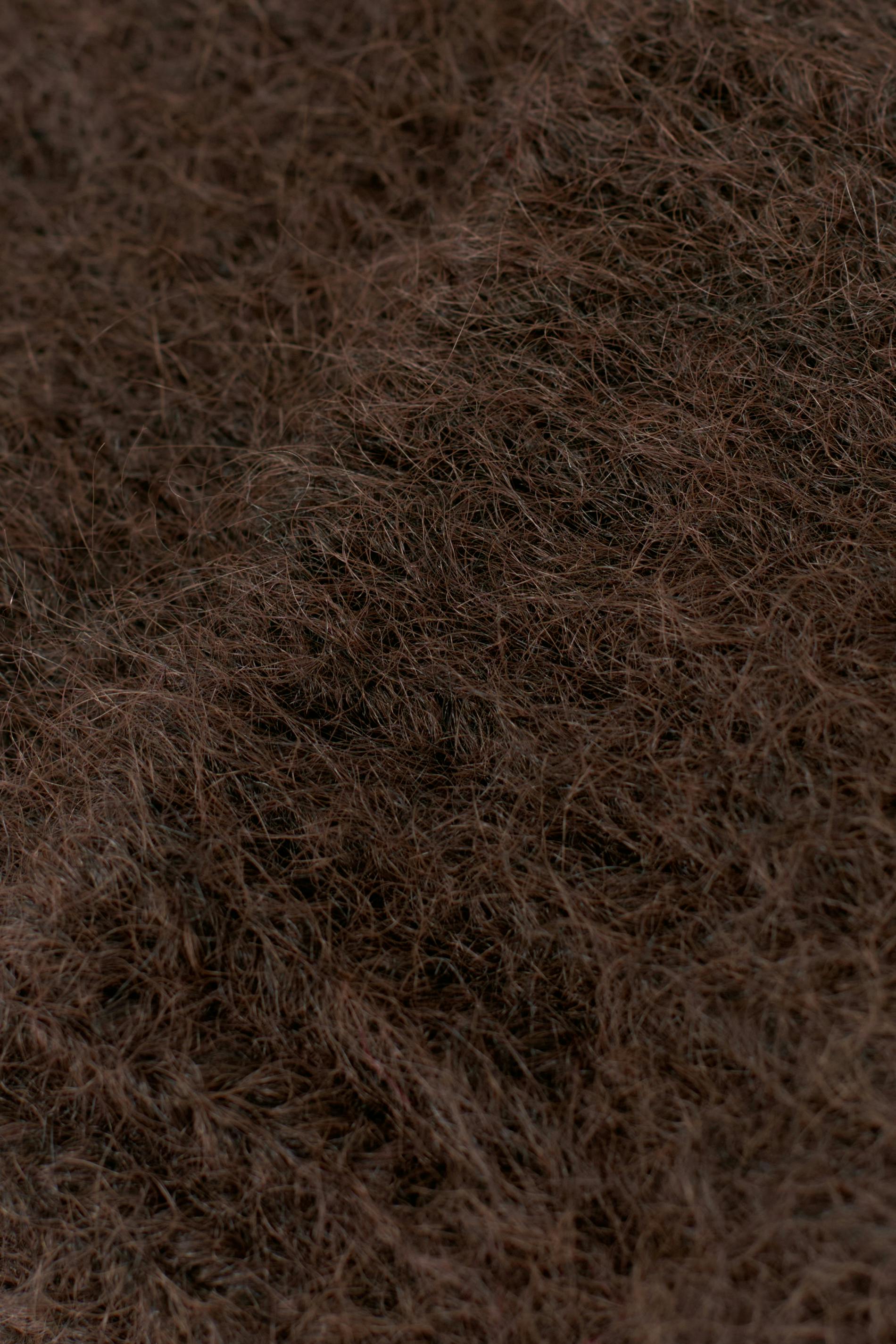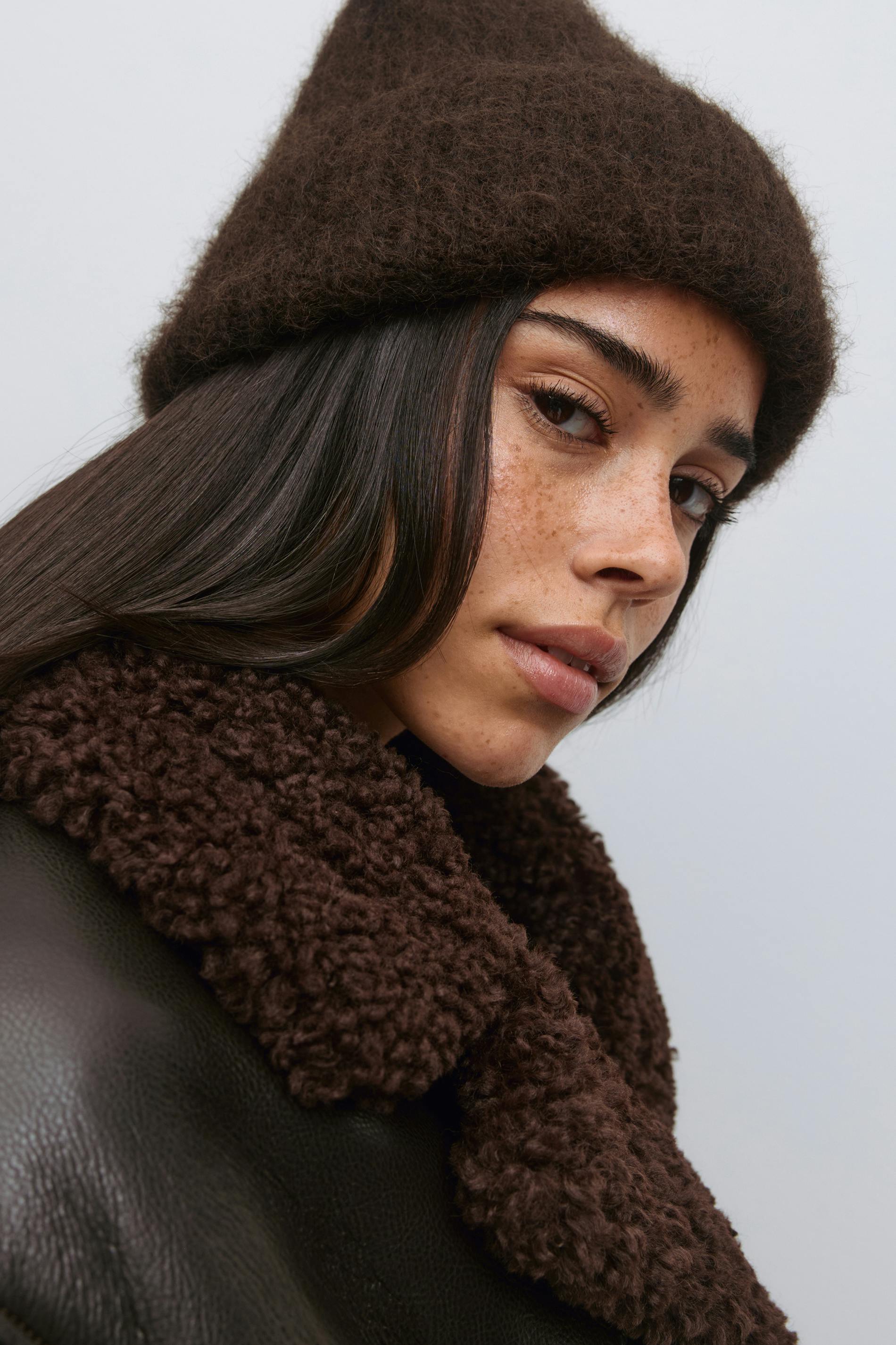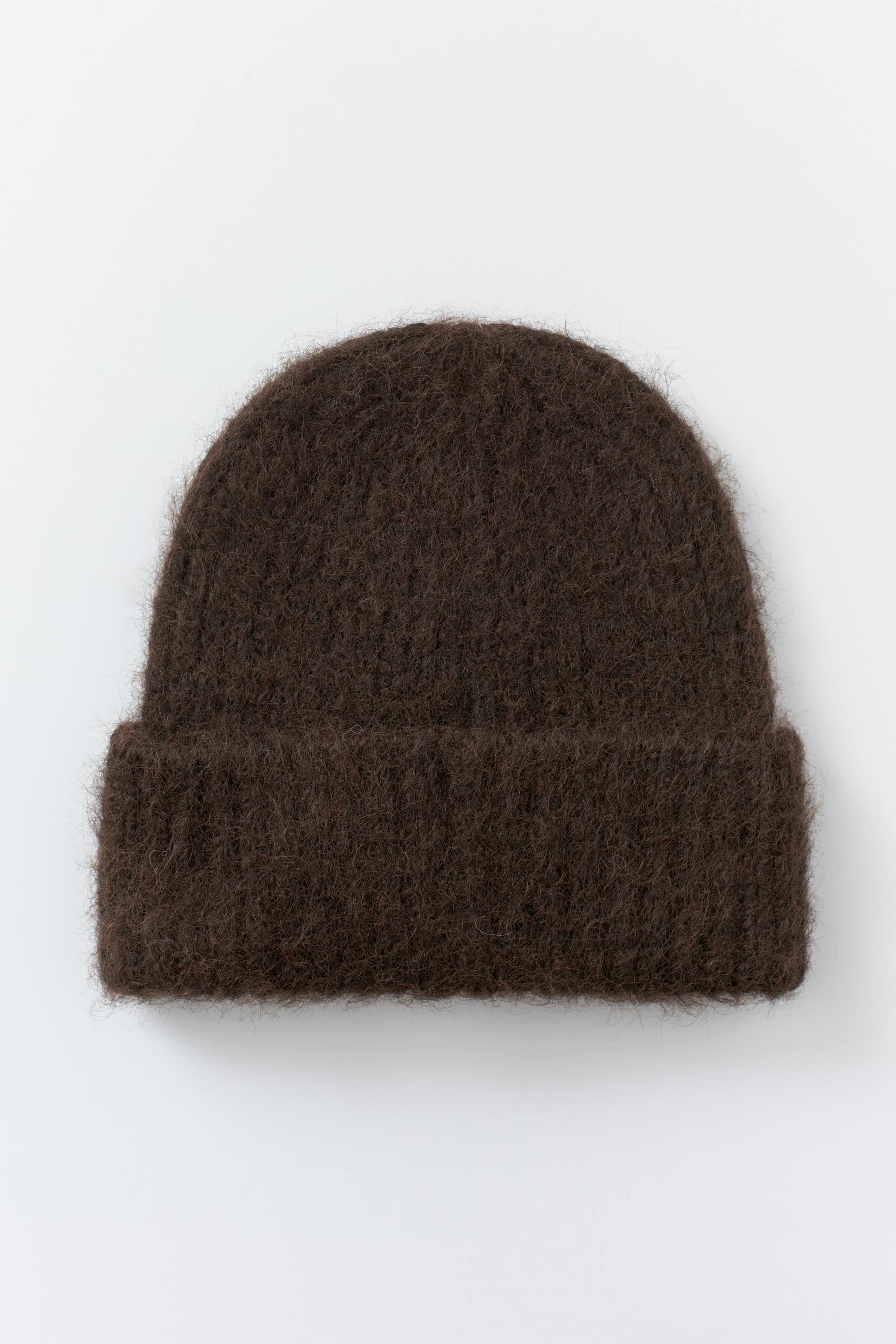 Ribbstickad mössa med bred, uppvikt kant. Hatten är brun och har fluffig kvalitet.