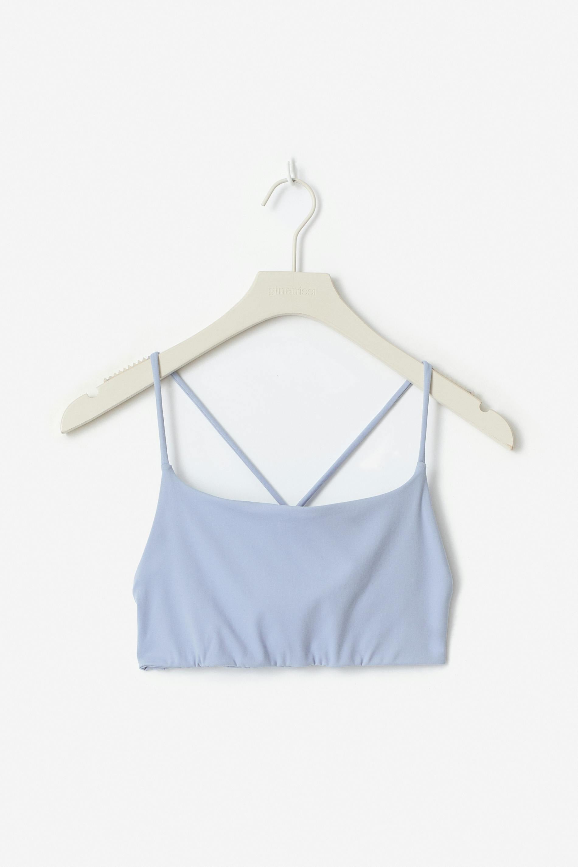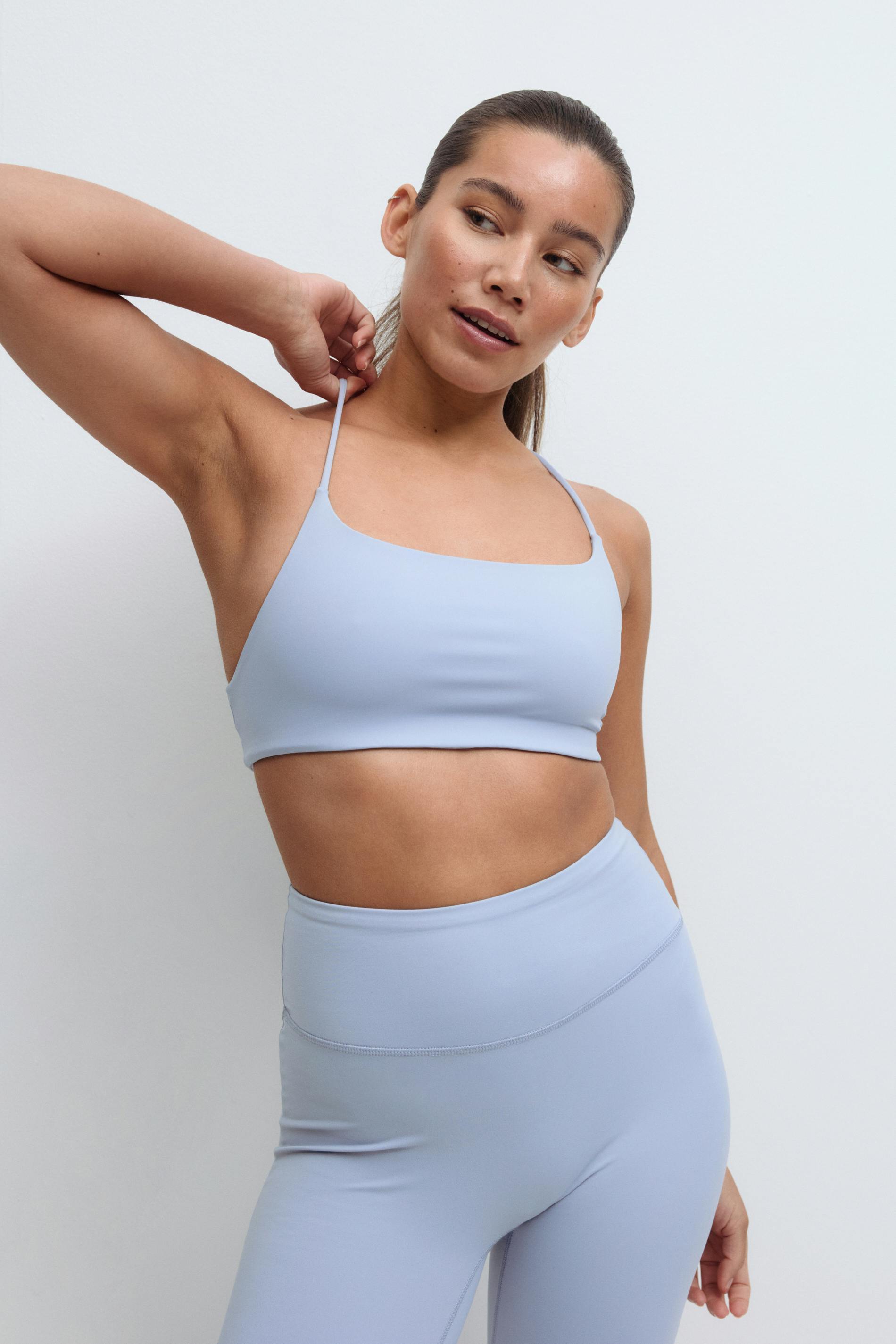 Mjuk sport-bh med en rund halsringning. BH:n är ljusblå och har korsade axelband i ryggen.